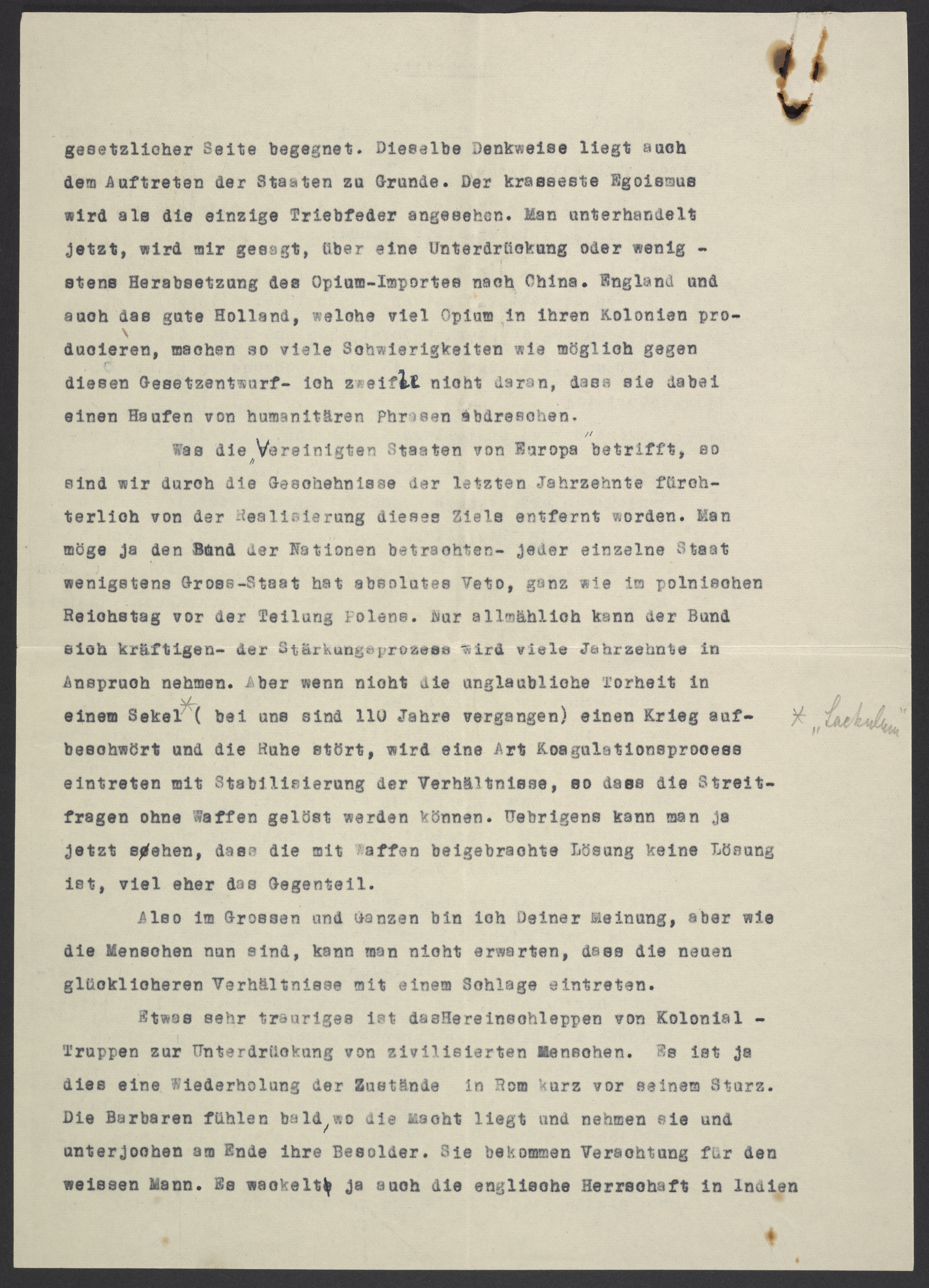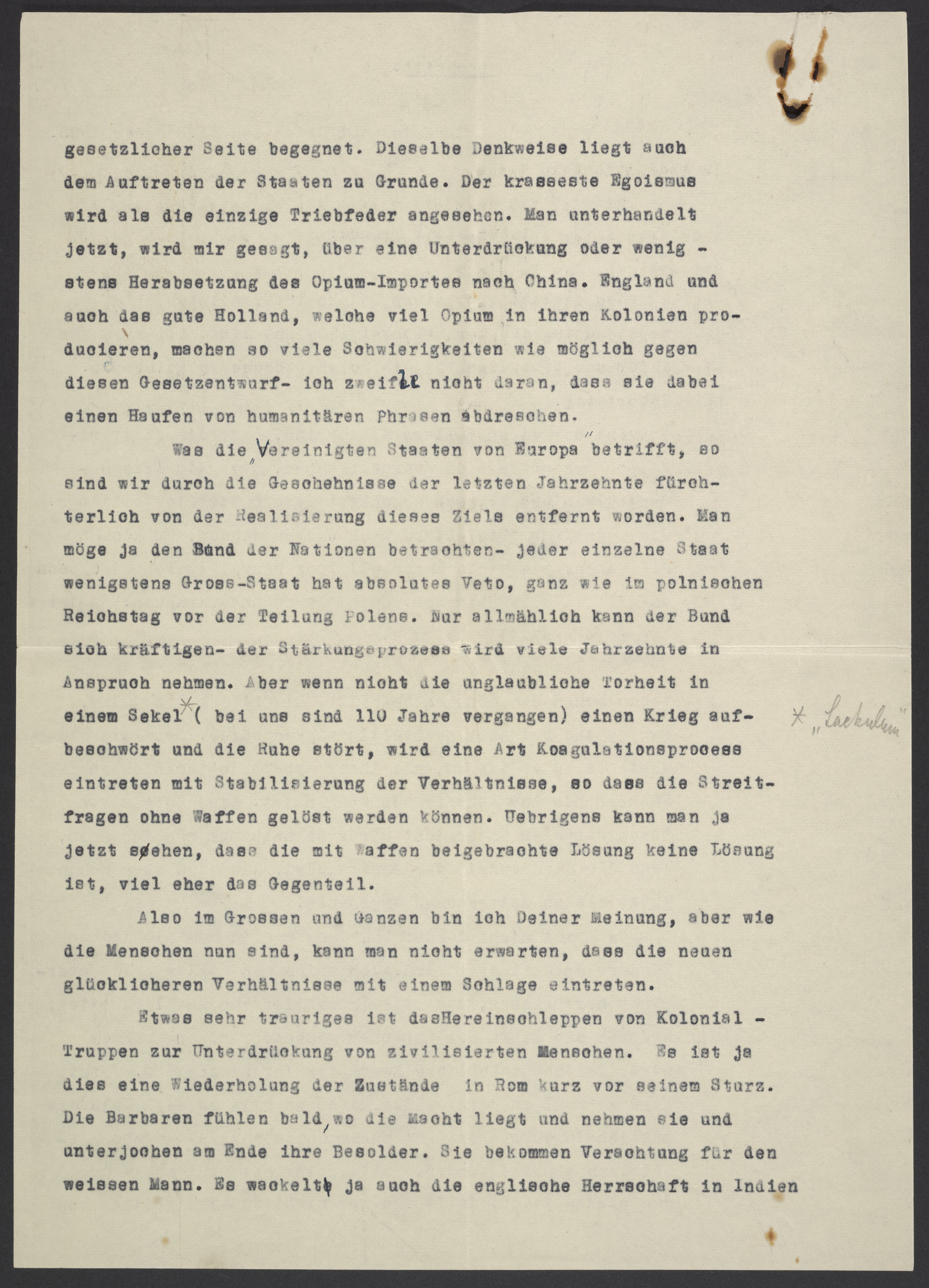 Was die Vereinigten Staaten von Europa betrifft, so sind wir durch Geschehnisse der letzten Jahrzente fürchterlich von der Realisierung dieses Ziels entfernt worden. Man möge ja den Bund der Nationen betrachten – jeder einzelne Staat wenigsten Gross-Staat hat absolutes Veto, ganz wie im polnischen Reichstag vor der Teilung Polens. Nur allmählich kann der Bund sich kräftigen – der Stärkungsprozess wird viele Jahrzehnte in Anspruch nehmen. Aber wenn nicht die unglaubliche Torheit in einem Sekel*["Säkulum"] (bei uns sind 110 Jahre vergangen) einen Krieg aufbeschwört und die Ruhe stört, wird eine Art Koagulationsprocess eintreten mit Stabilisierung der Verhältnisse, so dass die Streitfragen ohne Waffen gelöst werden können. Uebrigens kann man ja jetzt sehen, dass die mit Waffen beigebrachte Lösung keine Lösung ist, viel eher das Gegenteil.