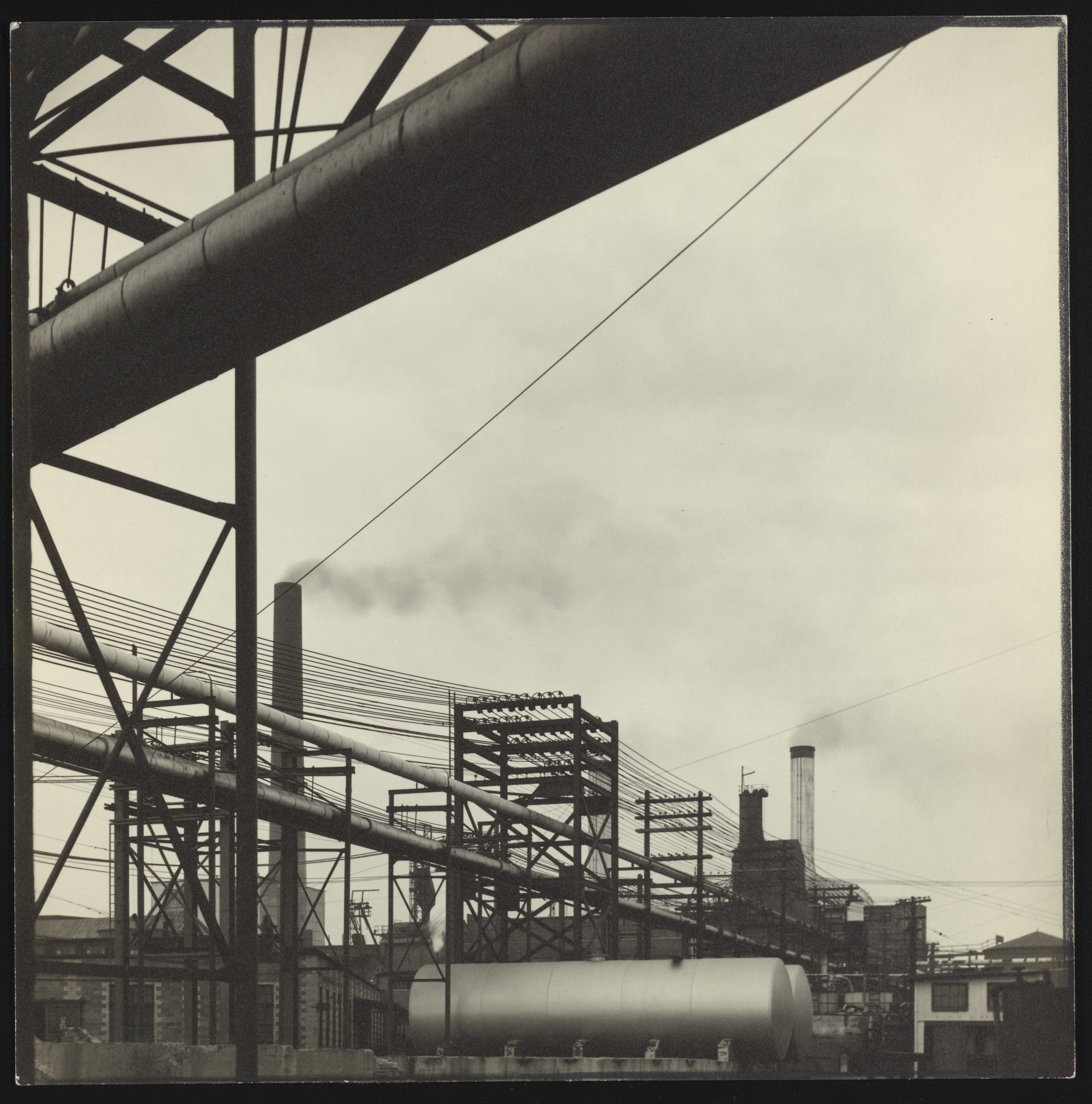 General view of a section of the exterior of the Cliffs Dow wood distillation plant located in Marquette, Michigan. Seeking a source of raw material for its new plastic, ethylcellulose, the Dow Chemical Company joined with the Cleveland-Cliffs Iron Company to form the Cliffs Dow Chemical Company in April 1935. The Cliffs Dow plant in Marquette primarily produced charcoal used in the manufacture of pig iron, as well as a range of chemical by-products including acetic acid, calcium acetate, wood alcohol, and ethyl alcohol. Notably, when the Marquette plant ceased operations in 1969, it was the last wood distillation plant in the United States.
