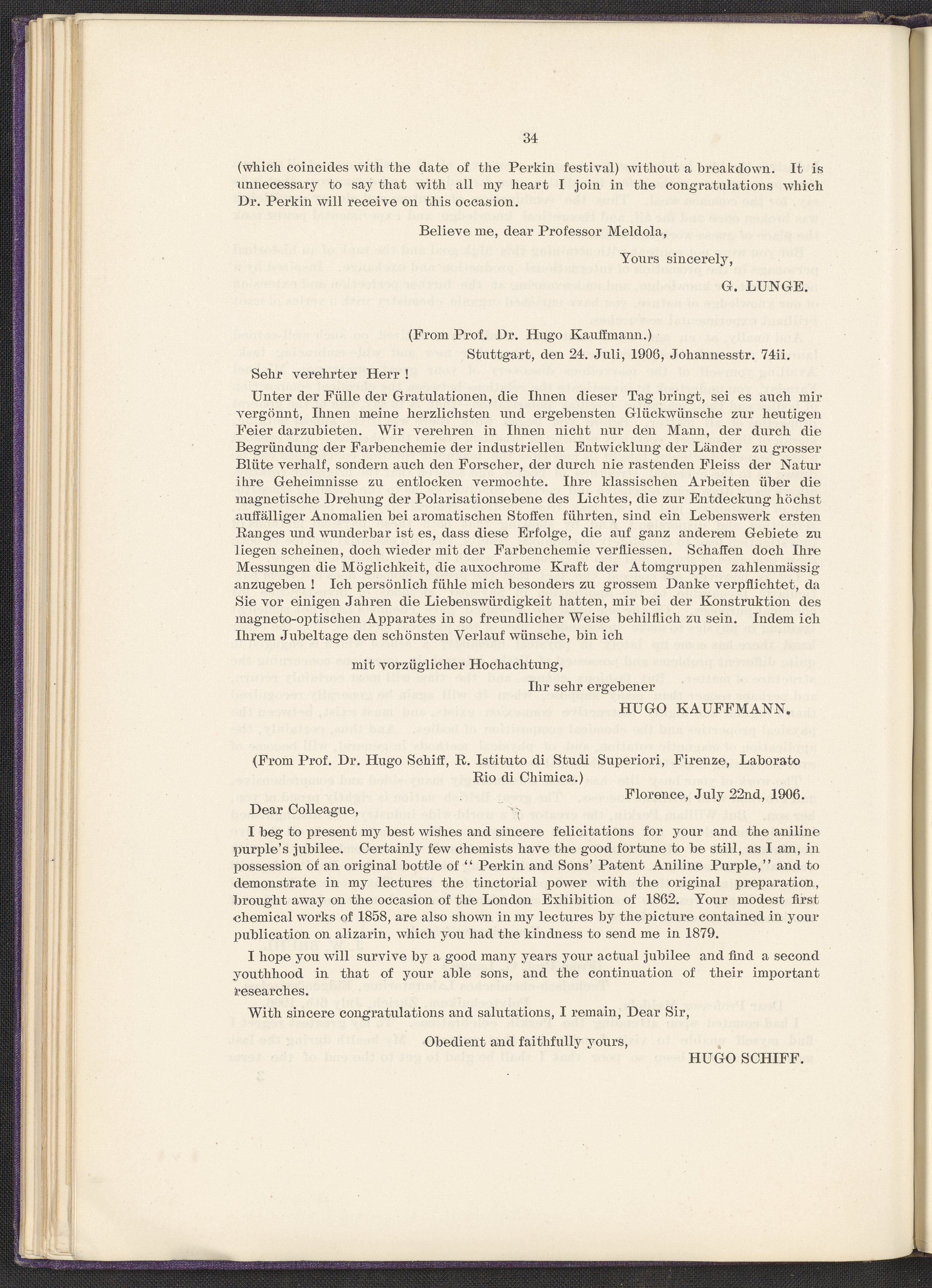 “Jubilee of the Discovery of Mauve and of the Foundation of the Coal-Tar Colour Industry.” London, England: Perkin Memorial Committee, 1906. TP914 .M45 1906. Science History Institute. Philadelphia. https://digital.sciencehistory.org/works/qi96034.