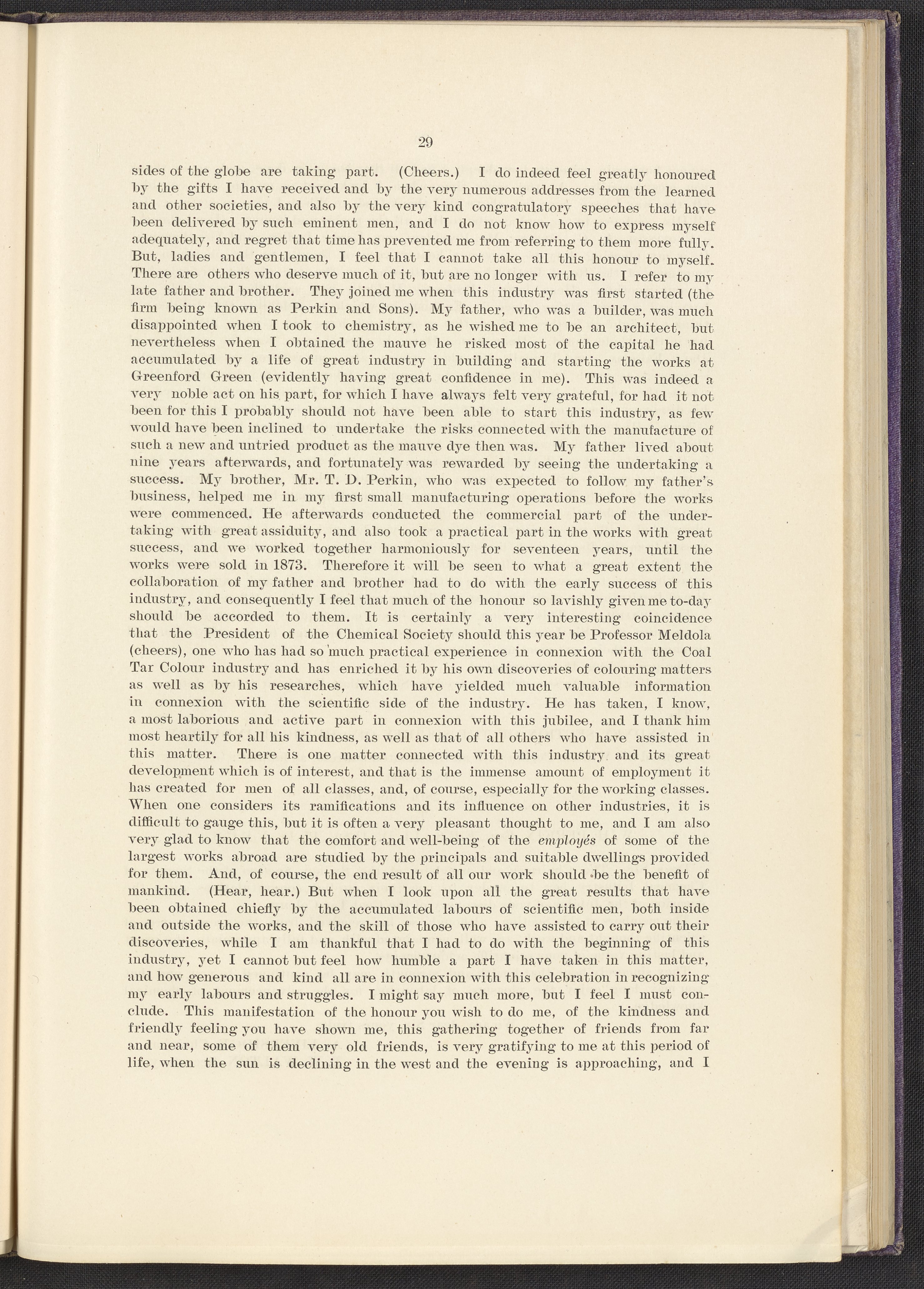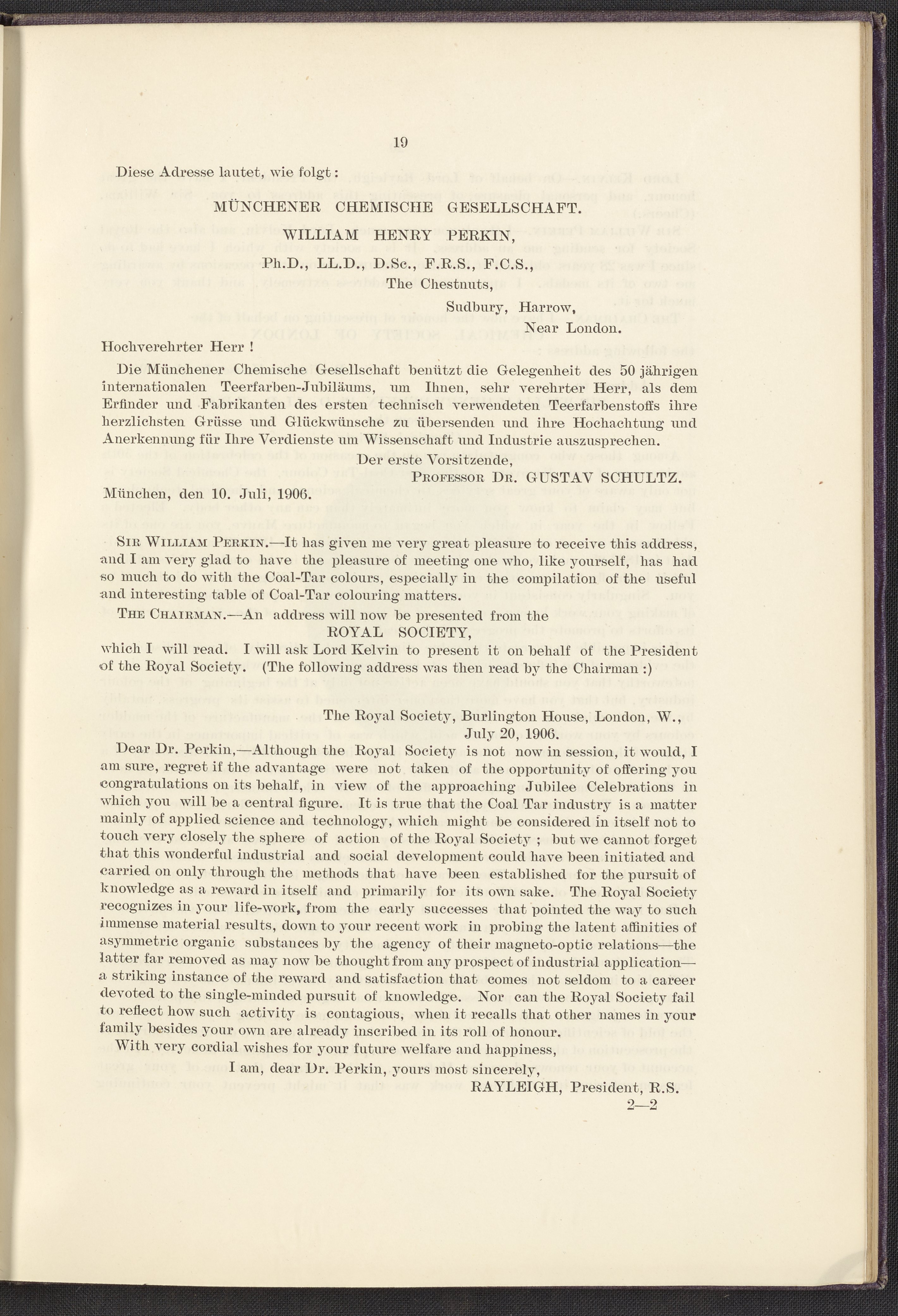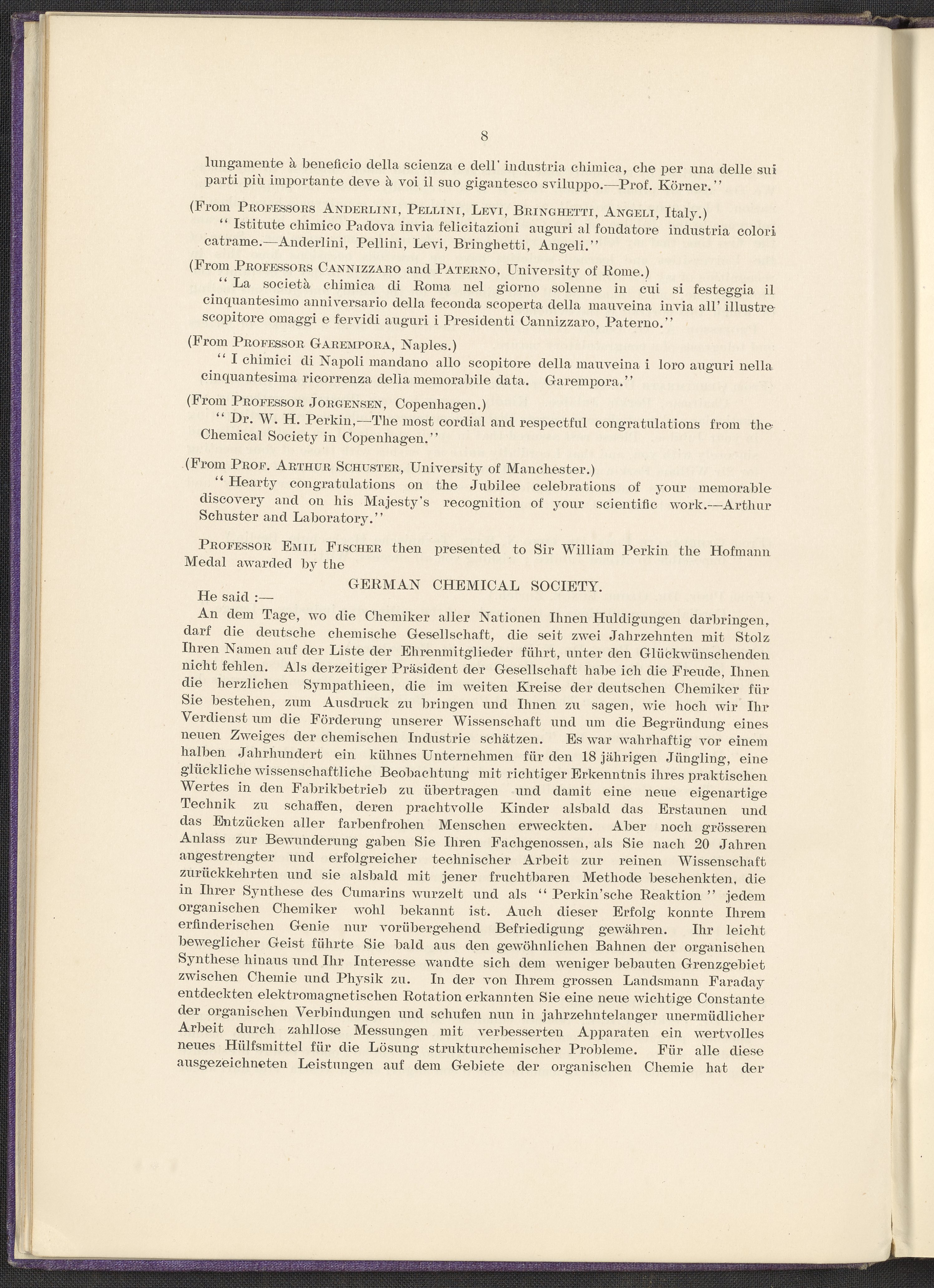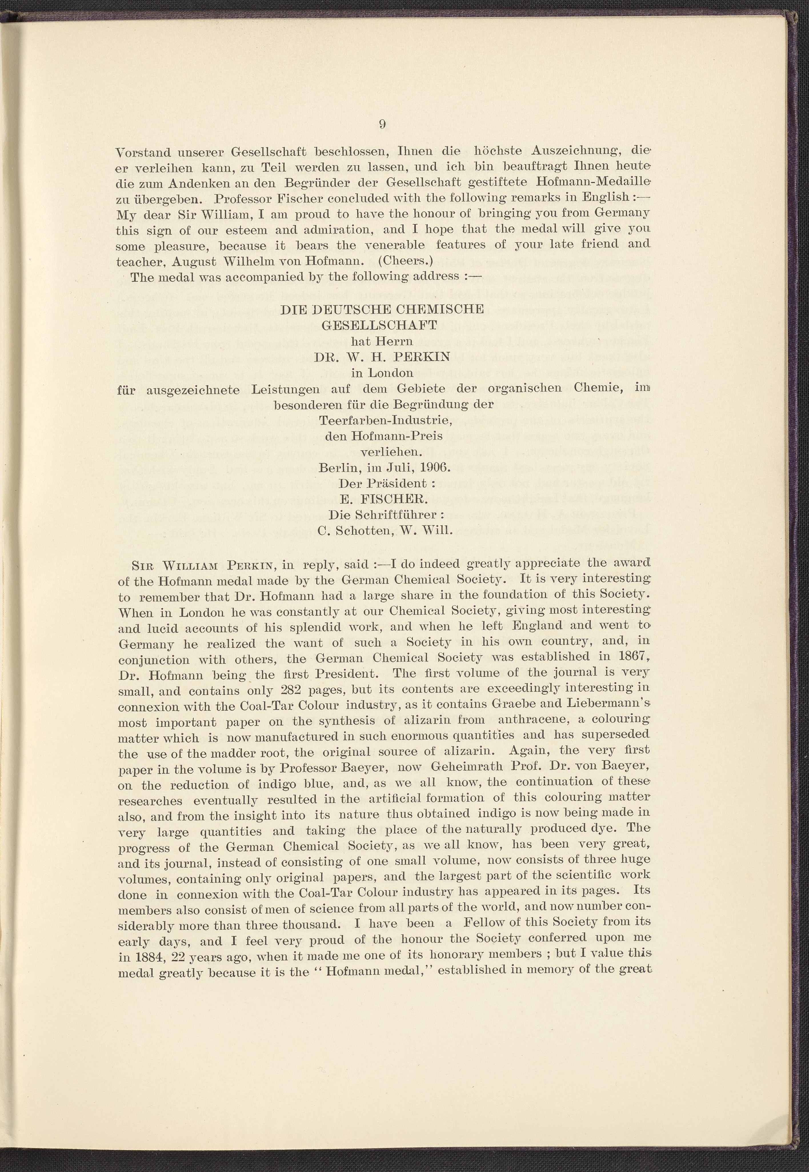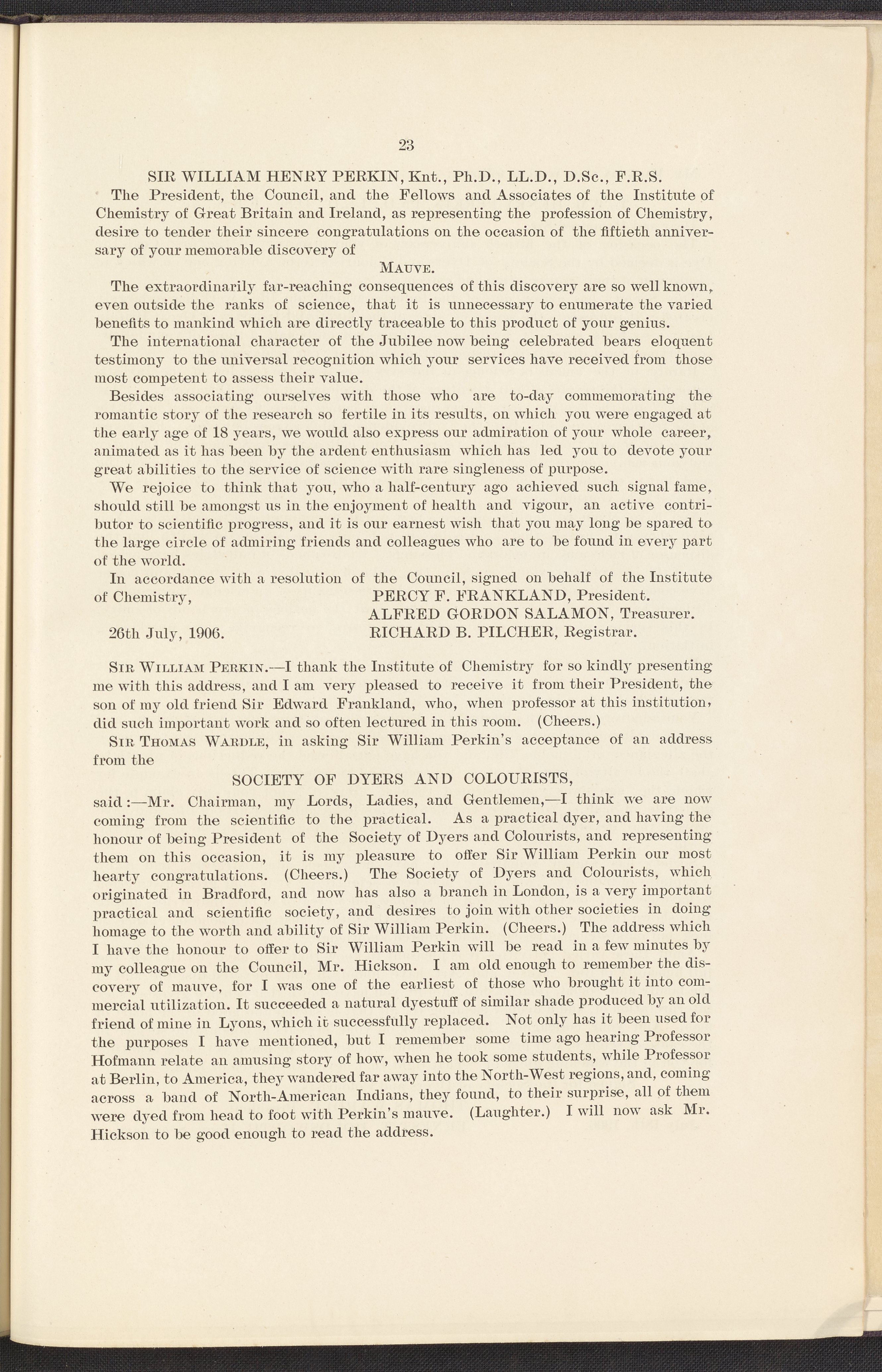 “Jubilee of the Discovery of Mauve and of the Foundation of the Coal-Tar Colour Industry.” London, England: Perkin Memorial Committee, 1906. TP914 .M45 1906. Science History Institute. Philadelphia. https://digital.sciencehistory.org/works/qi96034.