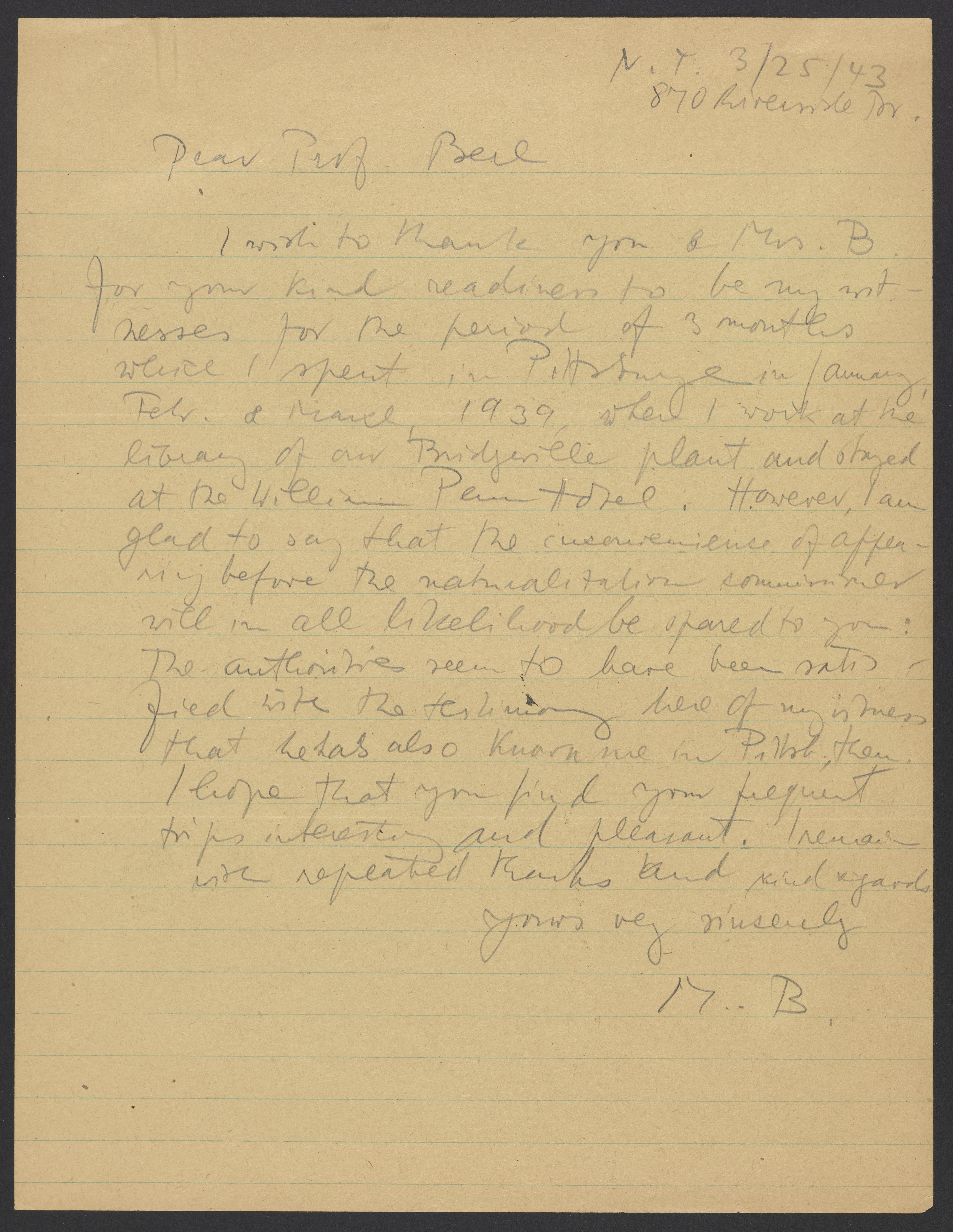 Max Albert Bredig (1902-1977) thanks Ernst Berl (1877-1946) for his being willing to be his witness for his citizenship petition.