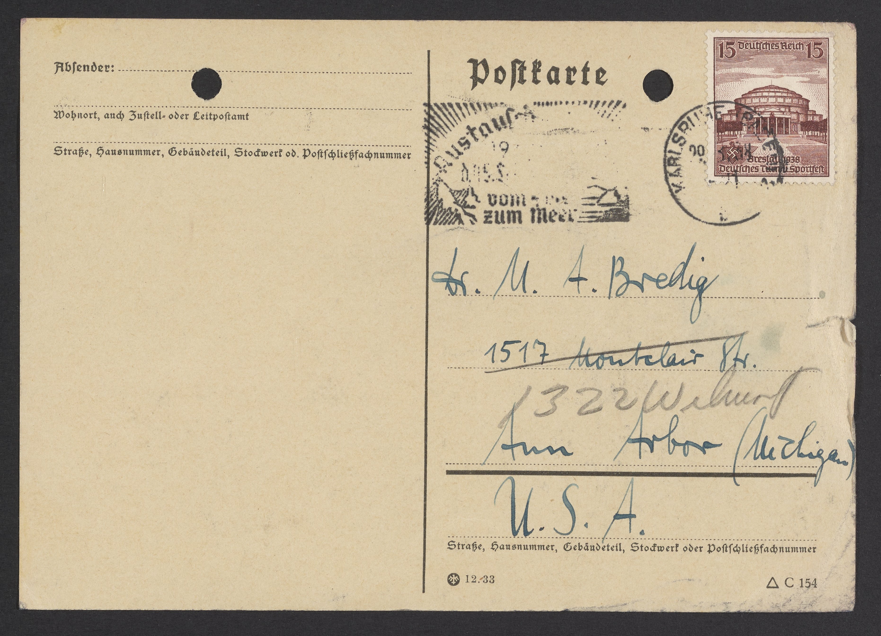 Homburger, Marianne. “Postcard from Marianne Homburger to Max Bredig, August 27, 1938,” August 27, 1938. Papers of Georg and Max Bredig, Box 8, Folder 21. Science History Institute. Philadelphia. https://digital.sciencehistory.org/works/qju866o.