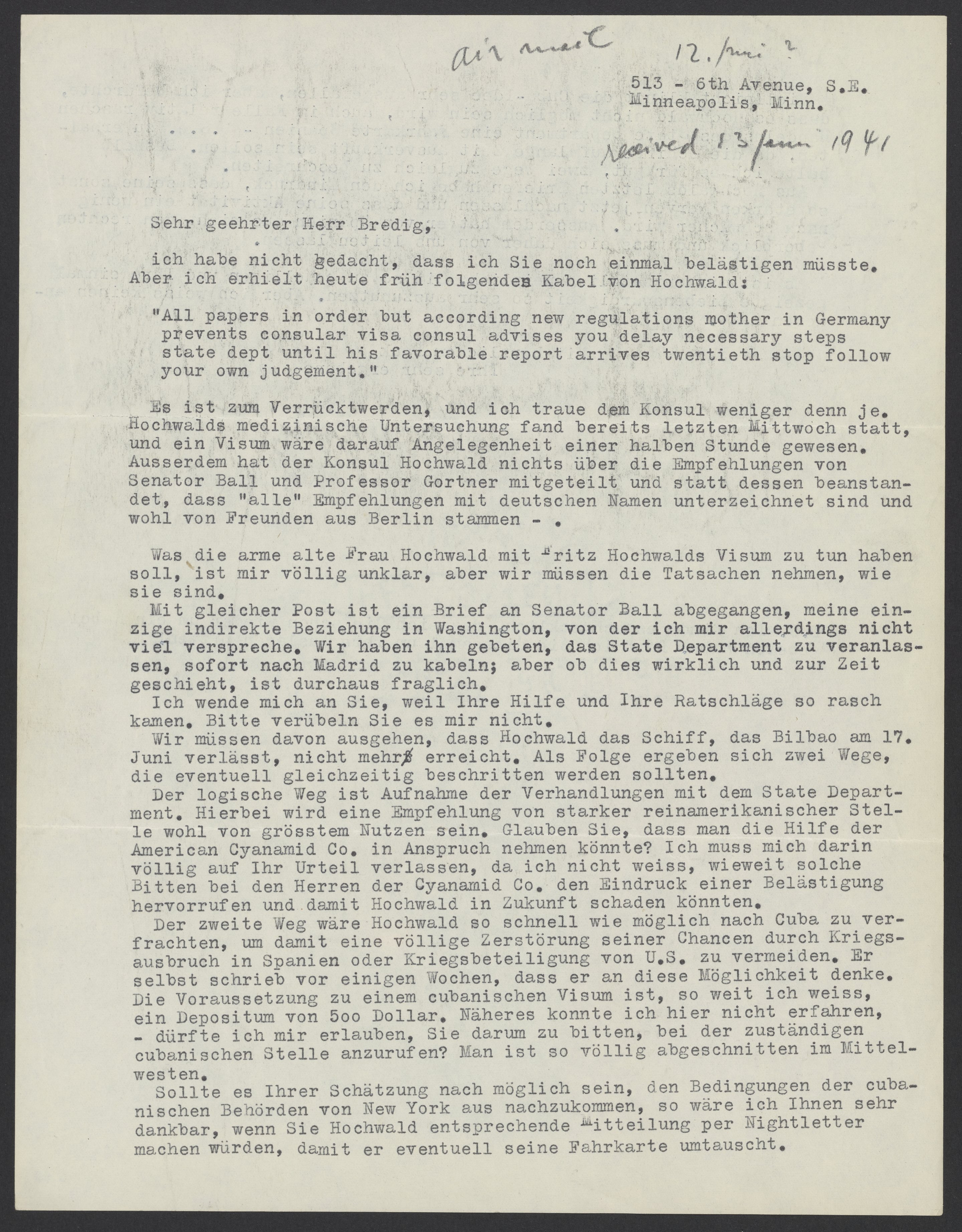 Letter from Ilse Wolfsberg to Max Bredig, January 1941