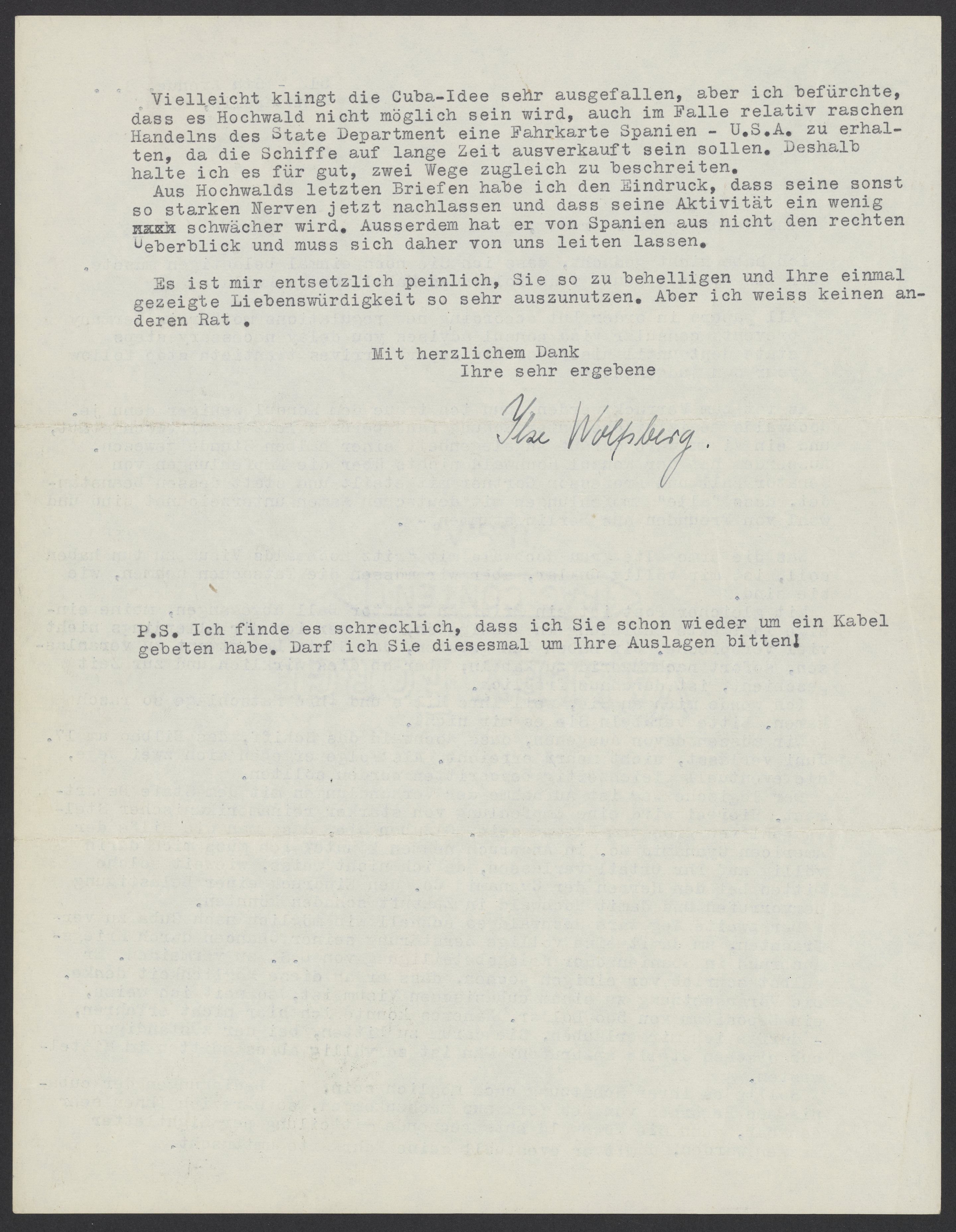 The second possibility would be to have Hochwald sail to Cuba as quickly as possible to avoid the complete destruction of his chances by the outbreak of war in Spain or the United States’ participation in it. He personally wrote a few weeks ago that he was thinking about this possibility. As far as I know, the prerequisite for a Cuban visa is a deposit of $500 dollars. I couldn’t find out more here. Could I ask you to call the responsible Cuban consulate? I’m completely cut off in the Midwest.