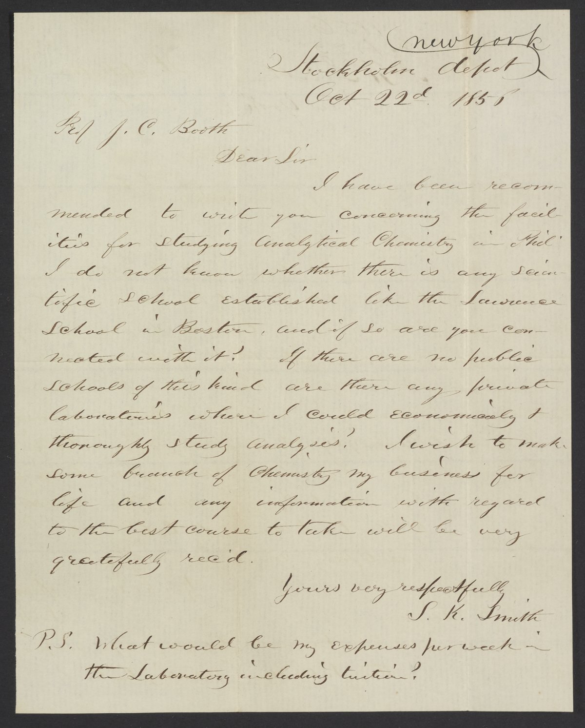 Letter from S.K. Smith to James Curtis Booth, October 22, 1856
