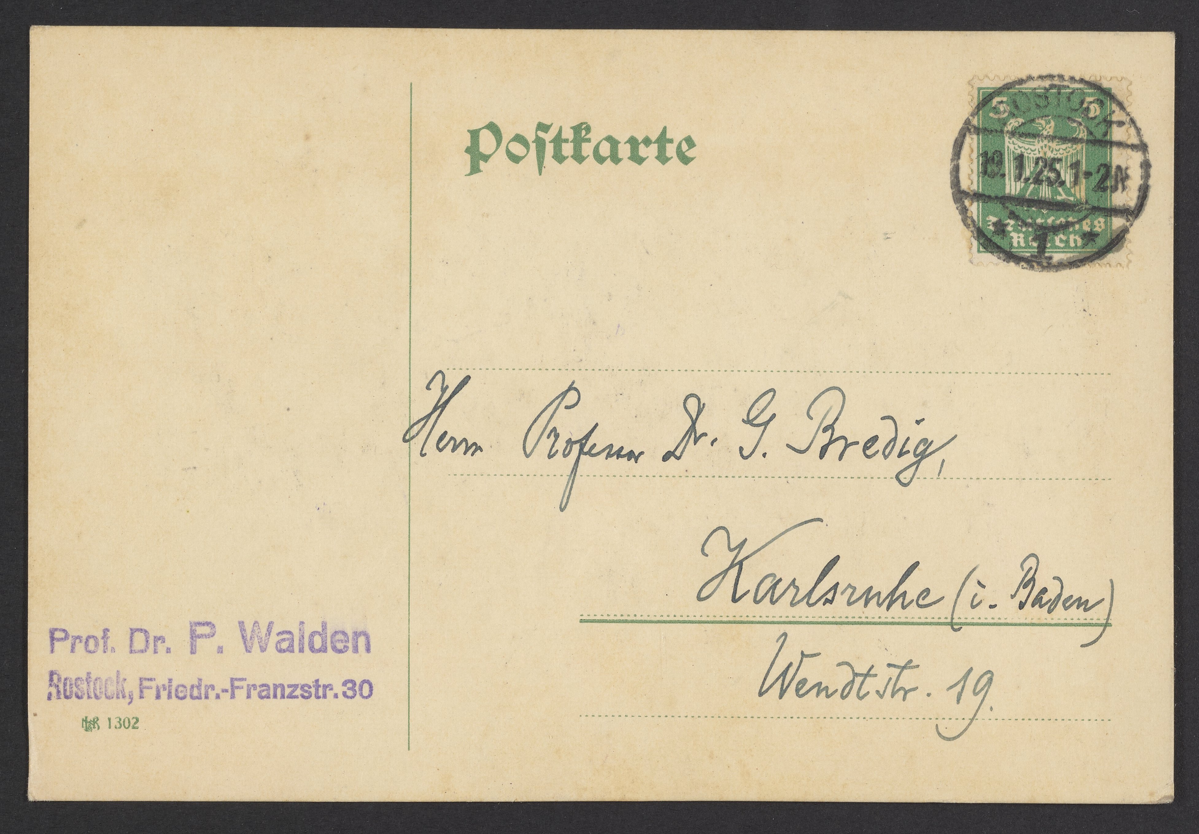 Walden, Paul. “Postcard from Paul Walden to Georg Bredig,” January 18, 1925. Papers of Georg and Max Bredig, Box 2, Folder 64. Science History Institute. Philadelphia. https://digital.sciencehistory.org/works/qos9toe.