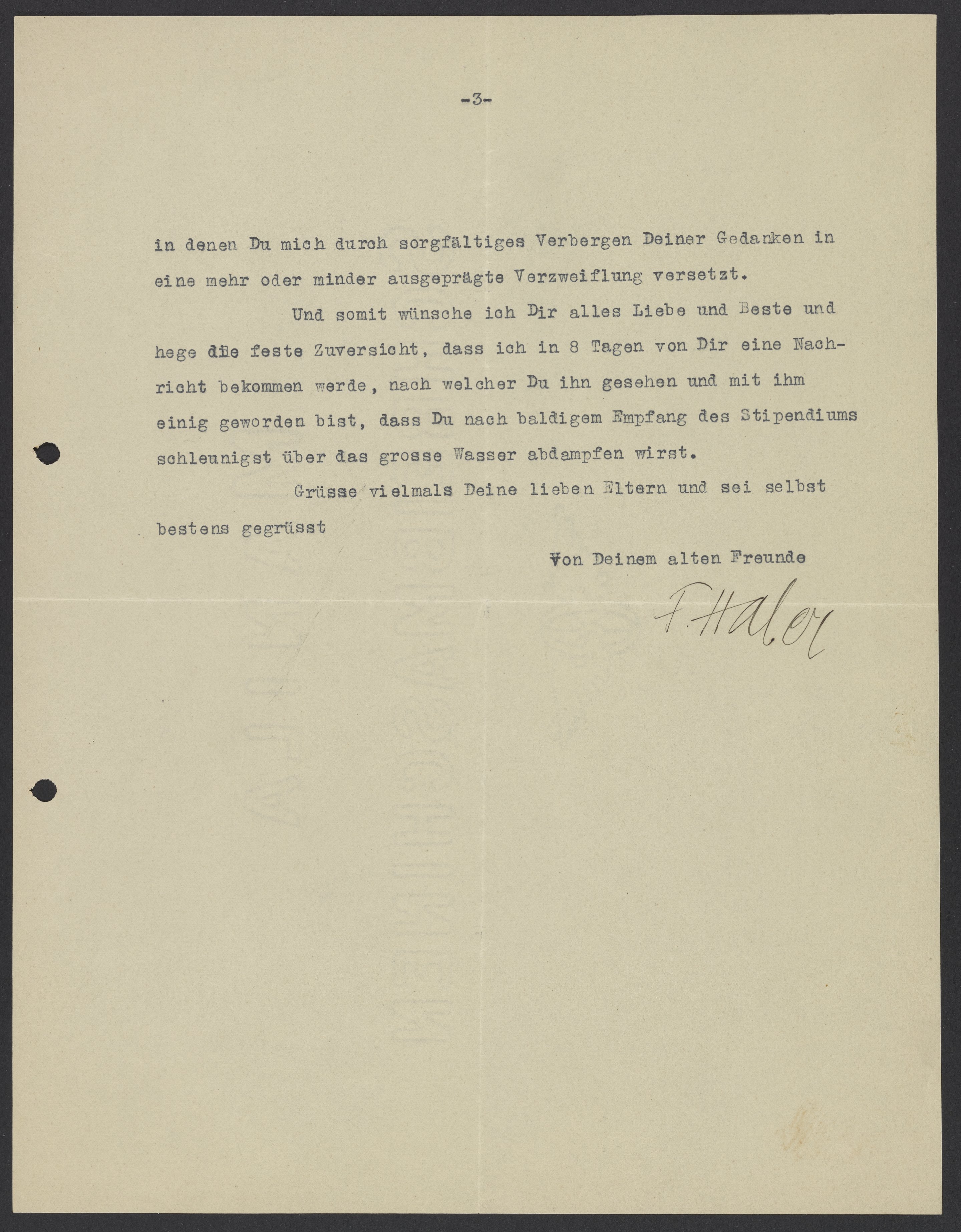 Und somit wünsche ich Dir alles Liebe und Beste und hege die feste Zuversicht, dass ich in 8 Tagen von Dir eine Nachricht bekommen werde, nach welcher Du ihn gesehen und mit ihm einig geworden bist, dass Du nach baldigem Empfang des Stipendiums schleunigst über das grosse Wasser abdampfen wirst.