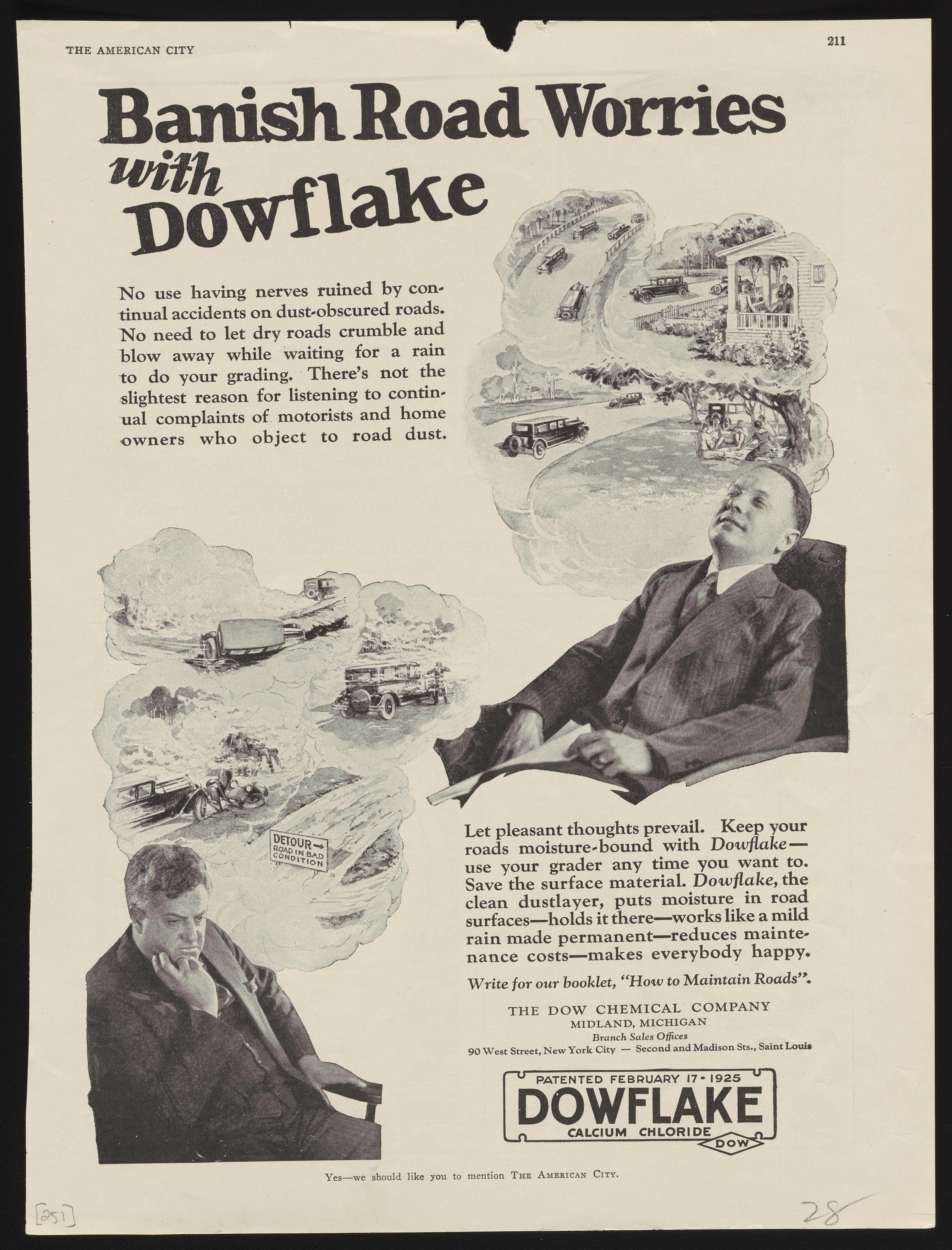 Advertisement for Dowflake Calcium Chloride, a product of the Dow Chemical Company. The advertisement features a man (bottom left) contemplating traffic accidents resulting from poor road conditions, while a second man comfortably dreams of clean roads presumably treated with Dowflake. Patented on February 17, 1925, Dowflake was marketed for use to control dust on unpaved roads and parking lots, as well as a roadway deicer. This advertisement appeared on page 211 of a 1928 edition of The American City .