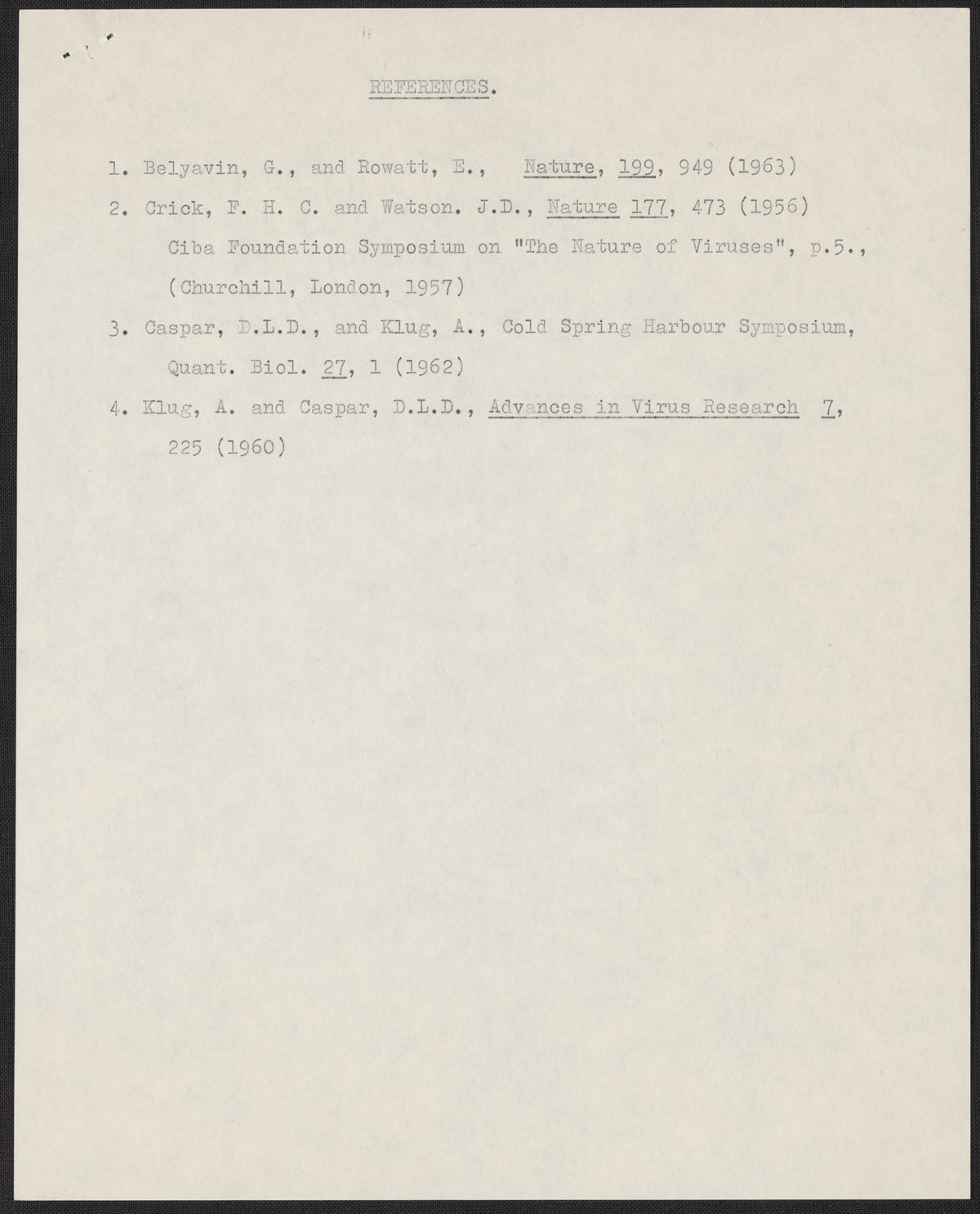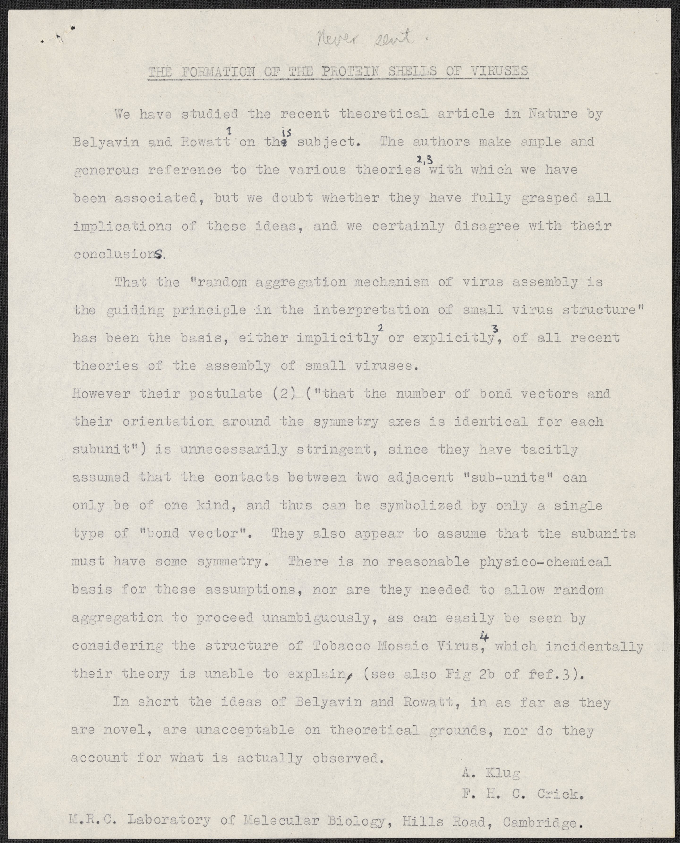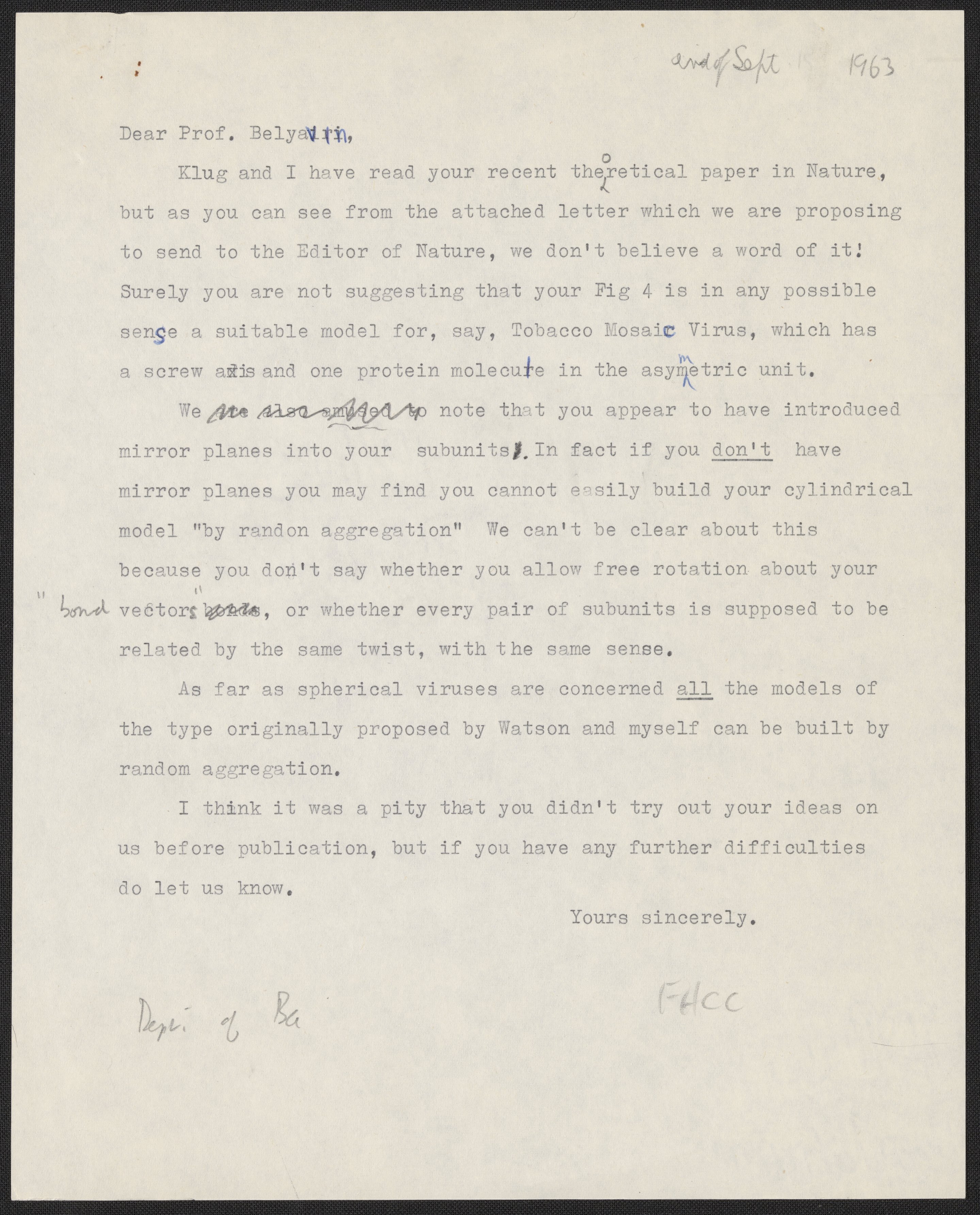 Crick, Francis, and Klug, A. (Aaron), Sir. “Letter to George Belyavin from Francis Crick and Aaron Klug, September 1963,” September 1963. History of Molecular Biology Collection, Box 19, Folder 21. Science History Institute. Philadelphia. https://digital.sciencehistory.org/works/qrikrhn.