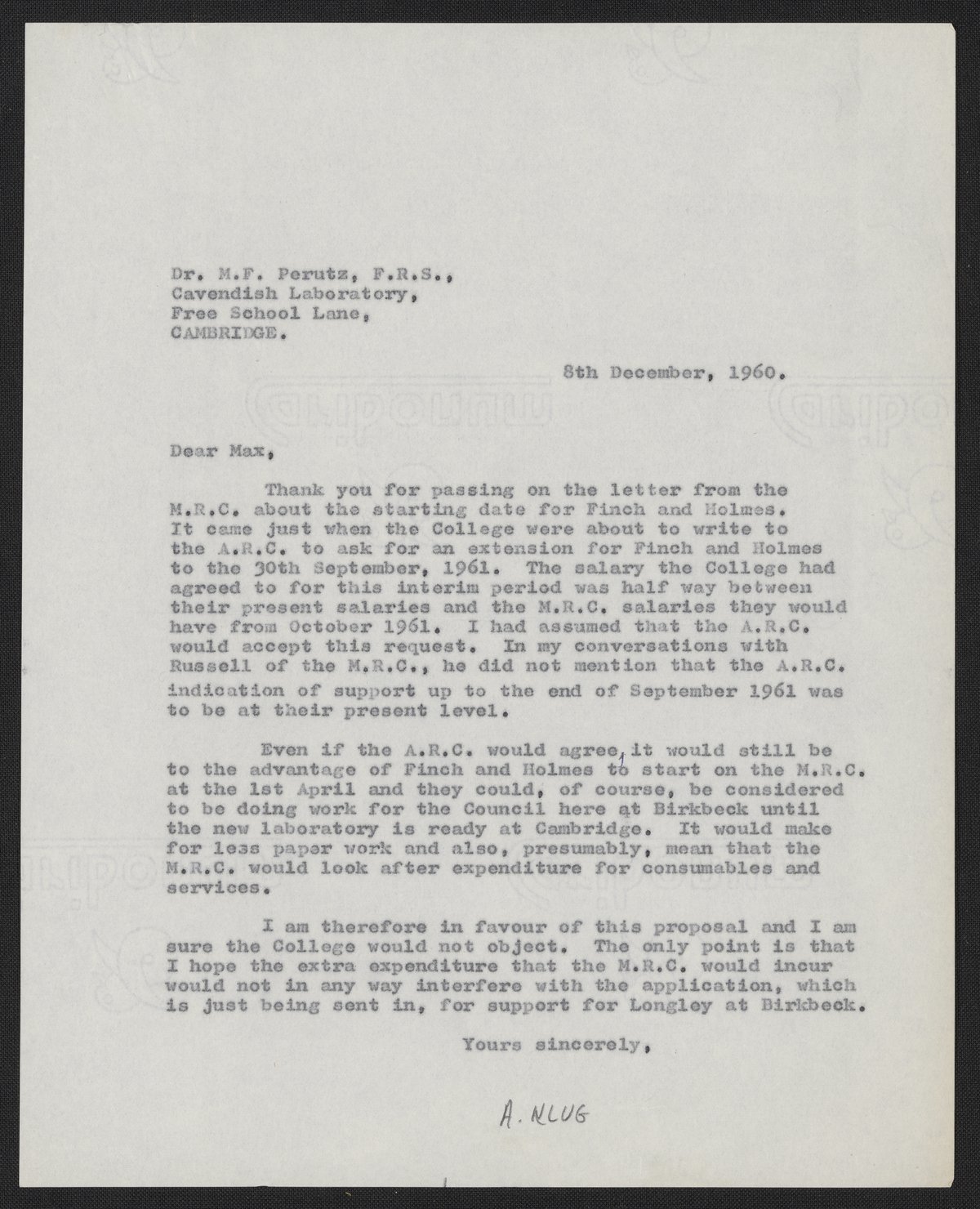 Aaron Klug (1926-2018) writes to Max Perutz (1914-2002) about John Finch (1930-2017) and Kenneth C. Holmes (1934-2021) starting to work at the Medical Research Council (MRC) Laboratory of Molecular Biology (LMB).