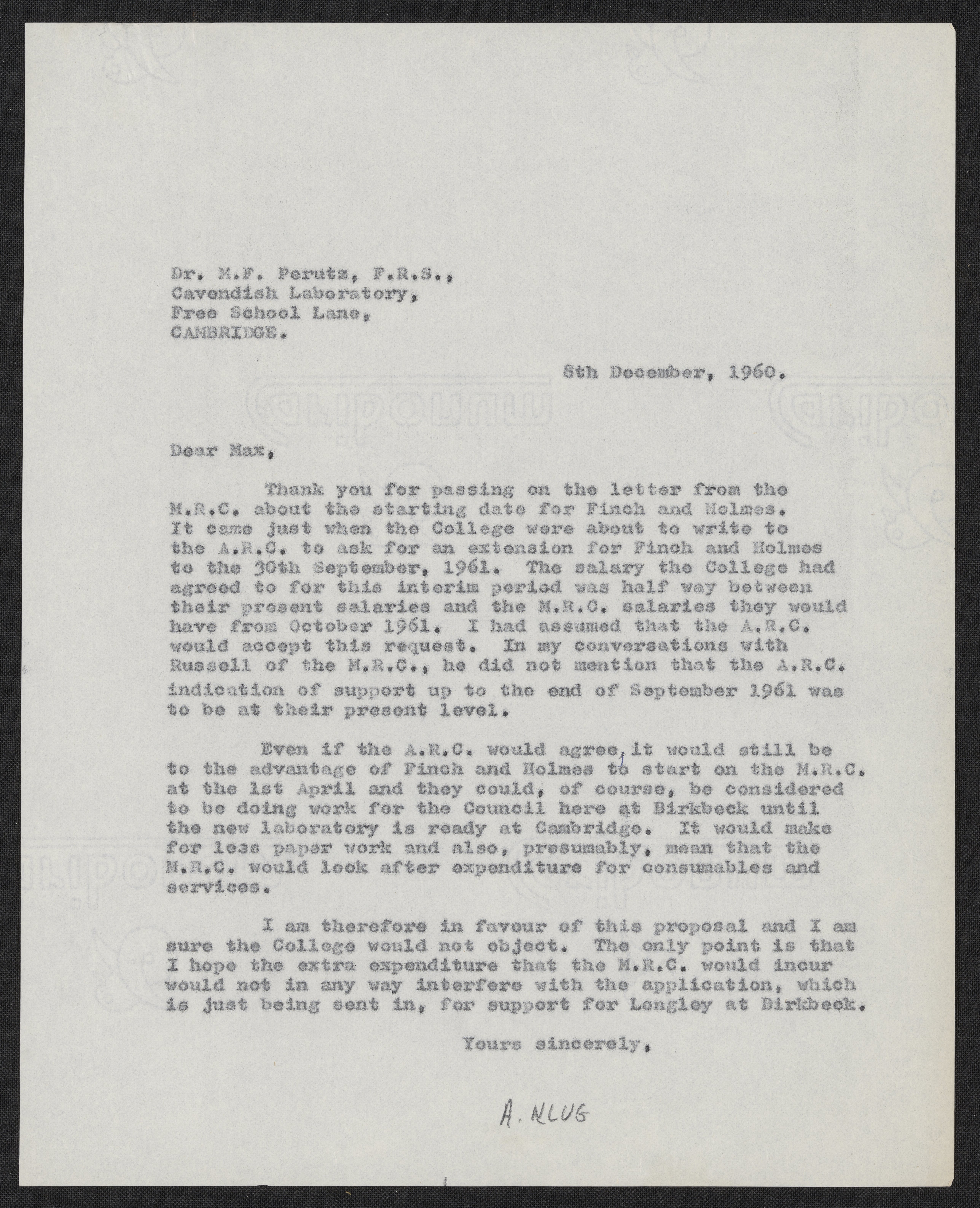 Aaron Klug (1926-2018) writes to Max Perutz (1914-2002) about John Finch (1930-2017) and Kenneth C. Holmes (1934-2021) starting to work at the Medical Research Council (MRC) Laboratory of Molecular Biology (LMB).
