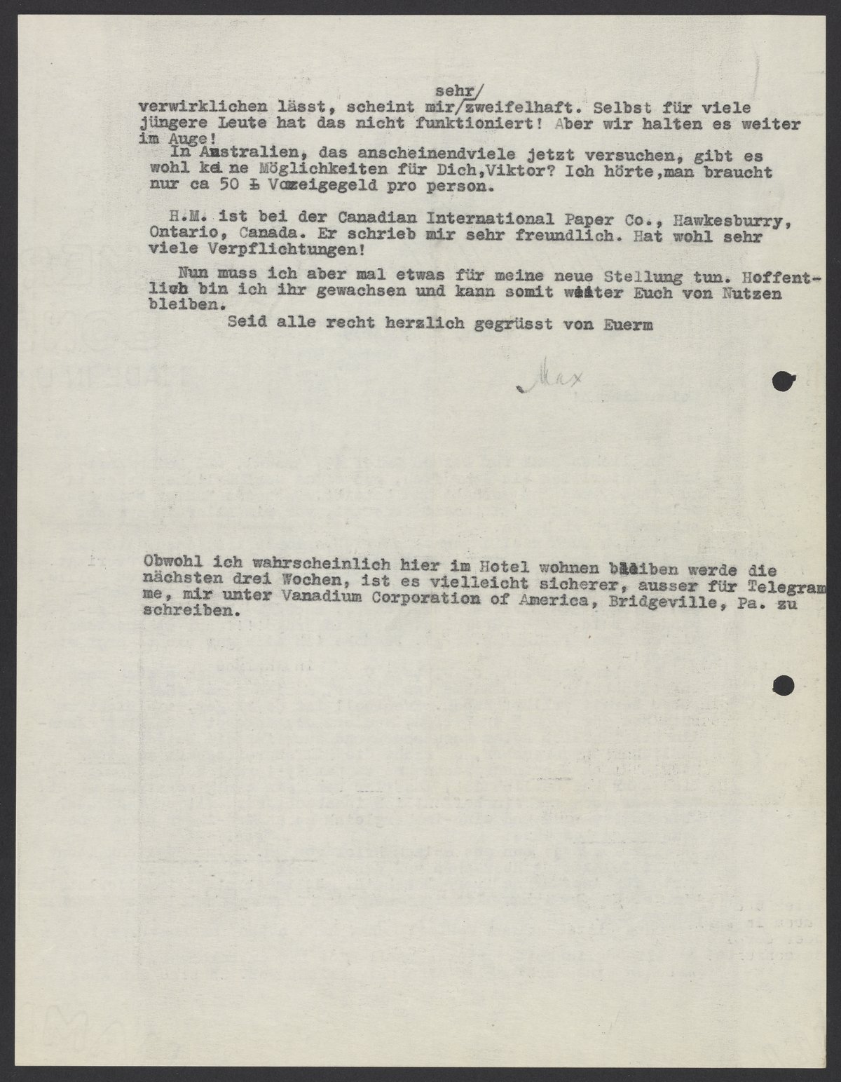 H.M. ist bei der Canadian International Paper Co., Hawkesberry, Ontario, Canada. Er schrieb mir sehr freundlich. Hat wohl sehr viele Verpflichtungen!