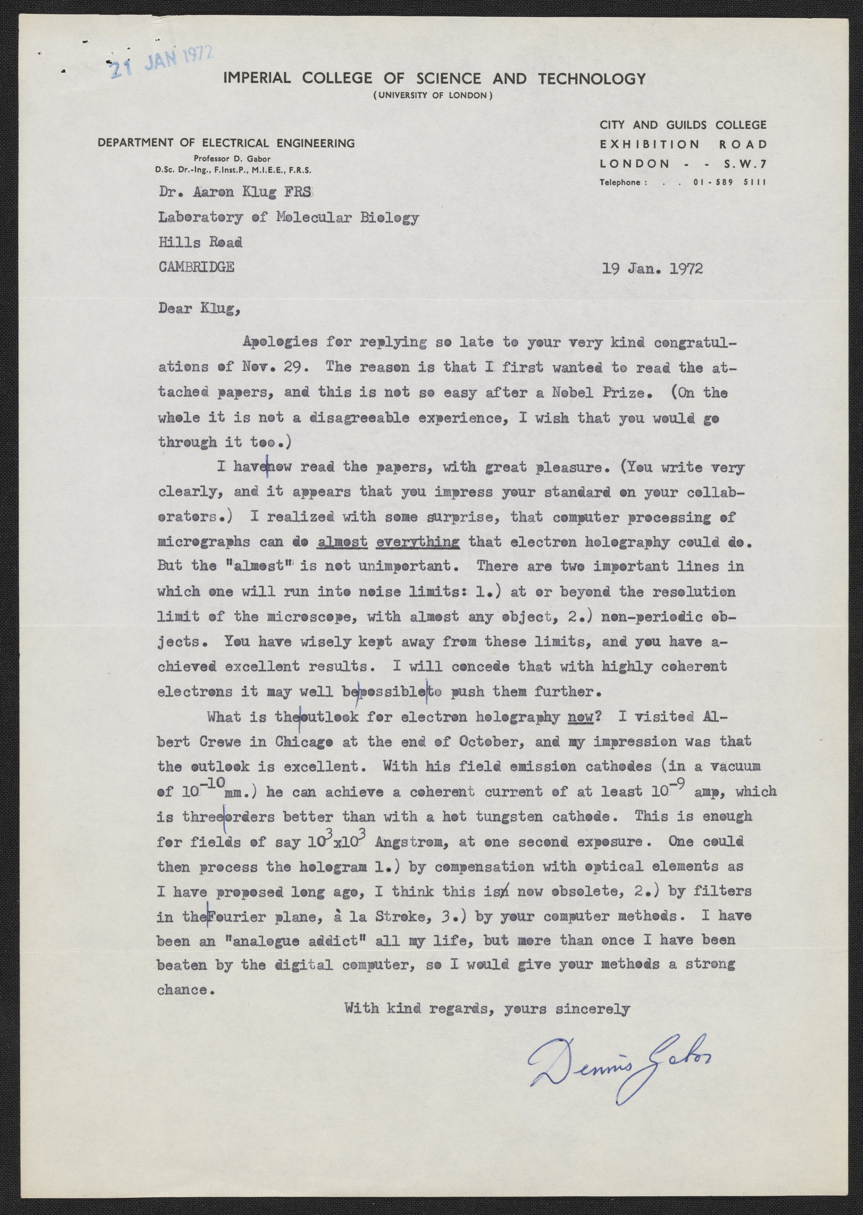 Gabor, Dennis. “Letter from Dennis Gabor to Aaron Klug, January 19, 1972,” January 19, 1972. History of Molecular Biology Collection, Box 25, Folder 18. Science History Institute. Philadelphia. https://digital.sciencehistory.org/works/qtipy5d.