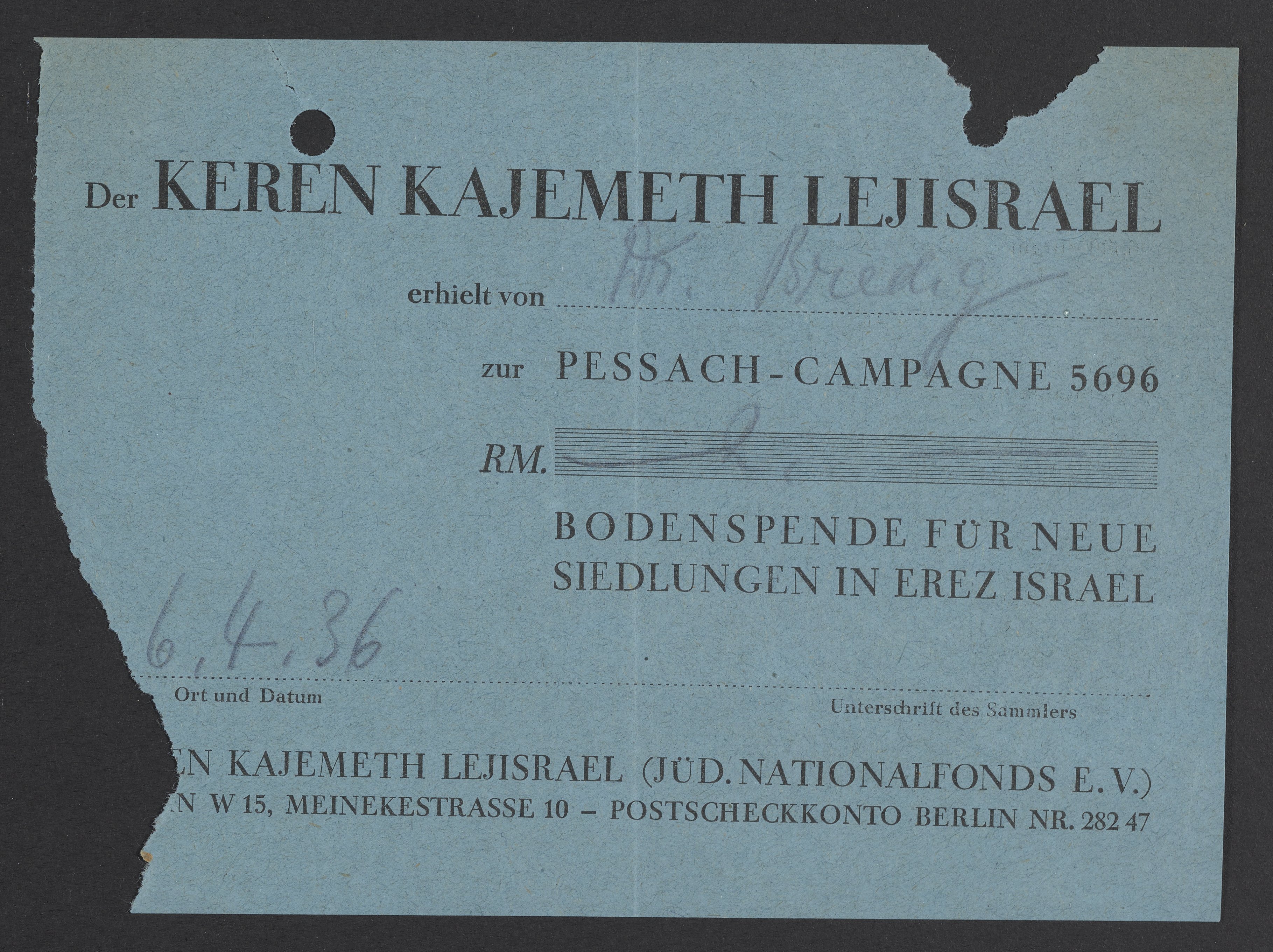 Jewish National Fund. “Receipt from Keren Kayemeth Leisrael,” circa 1930. Papers of Georg and Max Bredig, Box 8, Folder 28. Science History Institute. Philadelphia. https://digital.sciencehistory.org/works/qu1gahw.