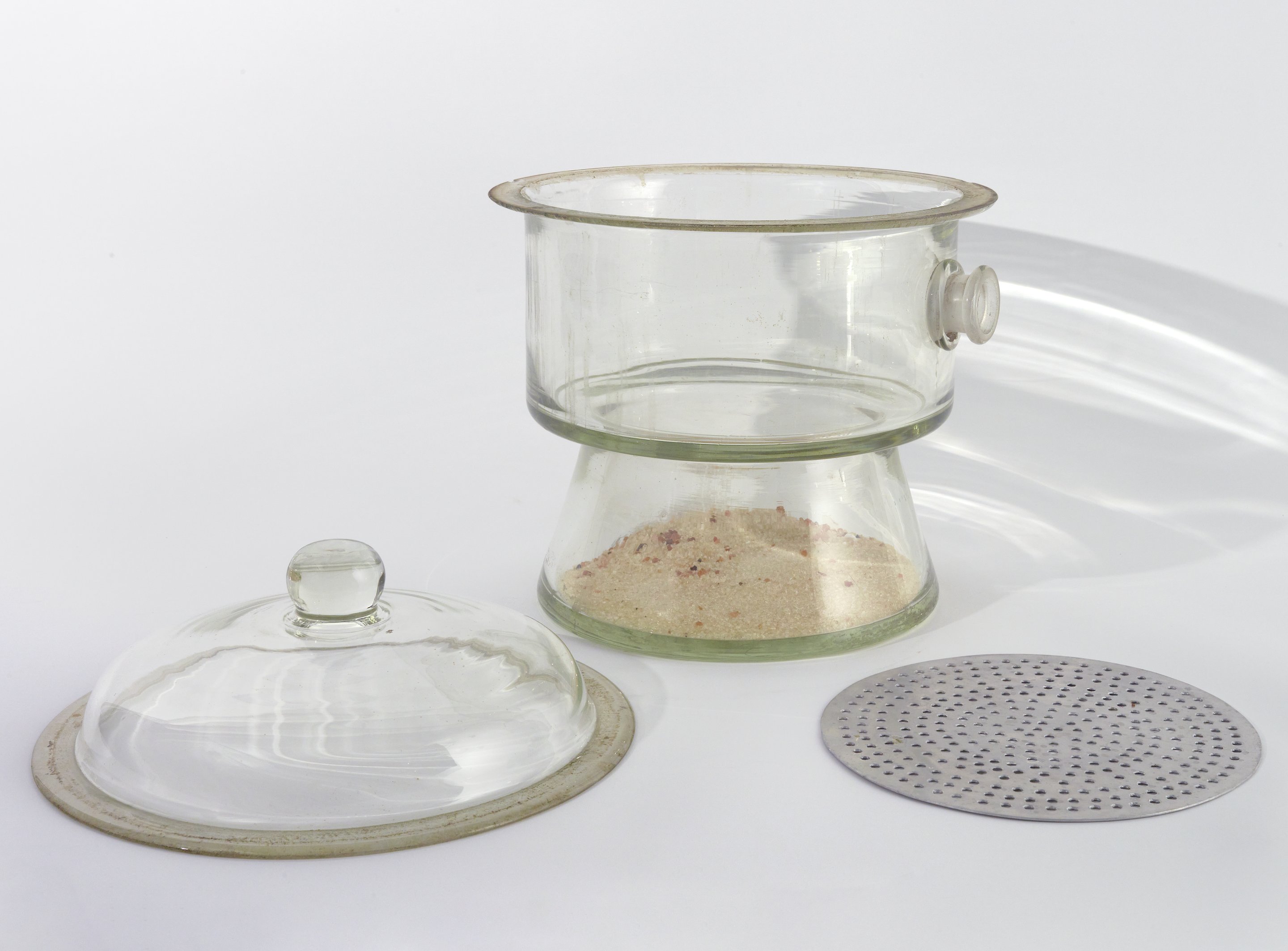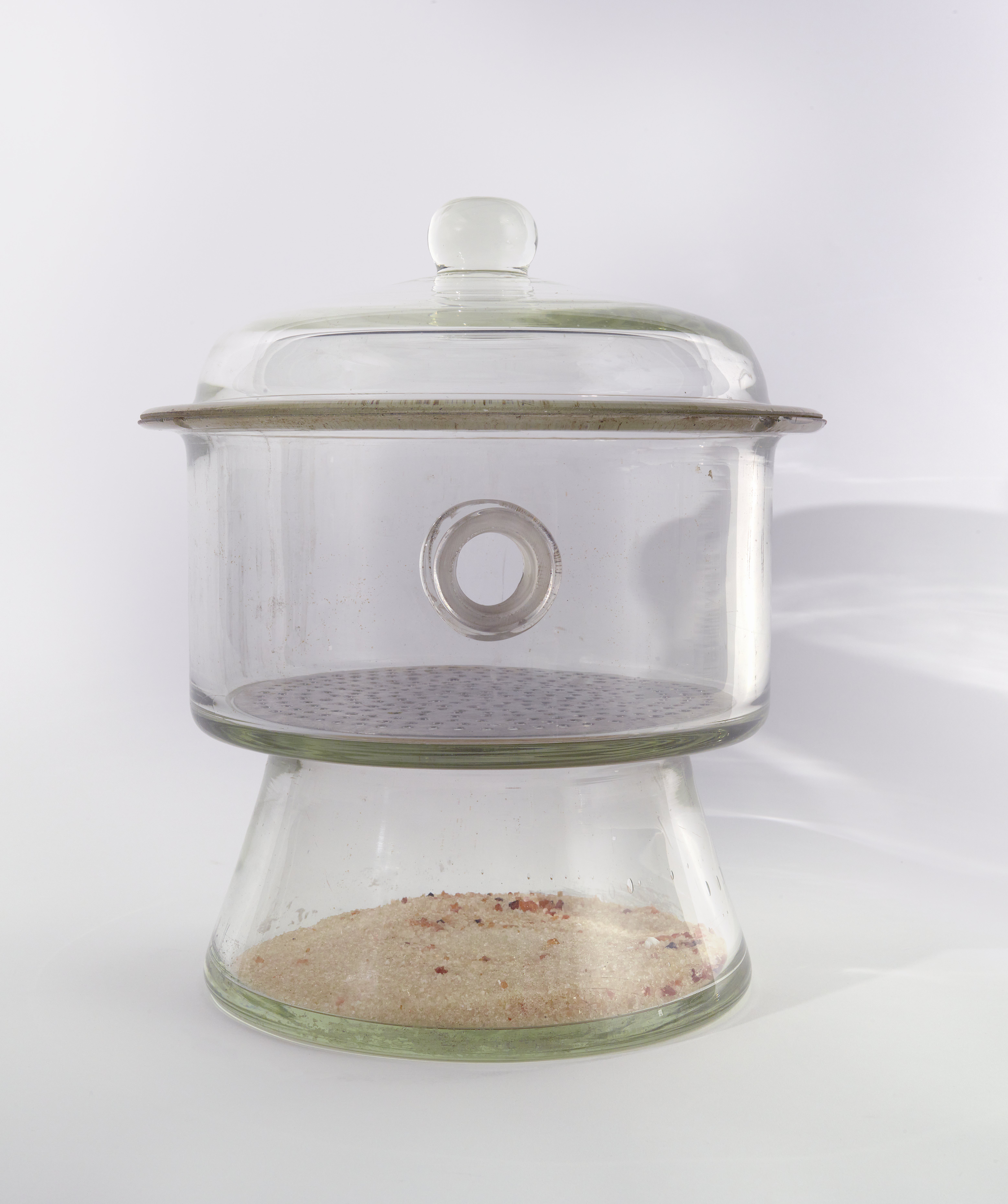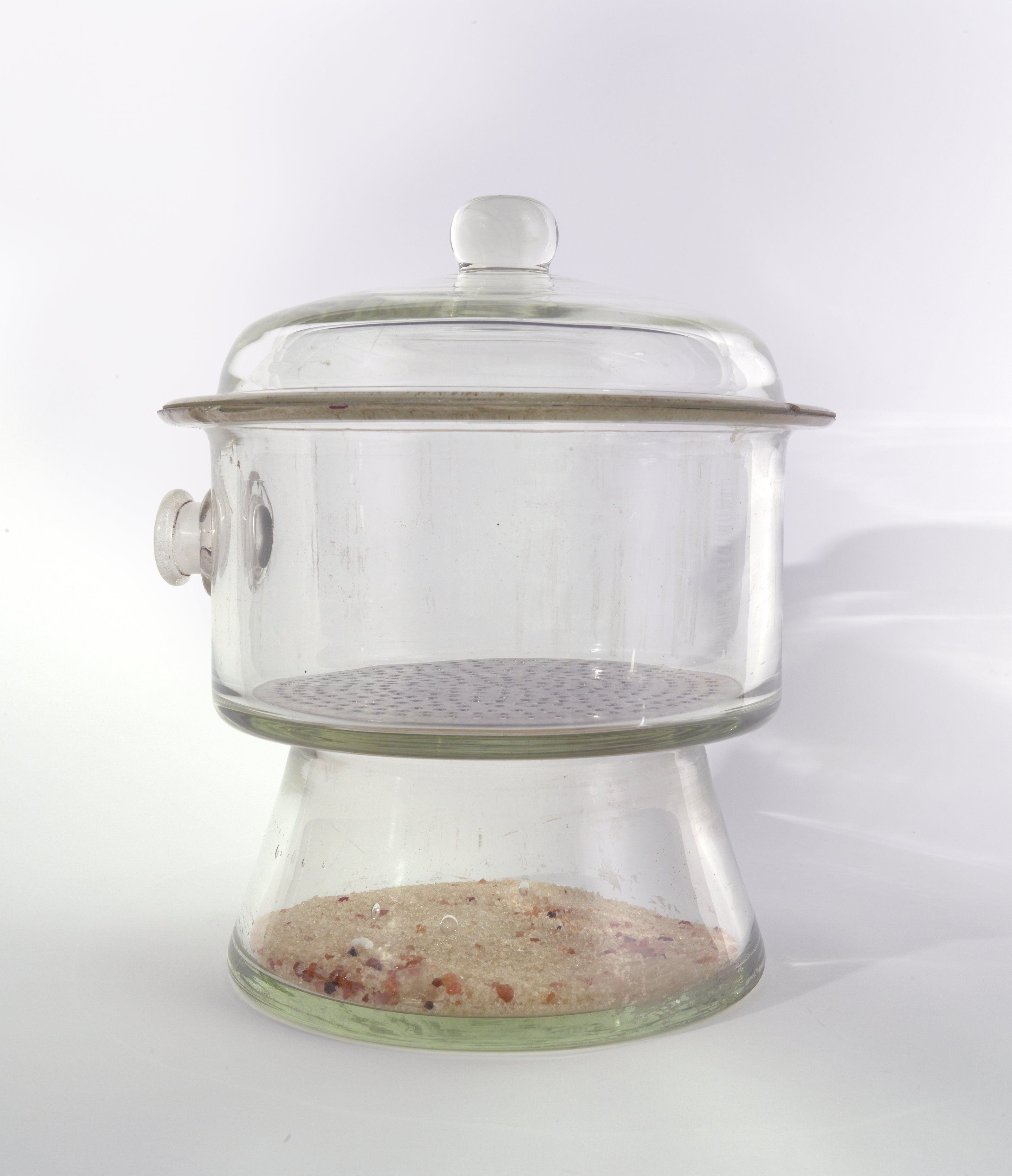 Small JPG1200 x 1383px — 86.6 KBLarge JPG2880 x 3320px — 351 KBFull-sized JPG6266 x 7224px — 1.5 MBOriginal fileTIFF — 6266 x 7224px — 18.2 MBGlass chamber for dehydrating samples over a desiccant chemical. Desiccant crystals remain in the bottom lobe of the device. A valve on the side of the upper lobe allows a vacuum to be attached. After being used by Rosalind Franklin (1920-1958) and Raymond Gosling (1926-2015) at King’s College London circa 1952, this desiccator remained in Gosling’s possession. The practice of drying and moistening samples played an important role in Franklin and Gosling’s research on the structure of DNA. They showed that the DNA molecule occurred in two distinct forms, A and B, depending on humidity. In Gosling’s 1954 PhD thesis, he described using a desiccator to dry DNA samples over the chemical phosphorus pentoxide.
