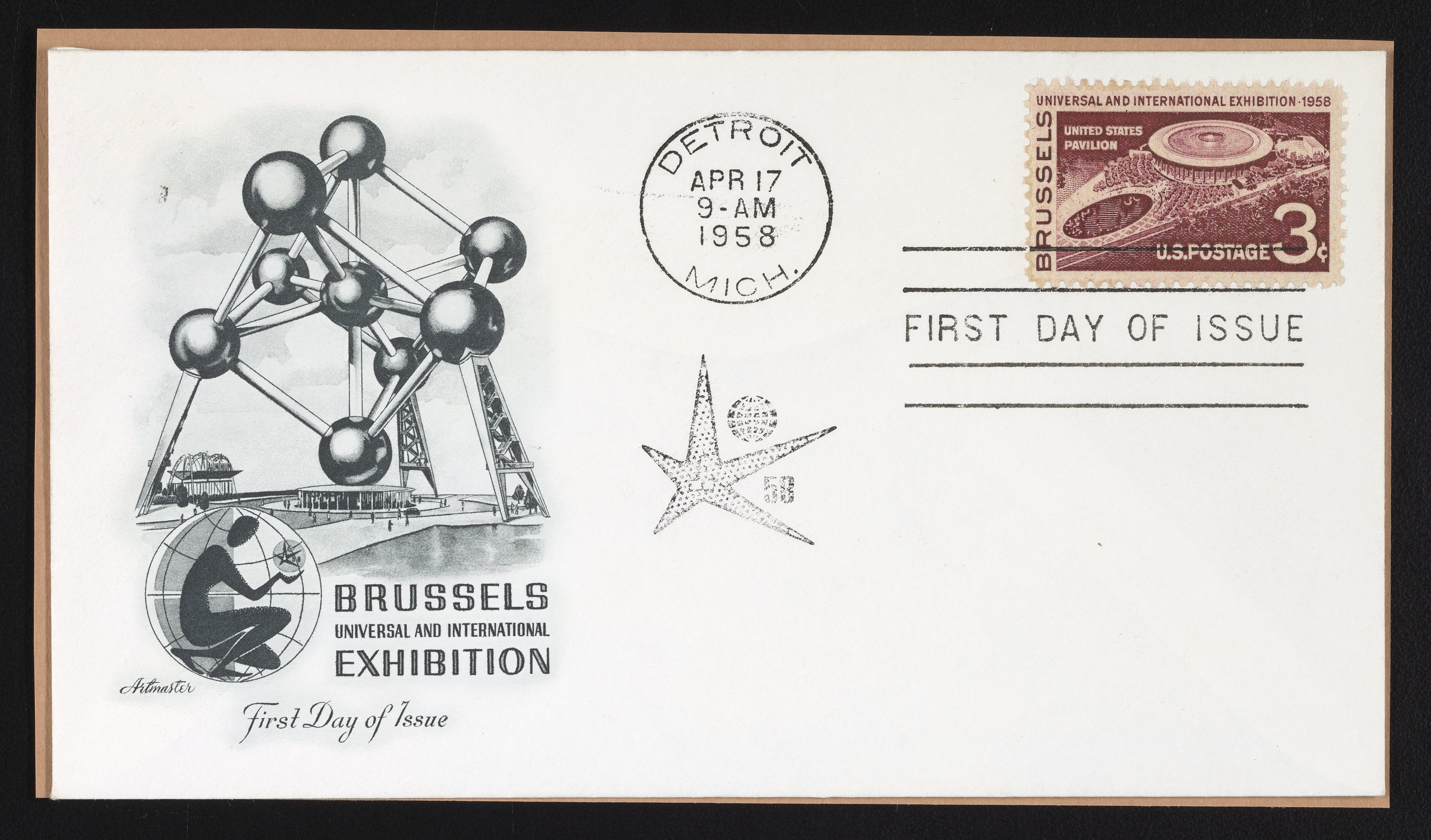 Artmaster. “First Day Cover Commemorating the 1958 World’s Fair in Brussels.” Detroit, Michigan, 1958. Witco Stamp Collection, Box 3. Science History Institute. Philadelphia. https://digital.sciencehistory.org/works/qux5651.