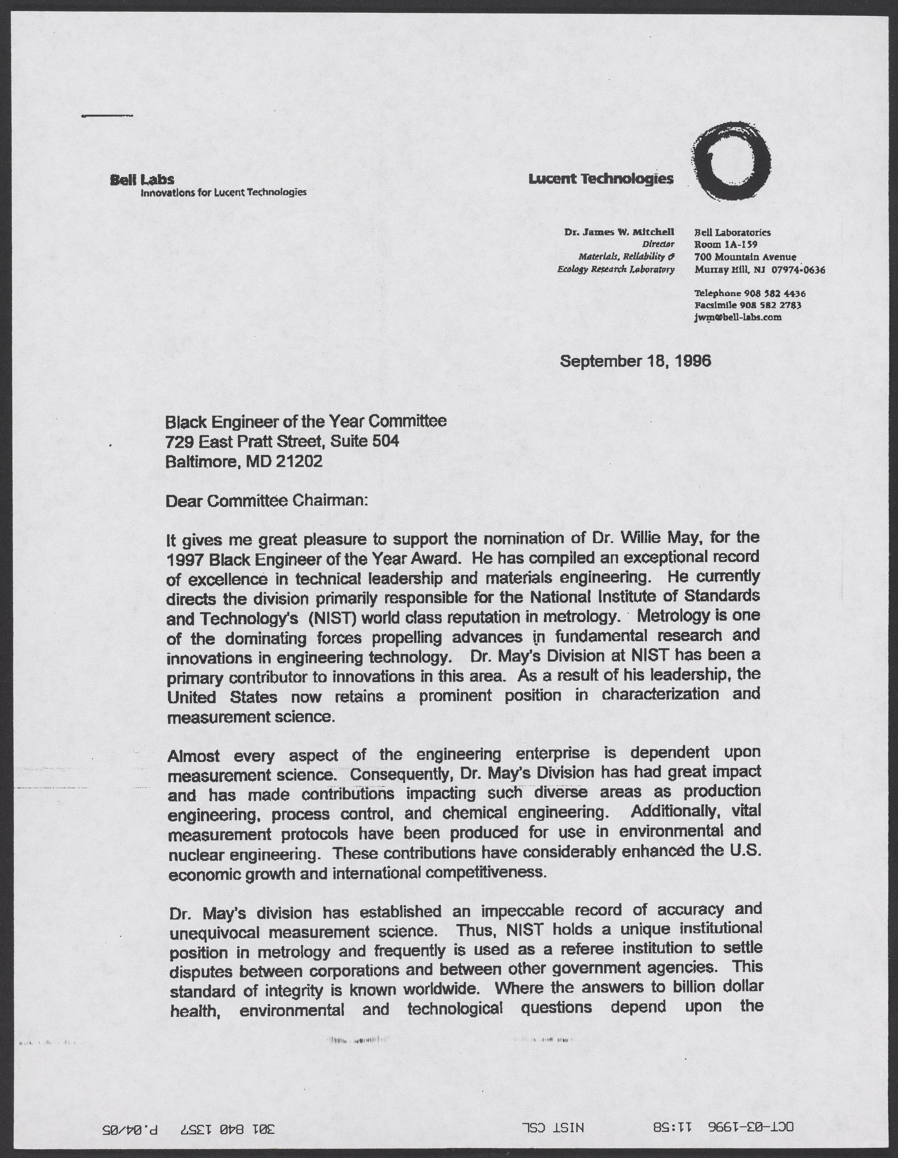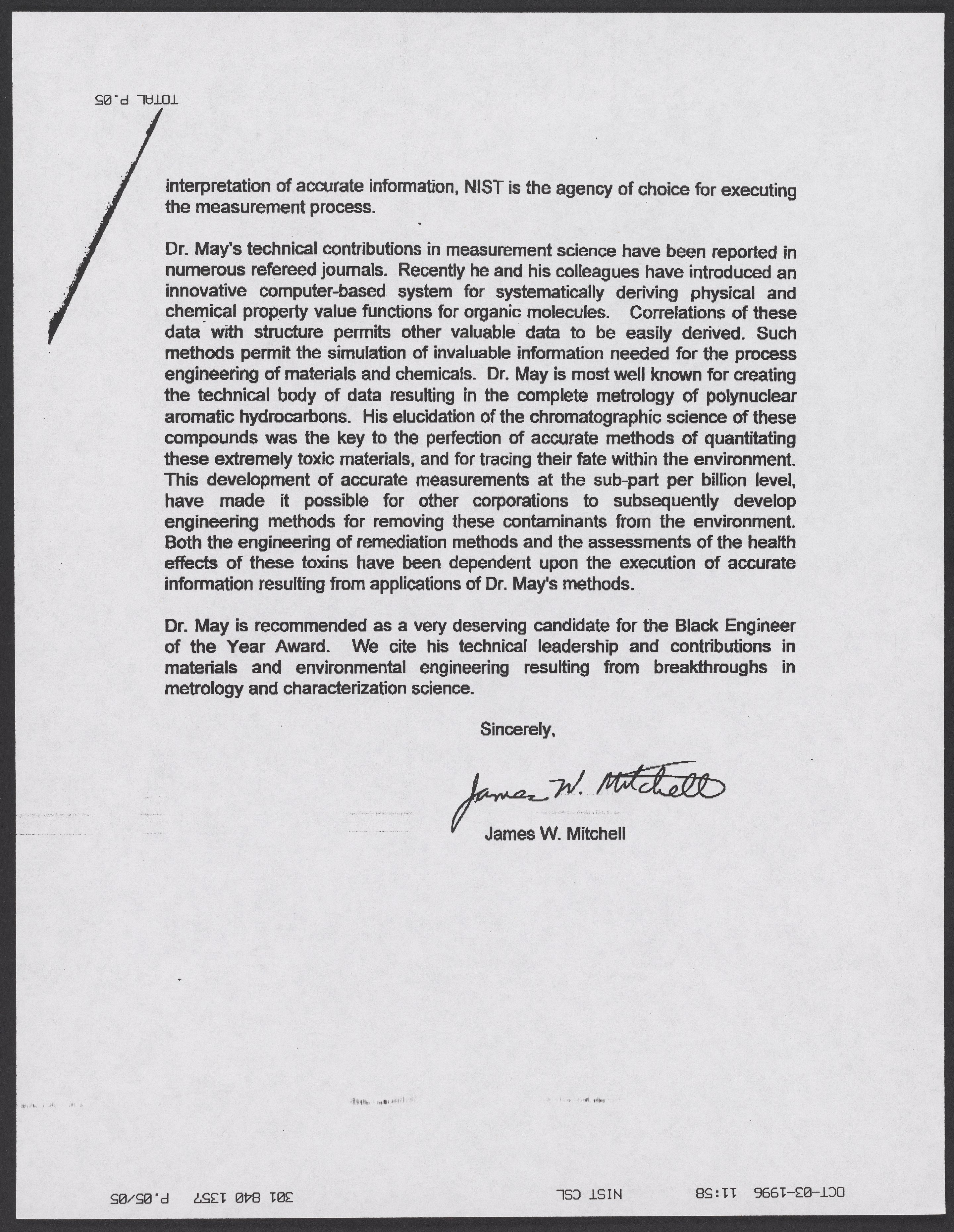 Letter from James W. Mitchell to the Black Engineer of the Year Committee, September 1996