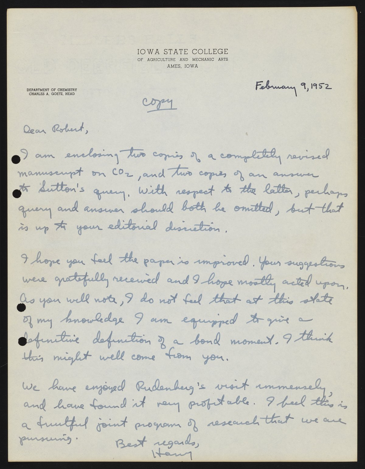 Letter from Harrison Shull to Robert S. Mulliken, 1952