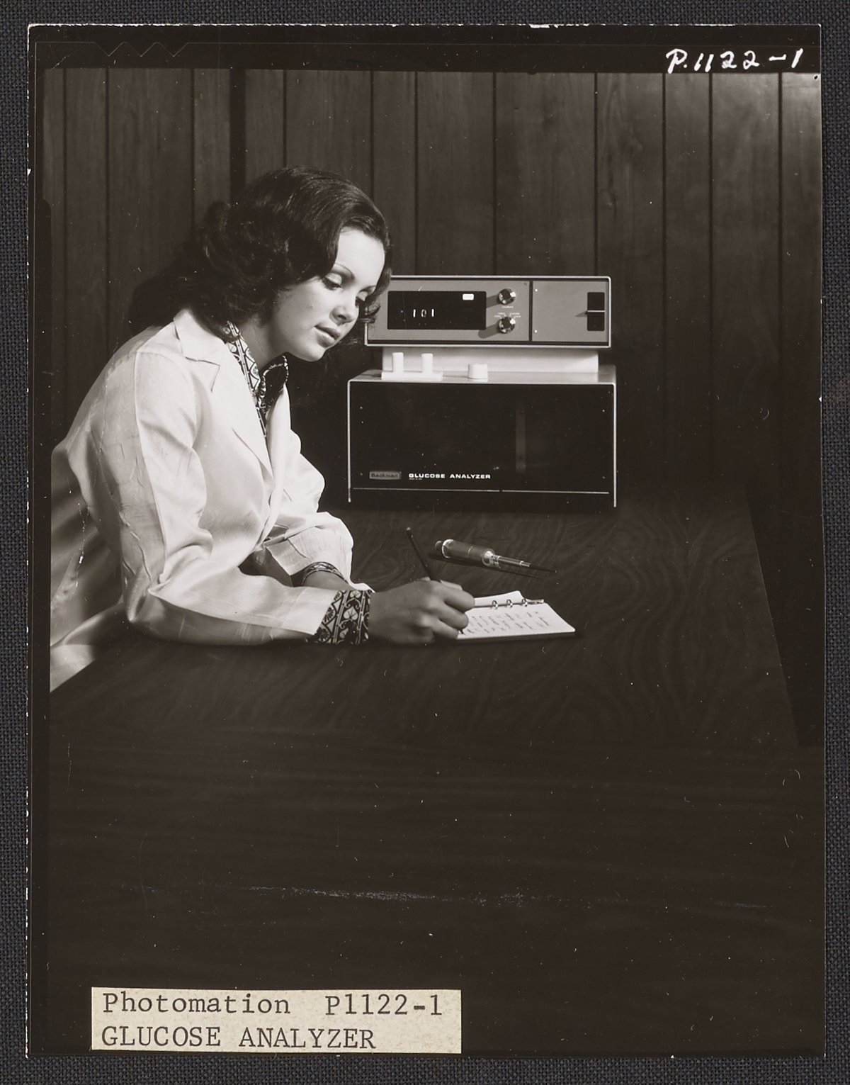 Photomation. “Woman Taking Notes at a Table Where a Beckman Glucose Analyzer Sits,” 1970–1979. Beckman Historical Collection, Box 86. Science History Institute. Philadelphia. https://digital.sciencehistory.org/works/qv33rx17q.