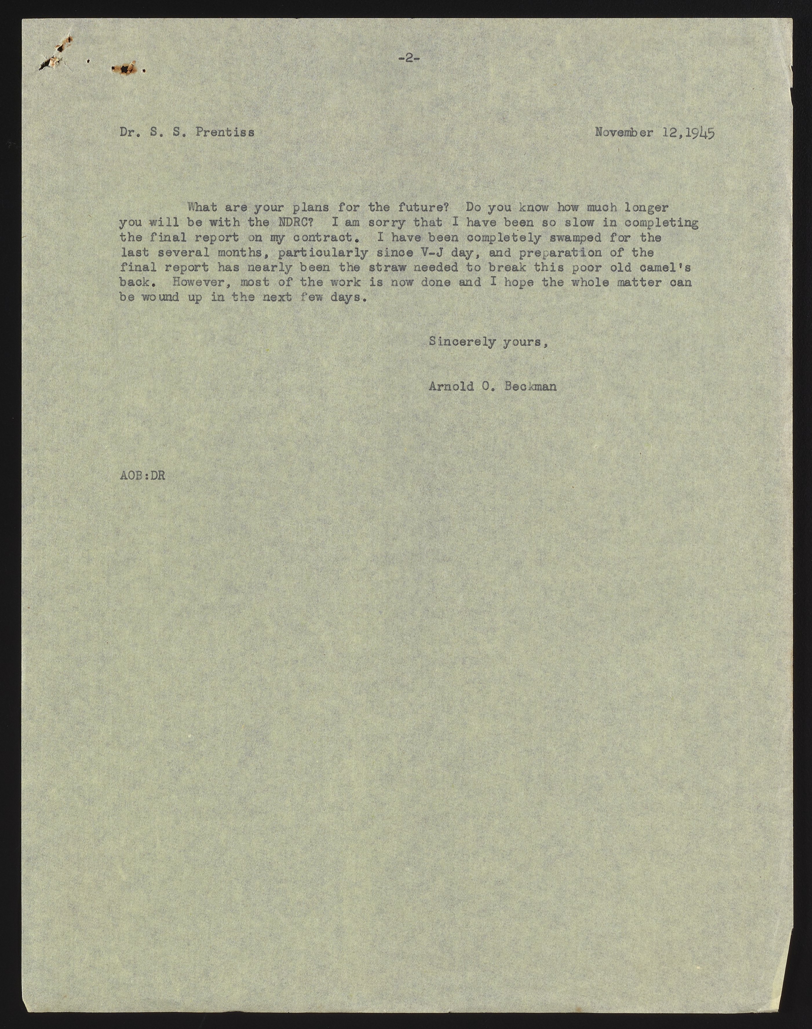 Beckman, Arnold O. “Letter from Arnold O. Beckman to S. S. Prentiss,” November 12, 1945. Beckman Historical Collection, Box 19, Folder 8. Science History Institute. Philadelphia. https://digital.sciencehistory.org/works/qv33rx23v.