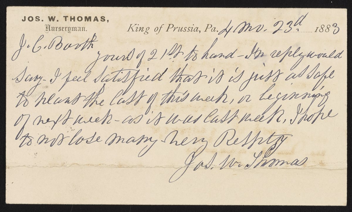 Postcard from J.W. Thomas to James Curtis Booth, April 23, 1883