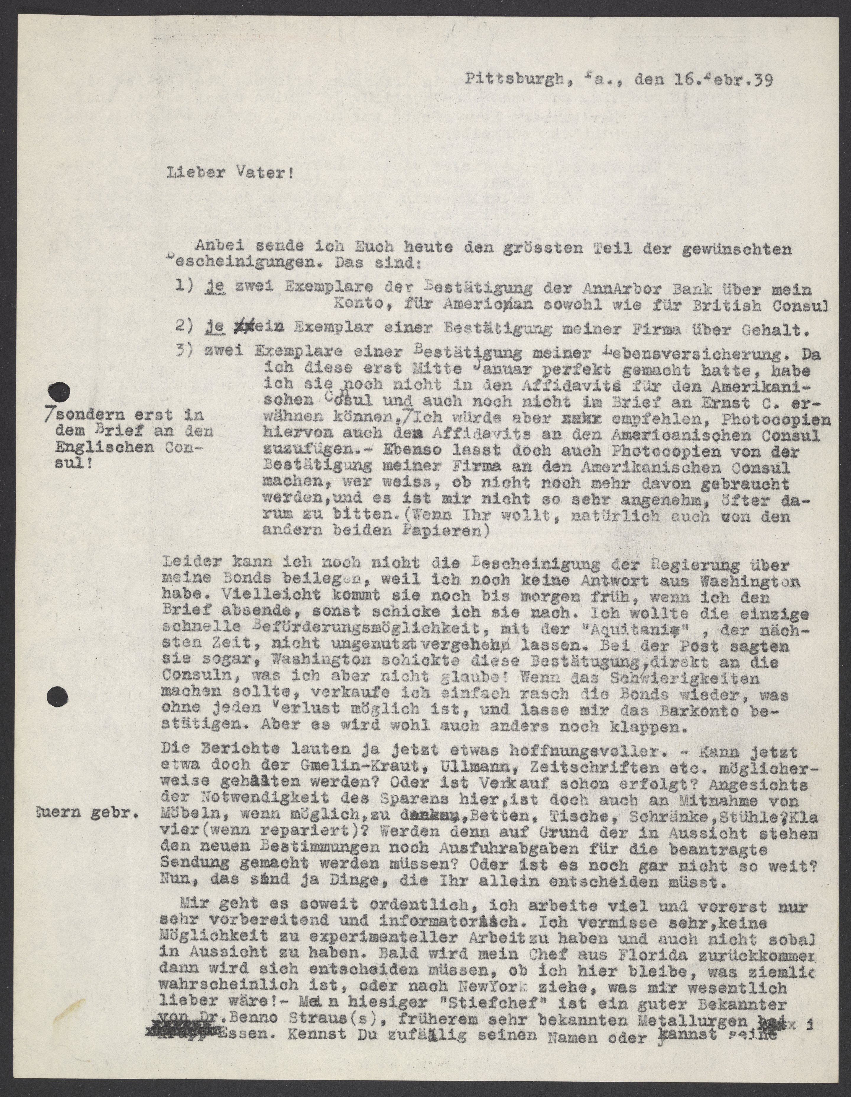 3) zwei Exemplare einer Bestätigung meiner Lebensversicherung. Da ich diese erst Mitte Januar perfekt gemacht hatte, habe ich sie noch nicht in den Affidavits für den Amerikanischen Consul und auch noch nicht im Brief an Ernst C. erwähnen können, sondern erst in dem Brief an den Englischen Consul! Ich würde aber empfehlen, Photocopien von der Bestätigung meiner Firma an den Amerikanischen Consul machen, wer weiss, ob nicht noch mehr davon gebraucht werden, und es ist mir nicht so sehr angenehm, öfter darum zu bitten. (Wenn Ihr wollt, natürlich auch von den andern beiden Papieren).