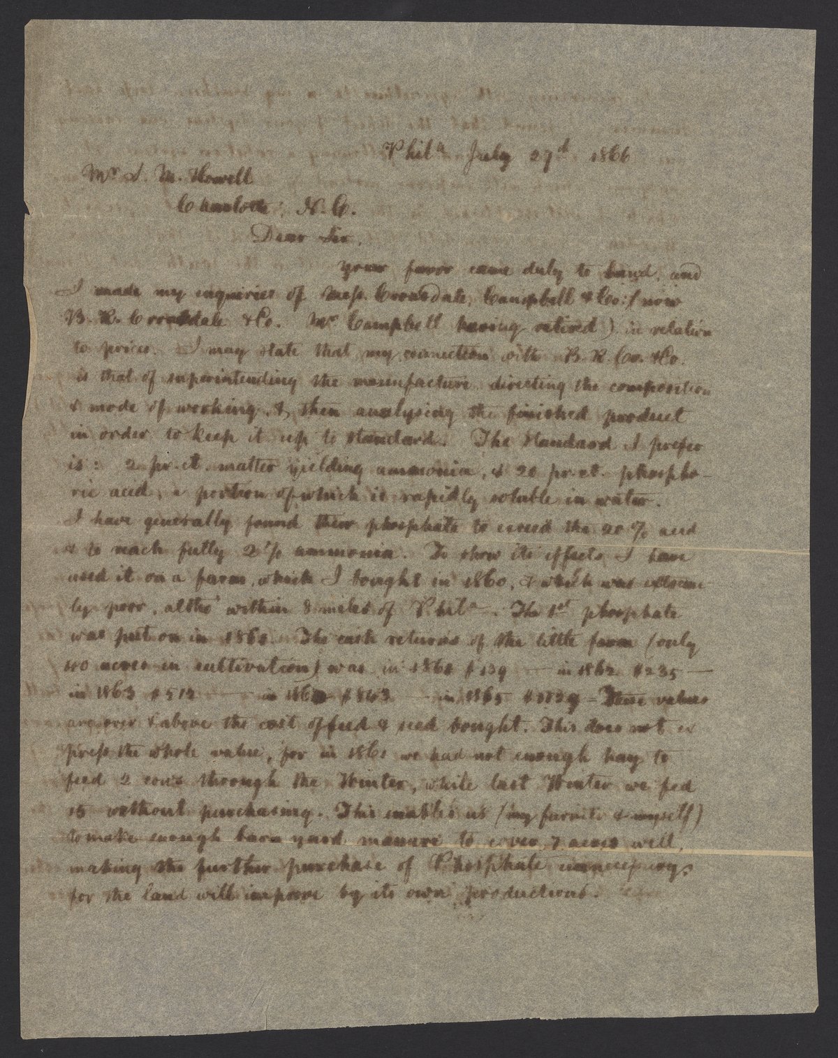 Booth, James Curtis. “Letter from James Curtis Booth to Mr. S. M. Howell,” July 27, 1866. Papers of James Curtis Booth, Box 2, Folder 5. Science History Institute. Philadelphia. https://digital.sciencehistory.org/works/qw628gp.