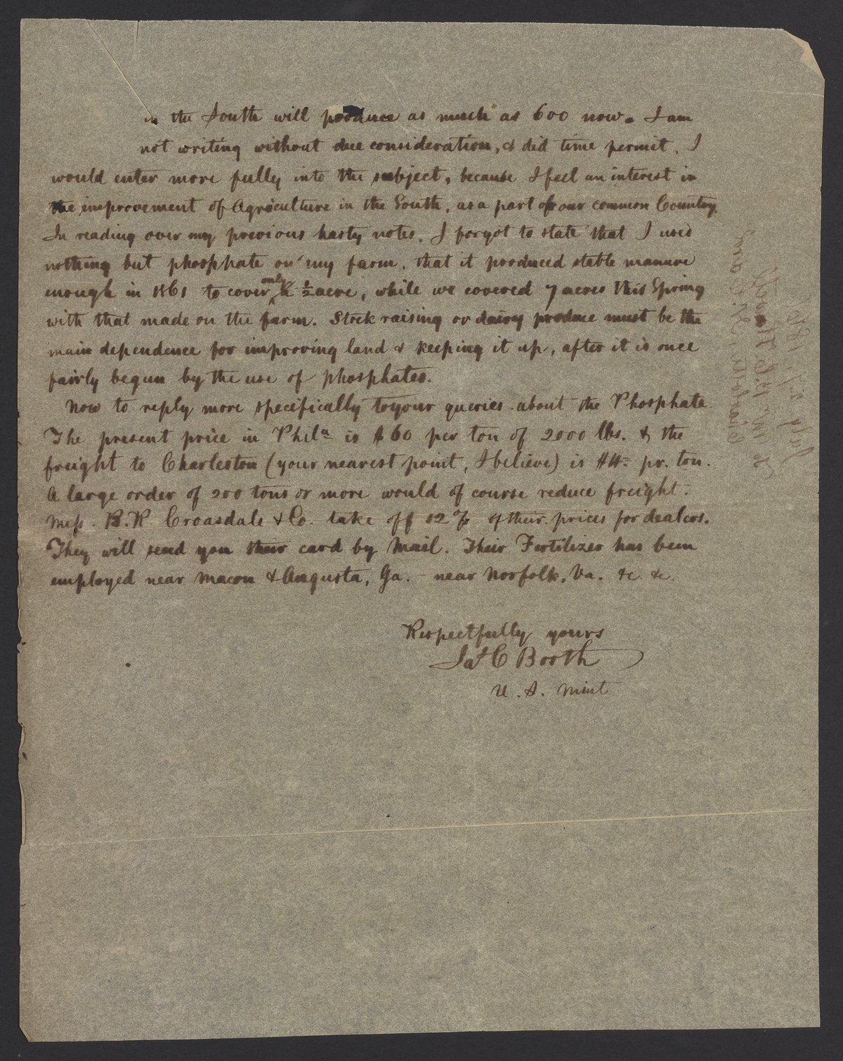 Small JPG1200 x 1515px — 406 KBLarge JPG2880 x 3636px — 2.5 MBFull-sized JPG3702 x 4674px — 3.8 MBOriginal fileTIFF — 3702 x 4674px — 49.6 MBJames Curtis Booth (1810-1888) writes to a Mr. S. M. Howell of Charlotte, North Carolina to suggest that Howell follow a rotation system for planting crops.