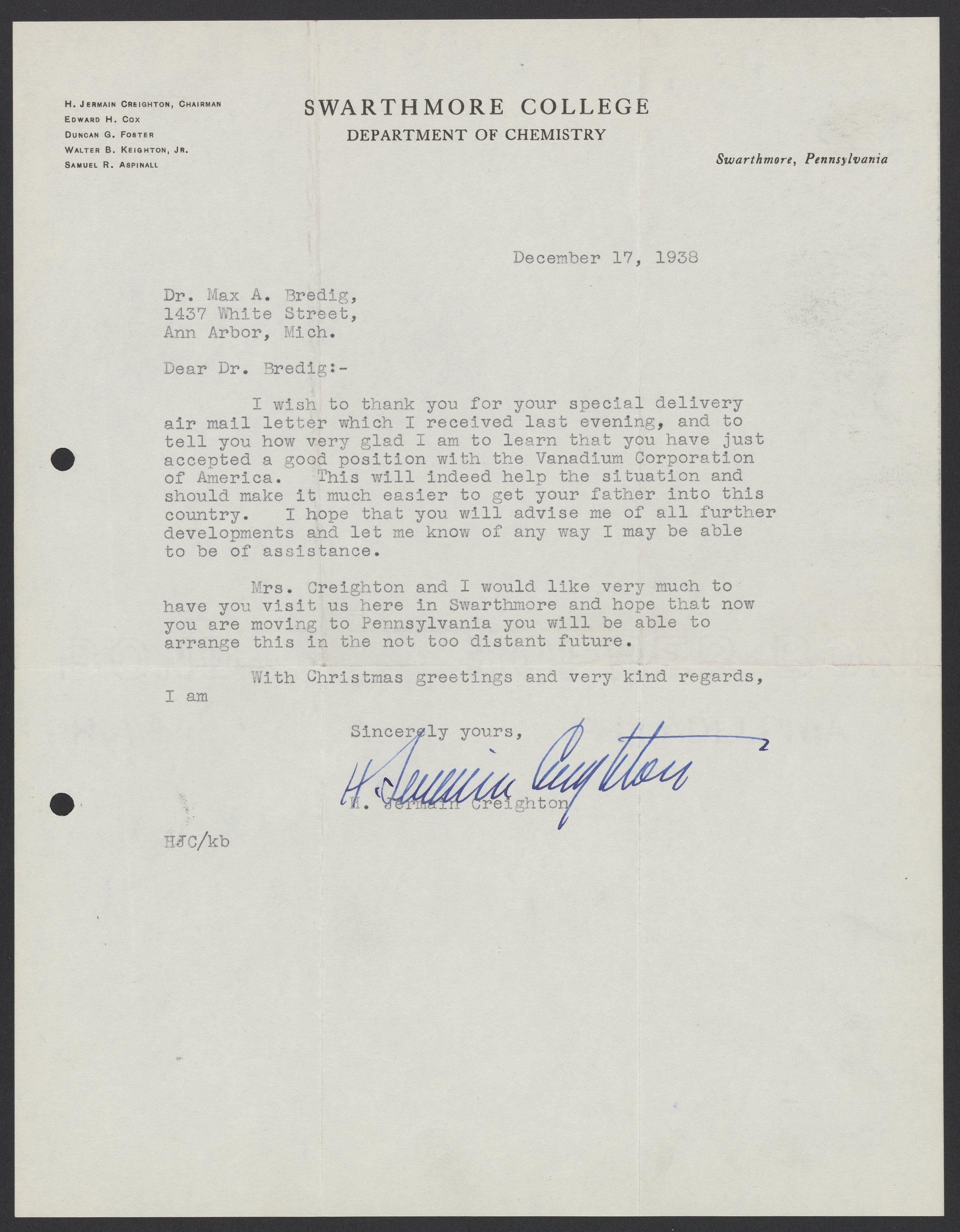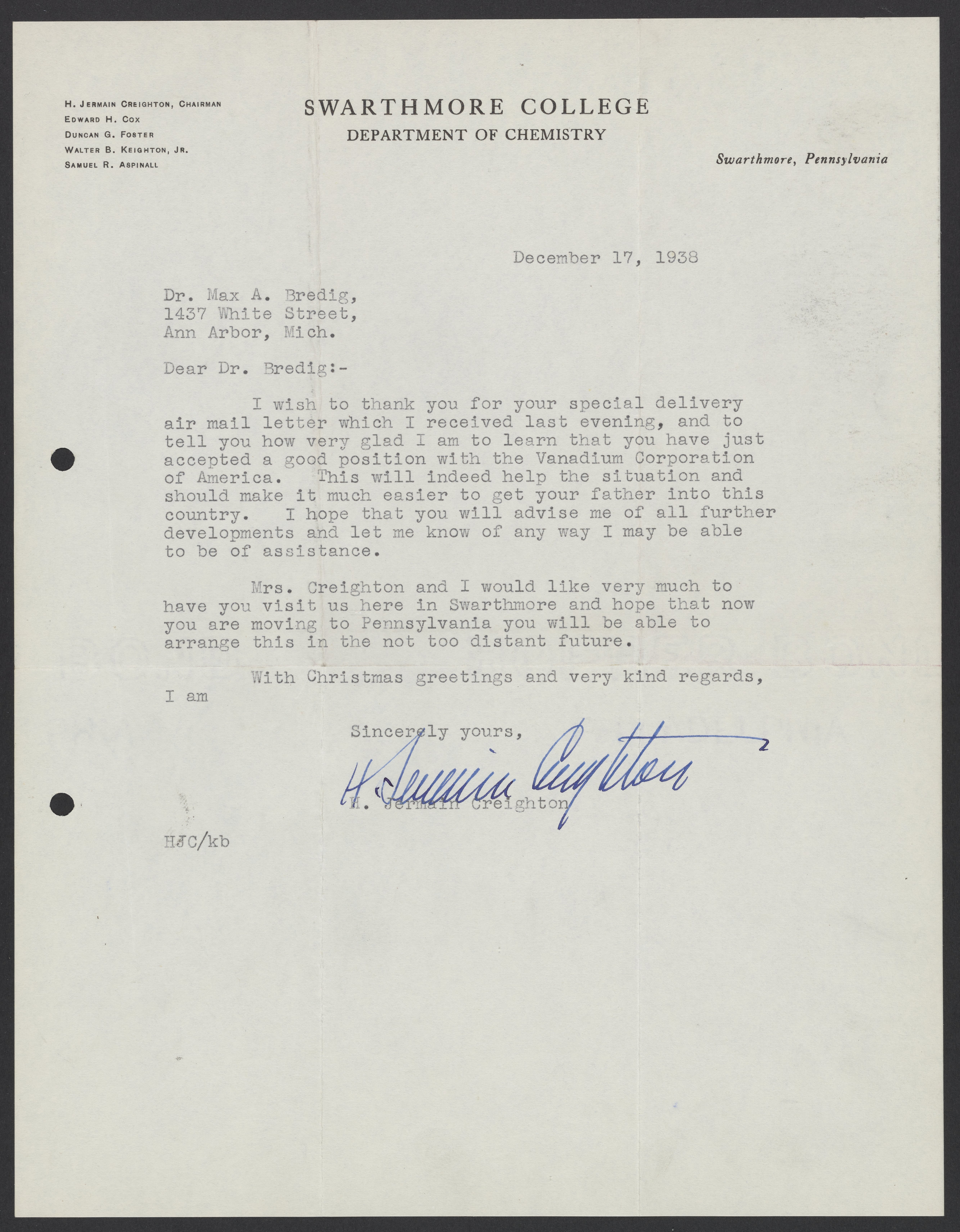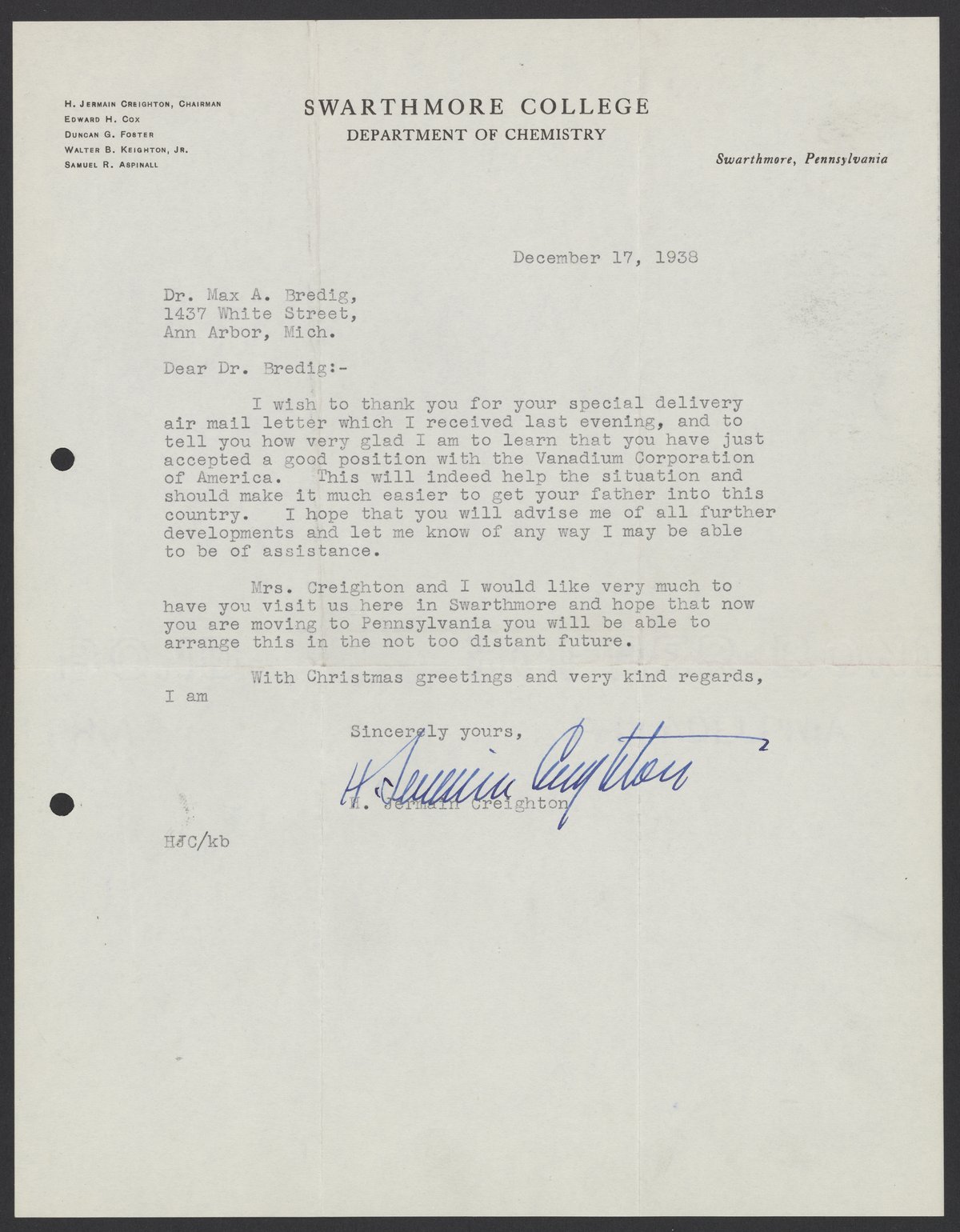 Letter from H. Jermain Creighton to Max Bredig, December 17, 1938