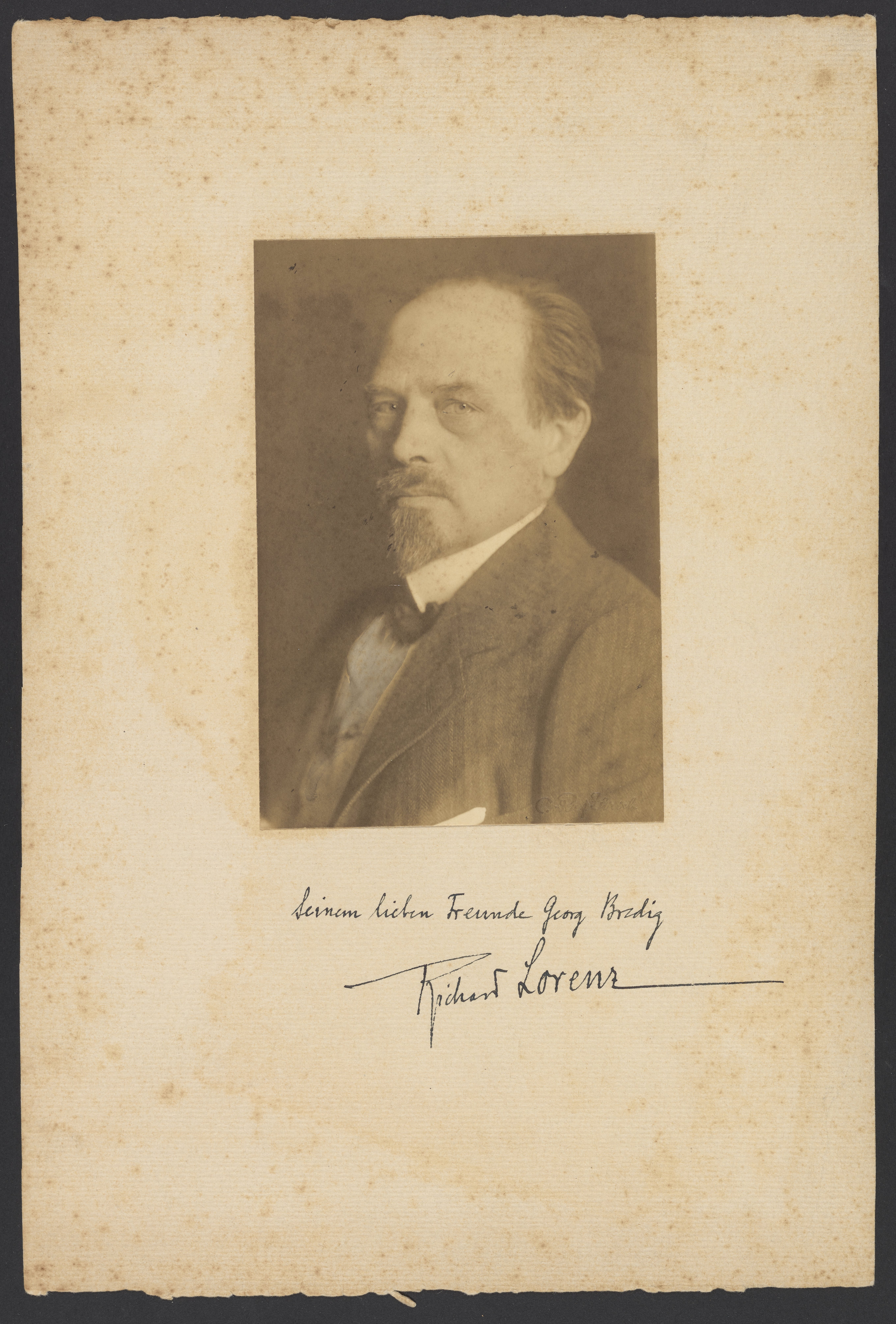 Richard Lorenz (1863-1929), an Austrian physical chemist, presents a signed portrait to his colleague, Georg Bredig (1868-1944). Lorenz was a professor of chemistry at the Eidgenössische Polytechnikum in Zurich, Switzerland and the University of Frankfurt am Main. He is recognized for his work on the electrochemical behavior of molten salts.