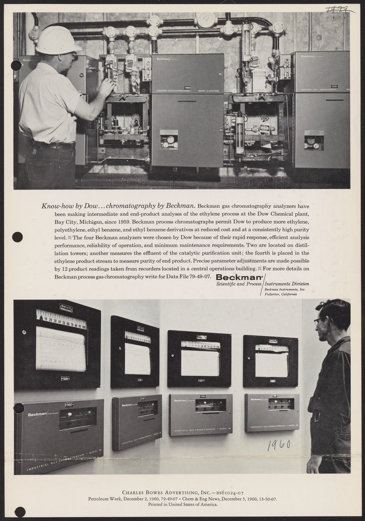 Advertisement for Beckman Instruments gas chromatographs being used at the Dow Chemical plant in Bay City, Michigan.