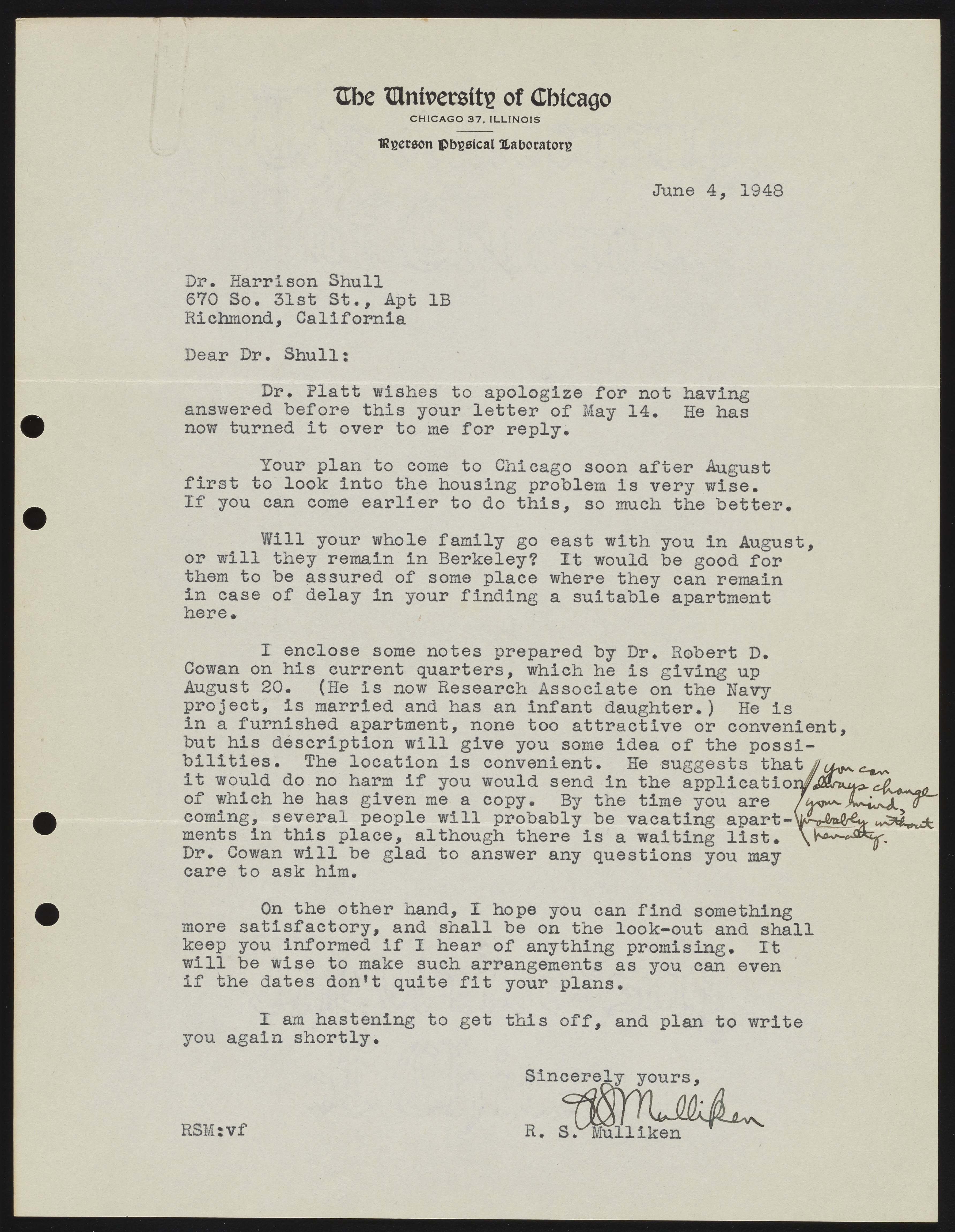 Letter between Robert S. Mulliken and Harrison Shull, American quantum chemists, concerning living arrangements for Shull in Chicago.