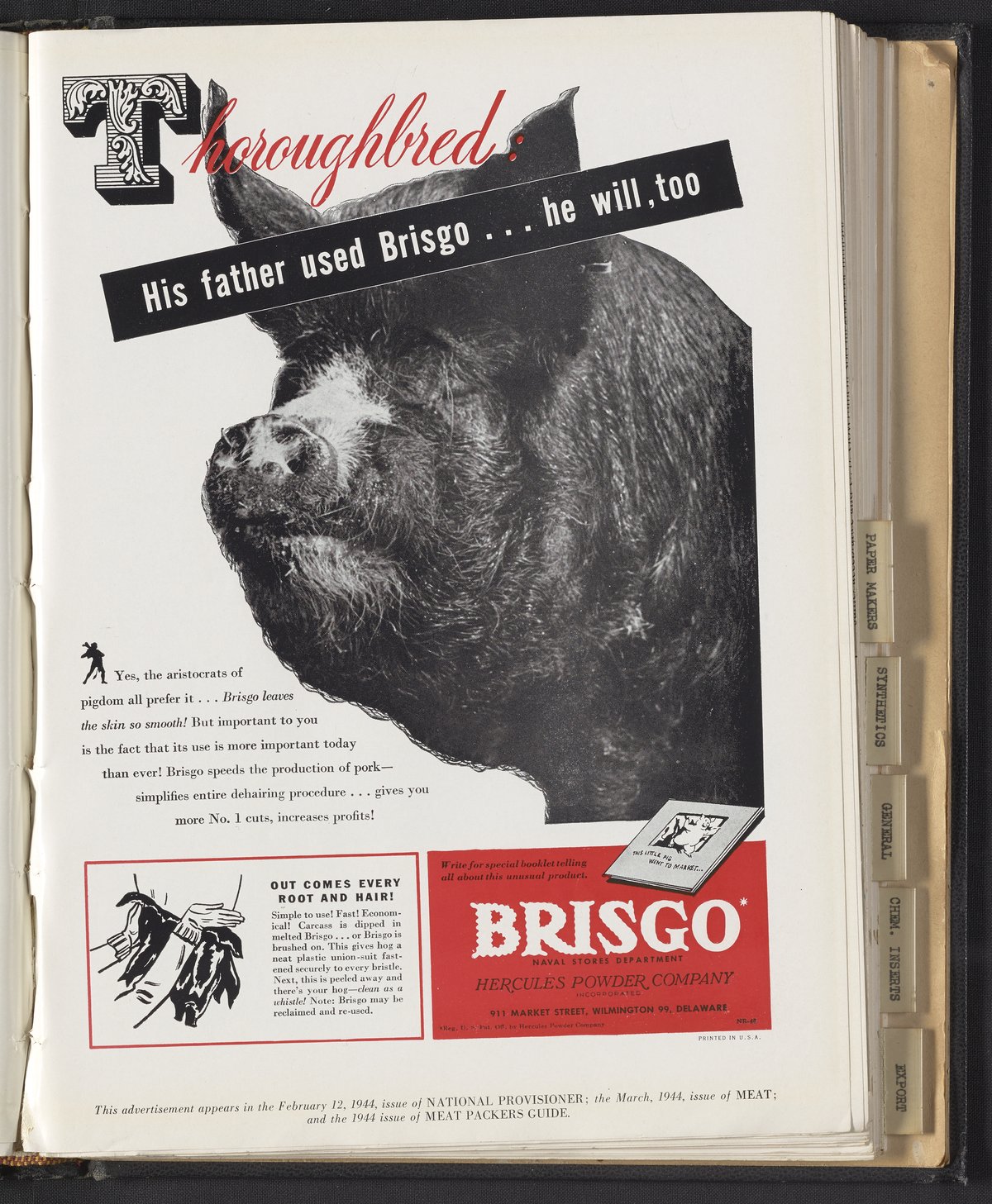 Advertisement for Brisgo, a trademarked depilatory compound manufactured and sold by the Hercules Powder Company for the cosmetic removal of hair from hog skin. Formed in 1912 as part of an anti-trust settlement with DuPont, the Hercules Powder Company (later Hercules Inc.) initially specialized in the manufacture of explosives and smokeless powders and subsequently diversified its business to encompass a variety of industrial products, including pine and paper chemicals, synthetics, pigments, polymers, and cellulose.