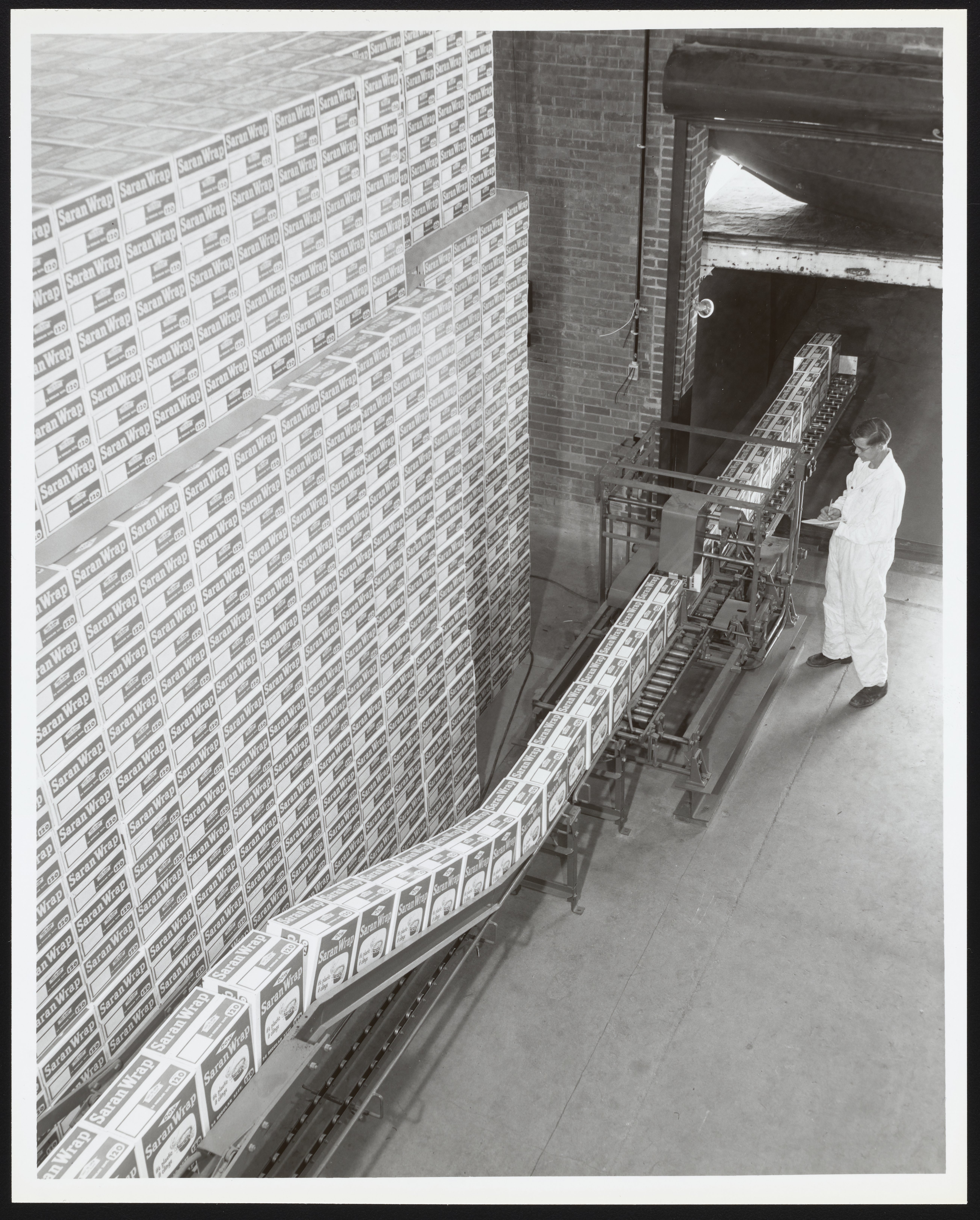 Elevated view of a conveyor belt transporting boxes of Saran Wrap at a Dow Chemical Company manufacturing facility in Midland, Michigan. Initially developed for the U.S. Army to wrap arms and equipment for transport during World War II, saran plastic was subsequently developed and marketed as Saran Wrap for household use. The employee visible in the photograph is unidentified.
