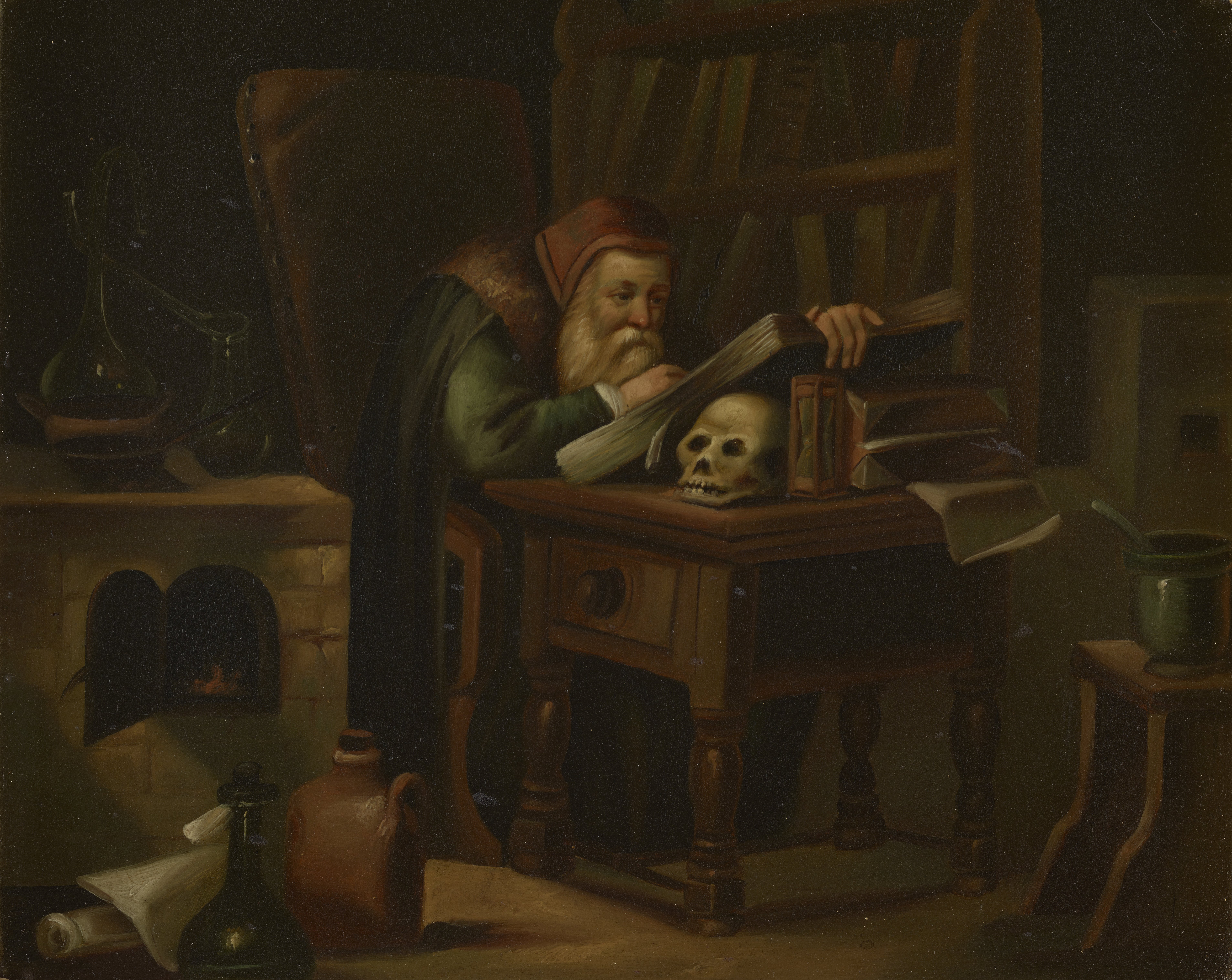 Alchemist at work (with book resting on skull)