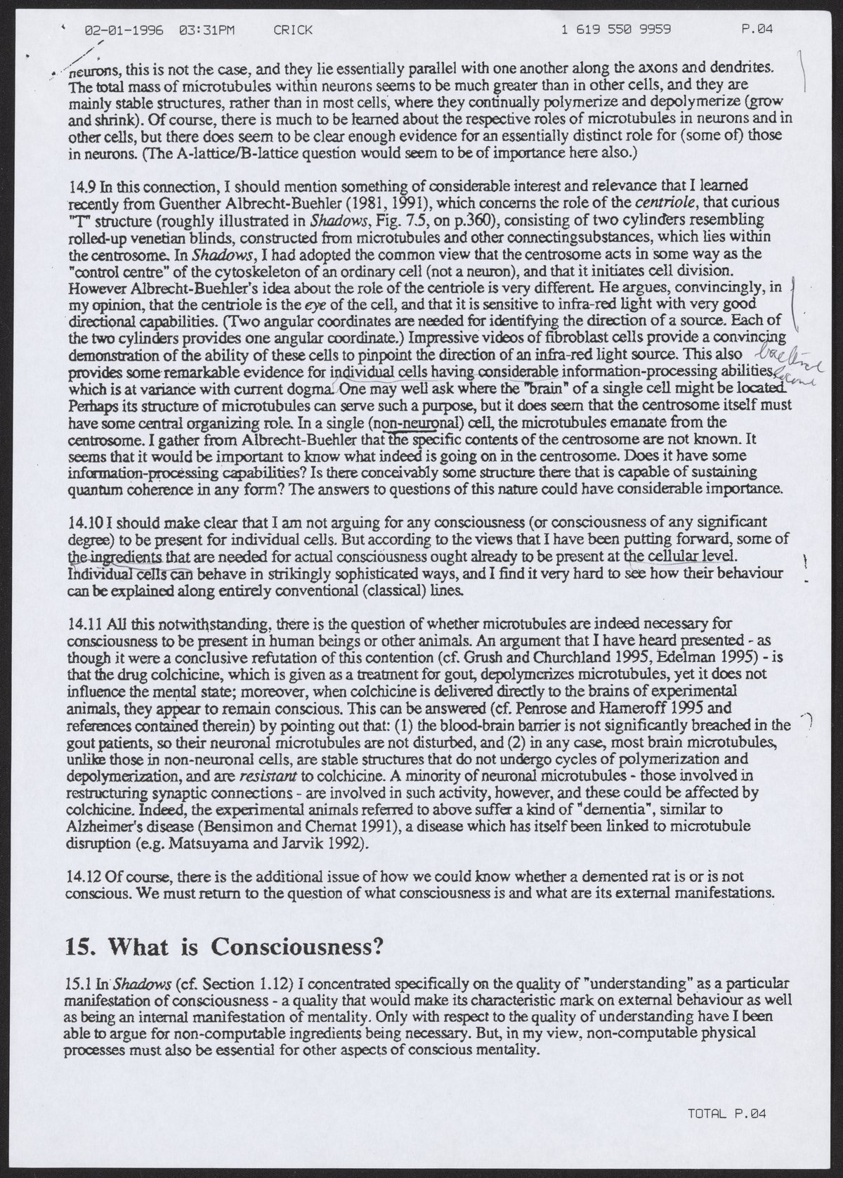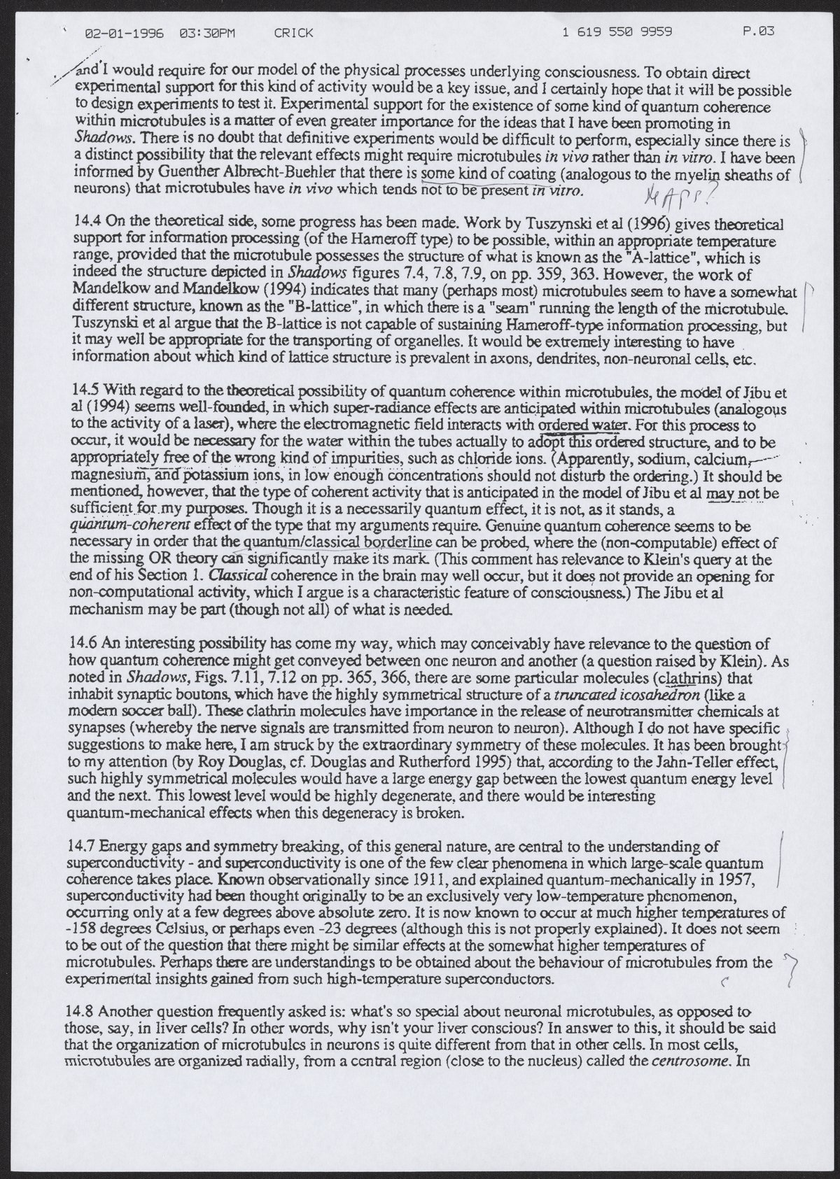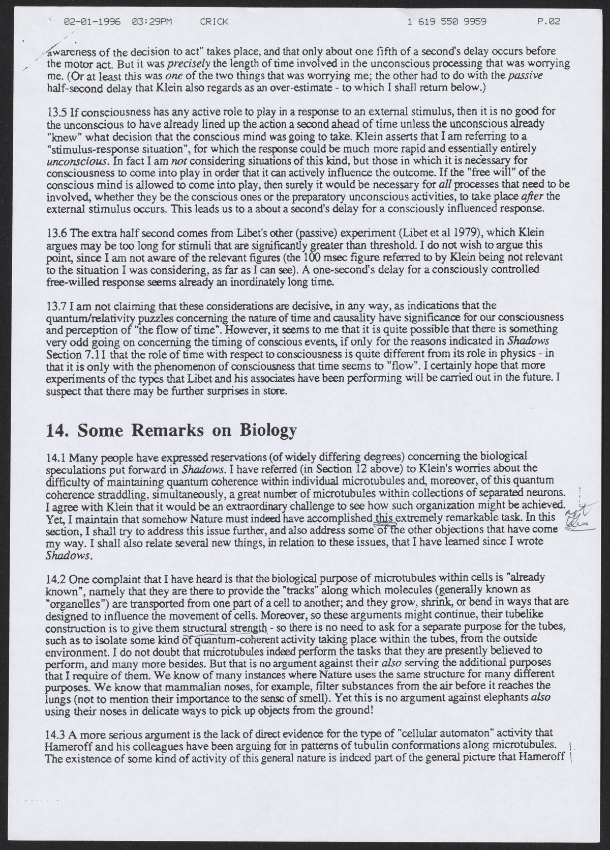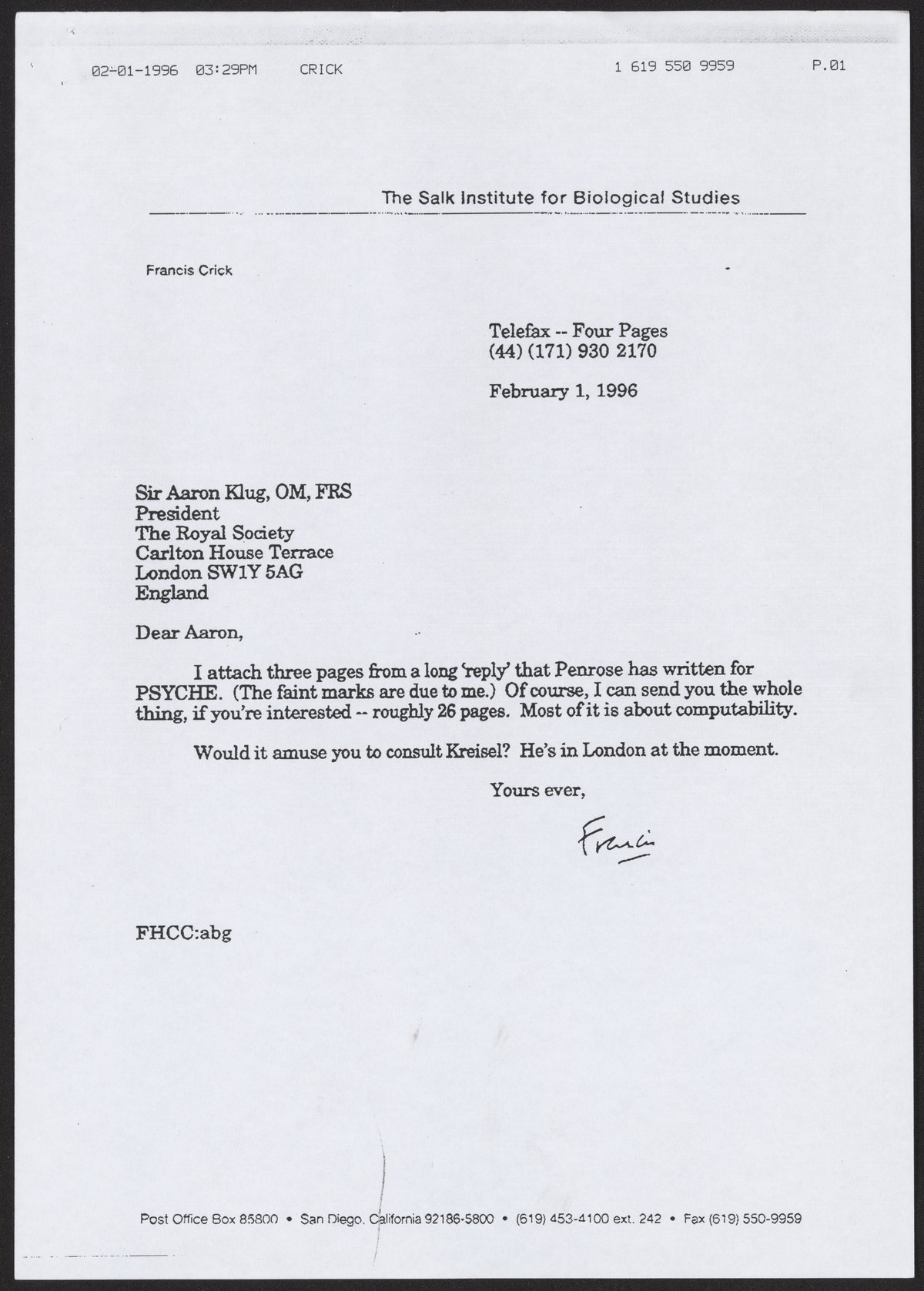 Fax from Francis Crick to Aaron Klug, February 1, 1996