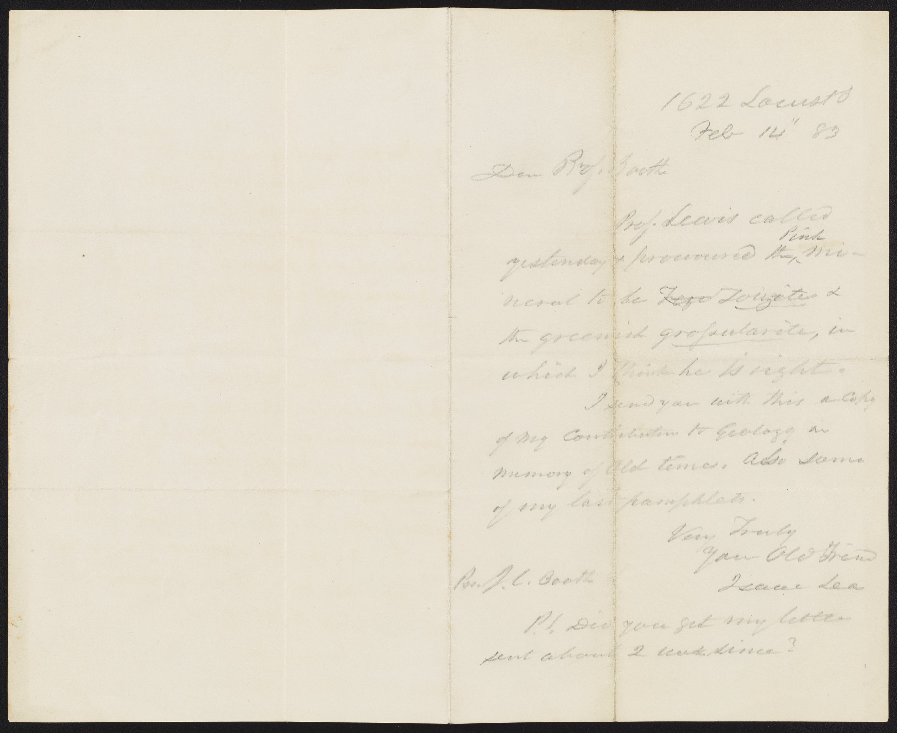 Letter from Isaac Lea to James Curtis Booth, February 14, 1883