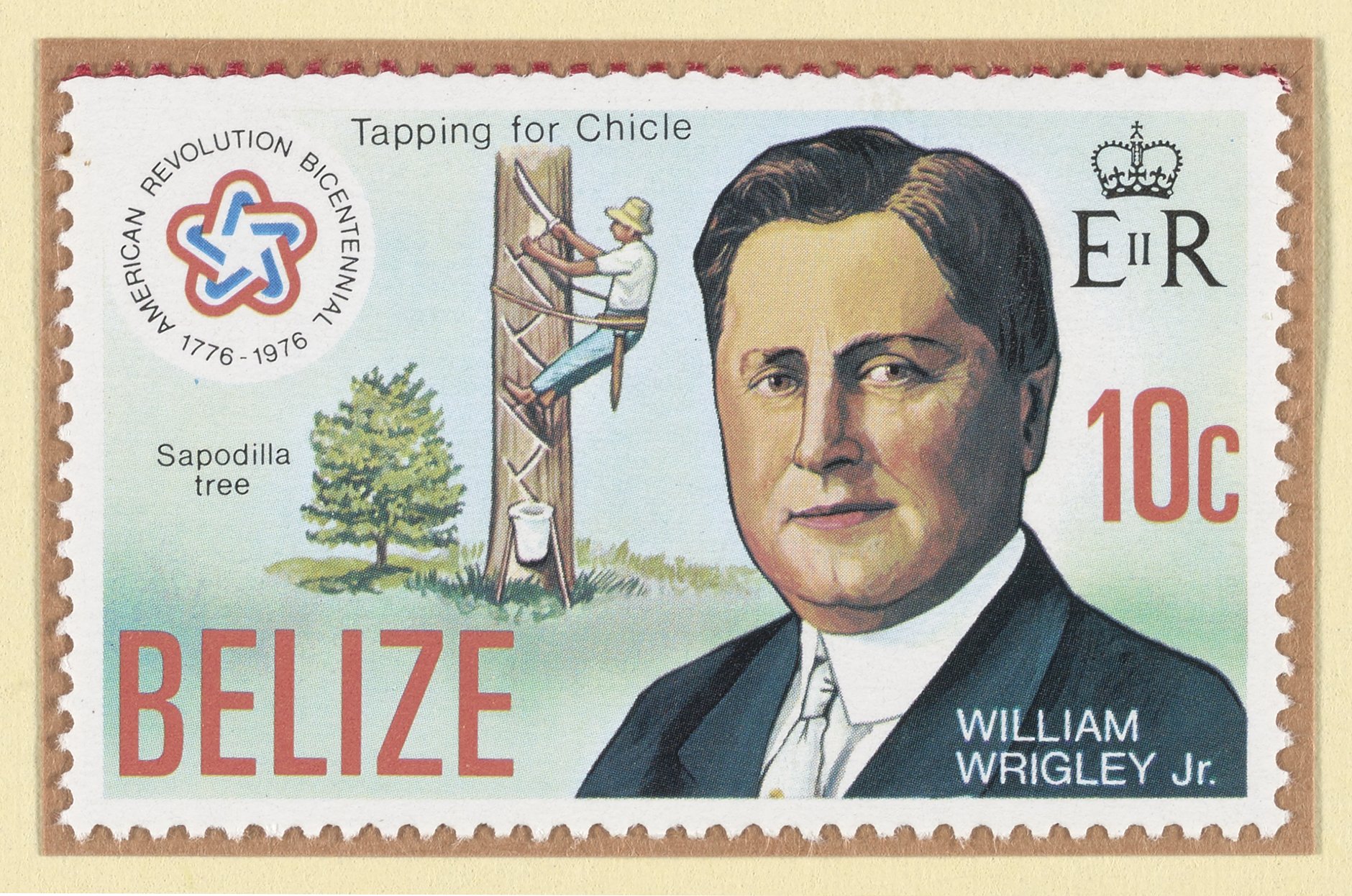 Depicts William Wrigley Jr., as well as a worker tapping a sapodilla tree, which was used to manufacture bubble gum. Includes the bicentennial logo of the American Revolution.