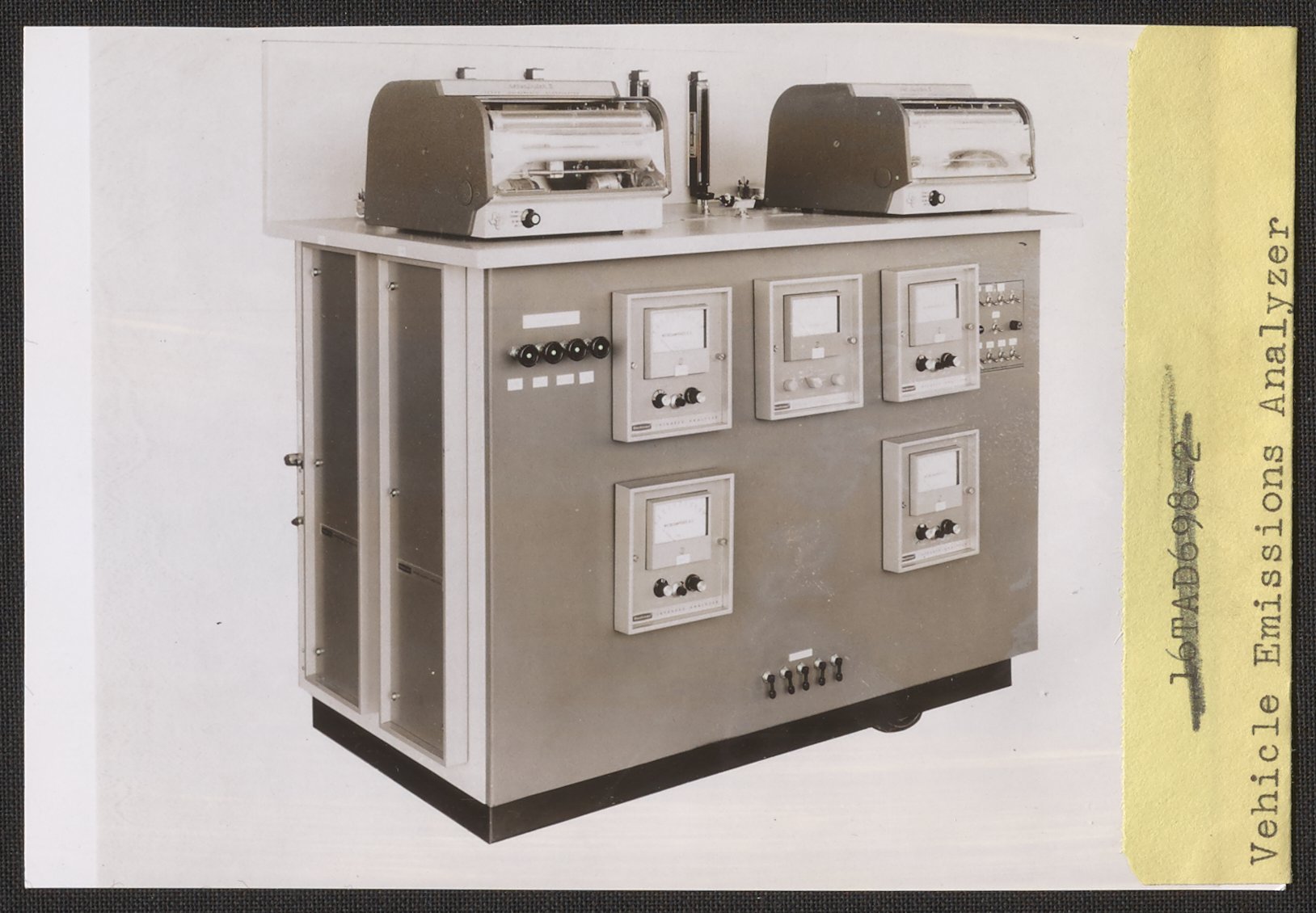 Dietrich, T. A. “Beckman Vehicle Emission Analyzer,” n.d. Beckman Historical Collection, Box 84. Science History Institute. Philadelphia. https://digital.sciencehistory.org/works/r494vk42v.