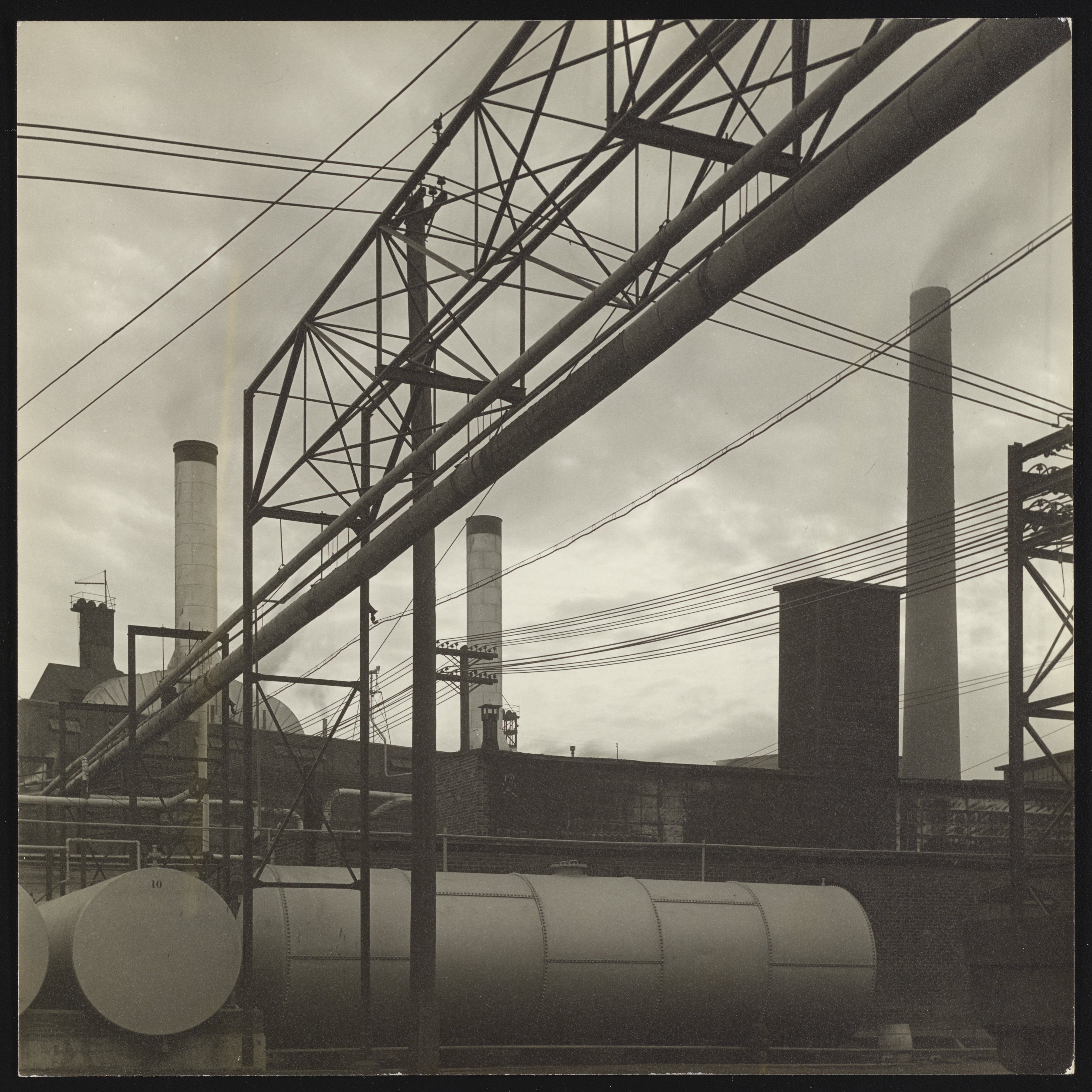 General view of a section of the exterior of the Cliffs Dow wood distillation plant located in Marquette, Michigan. Seeking a source of raw material for its new plastic, ethylcellulose, the Dow Chemical Company joined with the Cleveland-Cliffs Iron Company to form the Cliffs Dow Chemical Company in April 1935. The Cliffs Dow plant in Marquette primarily produced charcoal used in the manufacture of pig iron, as well as a range of chemical by-products including acetic acid, calcium acetate, wood alcohol, and ethyl alcohol. Notably, when the Marquette plant ceased operations in 1969, it was the last wood distillation plant in the United States.