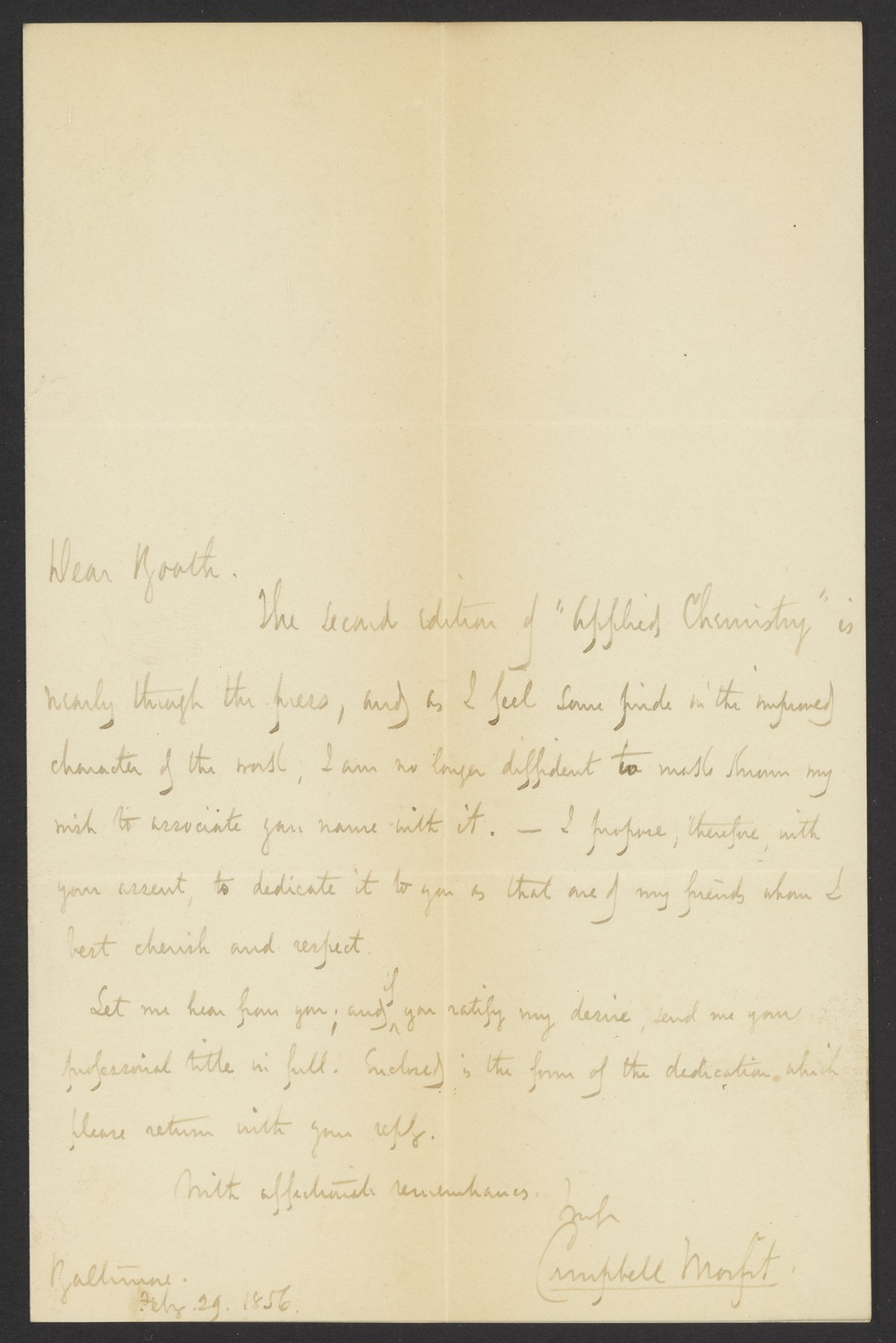 Small JPG1200 x 1798px — 171 KBFull-sized JPG2245 x 3363px — 523 KBOriginal fileTIFF — 2245 x 3363px — 21.7 MBCampbell Morfit (1820-1897), a distinguished chemist from the United States, co-editor with James Curtis Booth (1810-1888) of the Encyclopedia of Chemistry, mentions the impending publication of the second edition of Applied Chemistry in the Manufacture of Soaps and Candles and wishes to dedicate it to Booth.