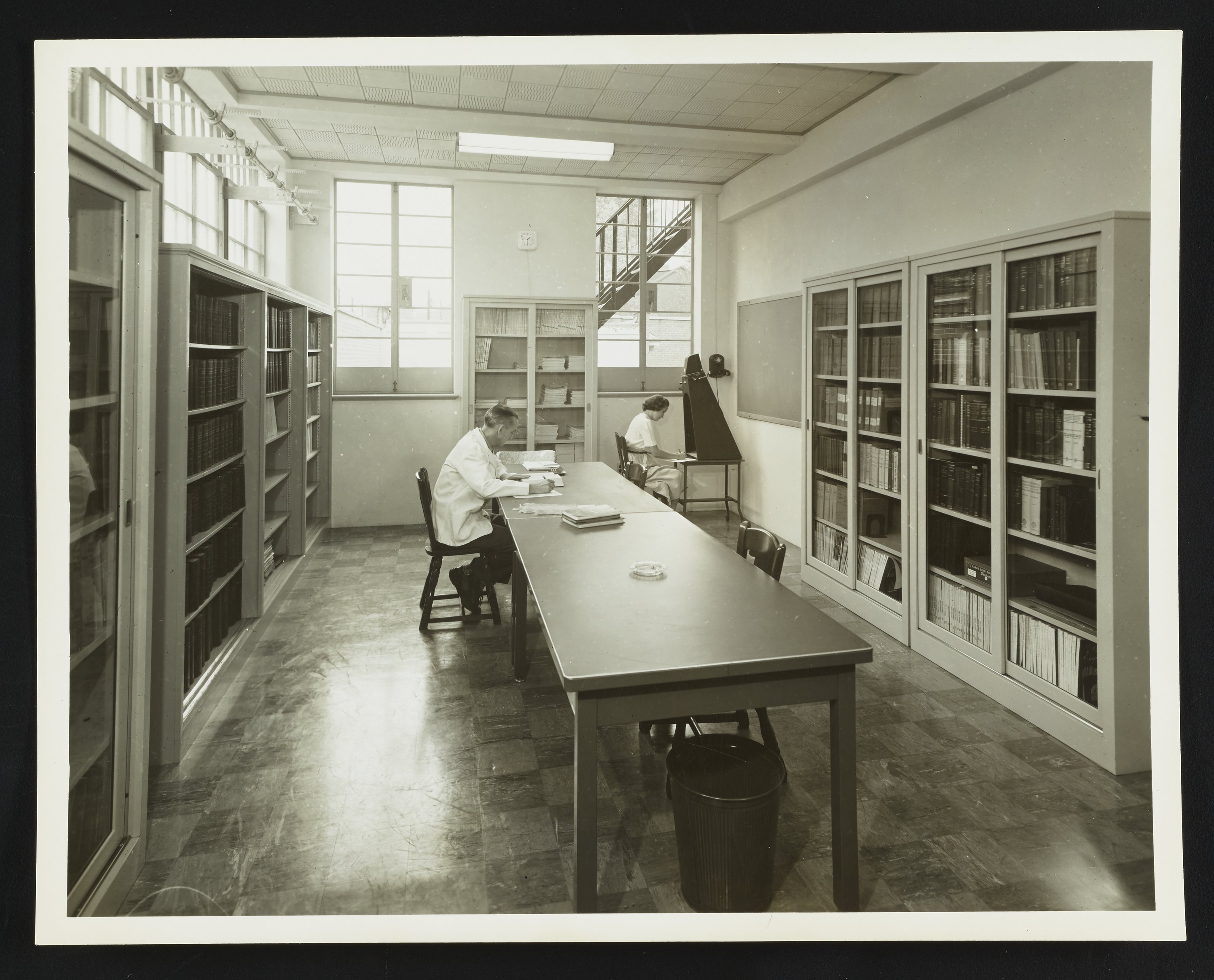 General view of the library at the Althouse Chemical Company Research facility in Reading, Pennsylvania. The two employees visible in the photograph are identified as George Garcelon and Norma Bodey.
