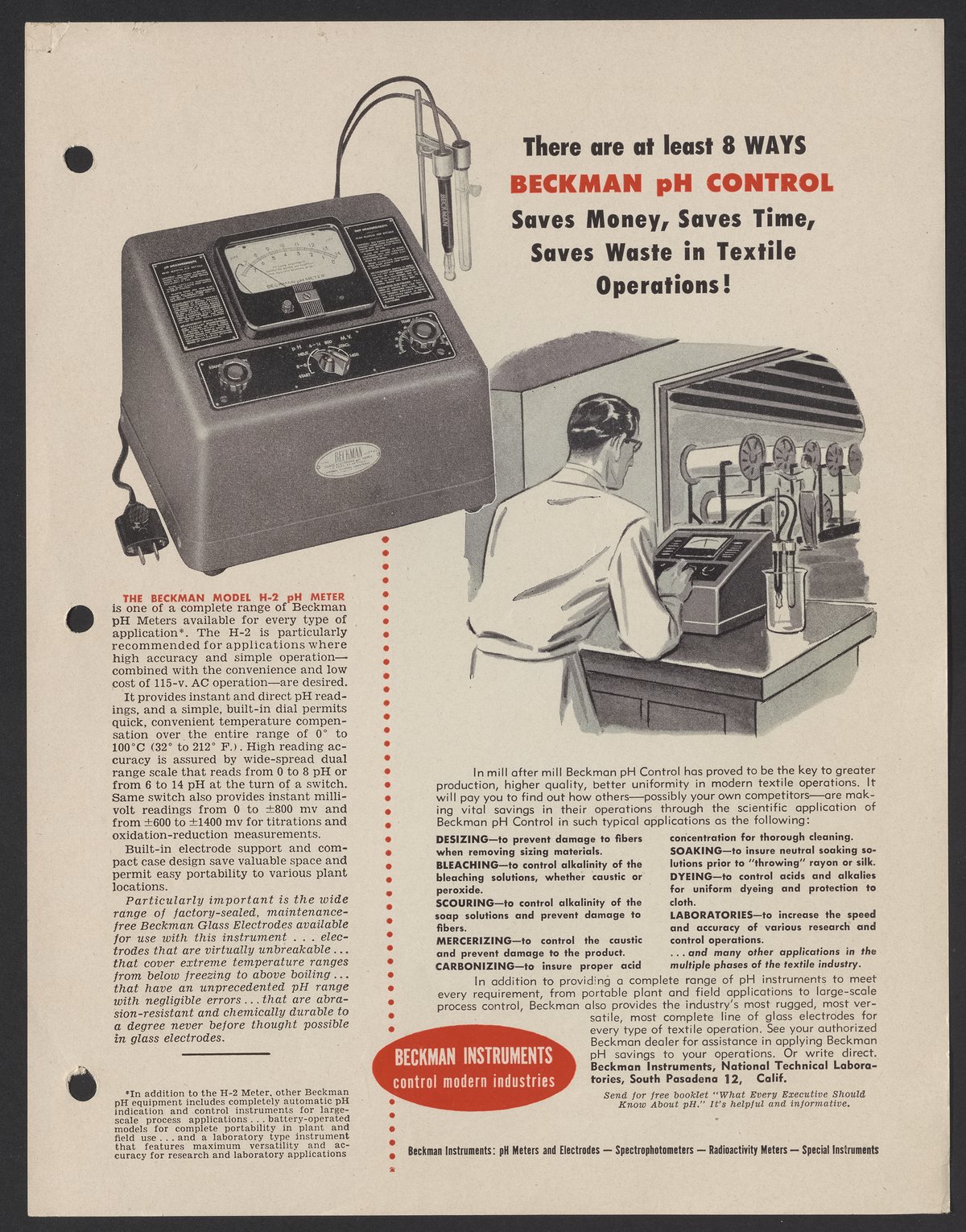 Beckman Instruments, Inc. “There Are at Least 8 Ways Beckman PH Control Saves Money, Saves Time, Saves Waste in Textile Operations!,” circa 1950. Beckman Historical Collection, Box 19, Folder 18. Science History Institute. Philadelphia. https://digital.sciencehistory.org/works/r781wg72t.