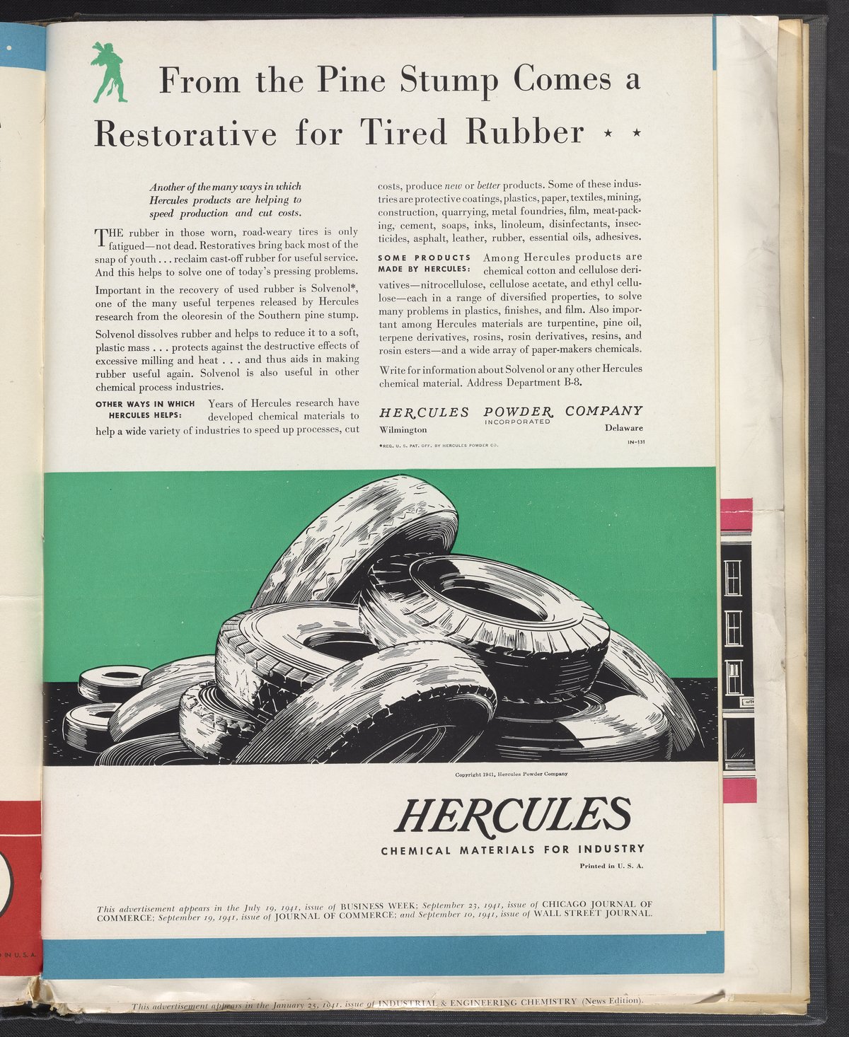 Hercules Incorporated. “From the Pine Stump Comes a Restorative for Tired Rubber...” 1941 Hercules Advertisements, 1941. Records of Hercules Incorporated, Volume 1941. Science History Institute. Philadelphia. https://digital.sciencehistory.org/works/r781wg75n.