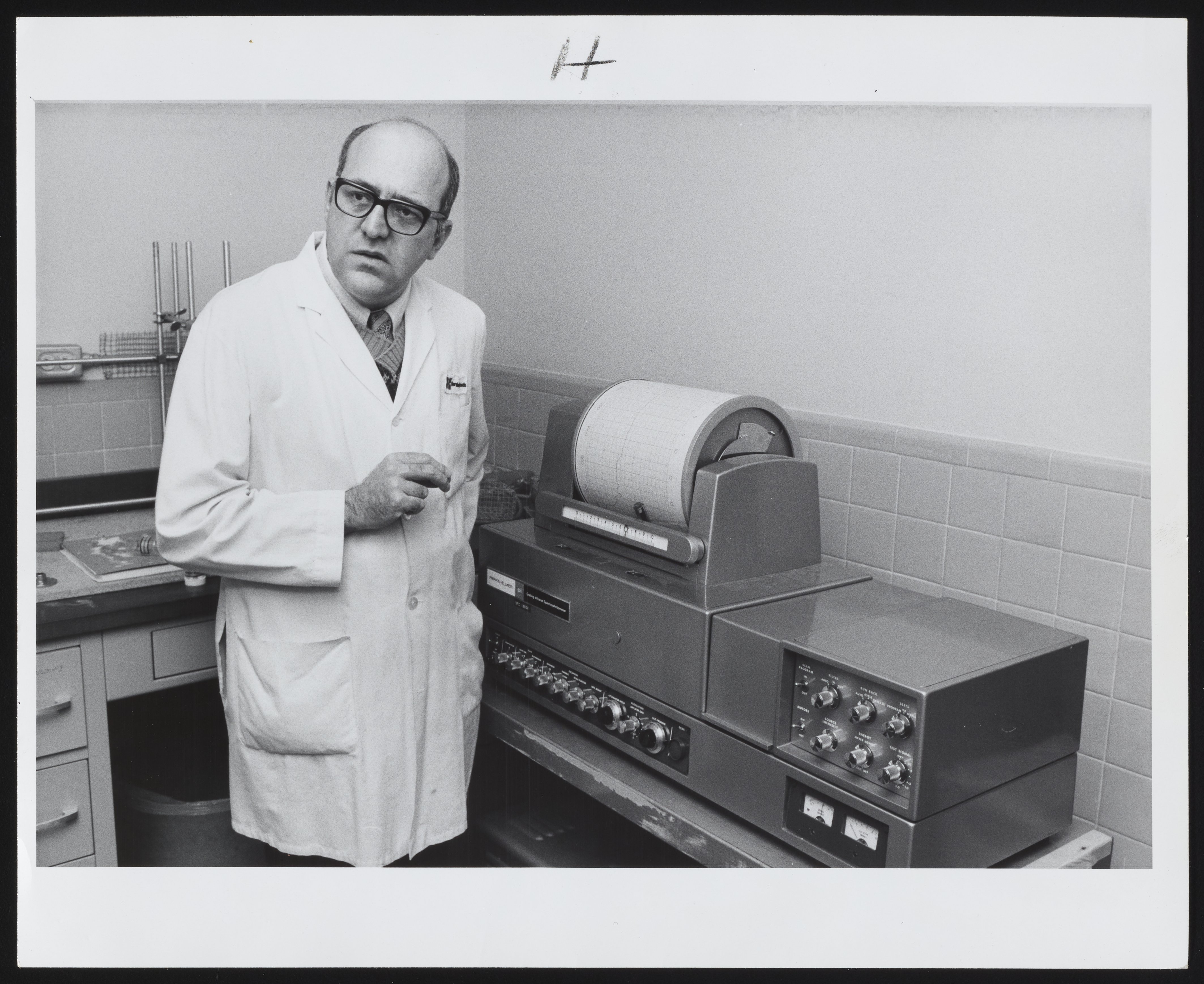 General view of Dr. Giovanni Bigalli posed with a Perkin-Elmer Grating Infrared Spectrophotometer at an unidentified laboratory facility. Per notations accompanying the photograph, this spectrophotometer is being used to analyze a sample of peanut oil, part of a series of flavor investigations undertaken by the Hershey Company using assorted Perkin-Elmer instruments.