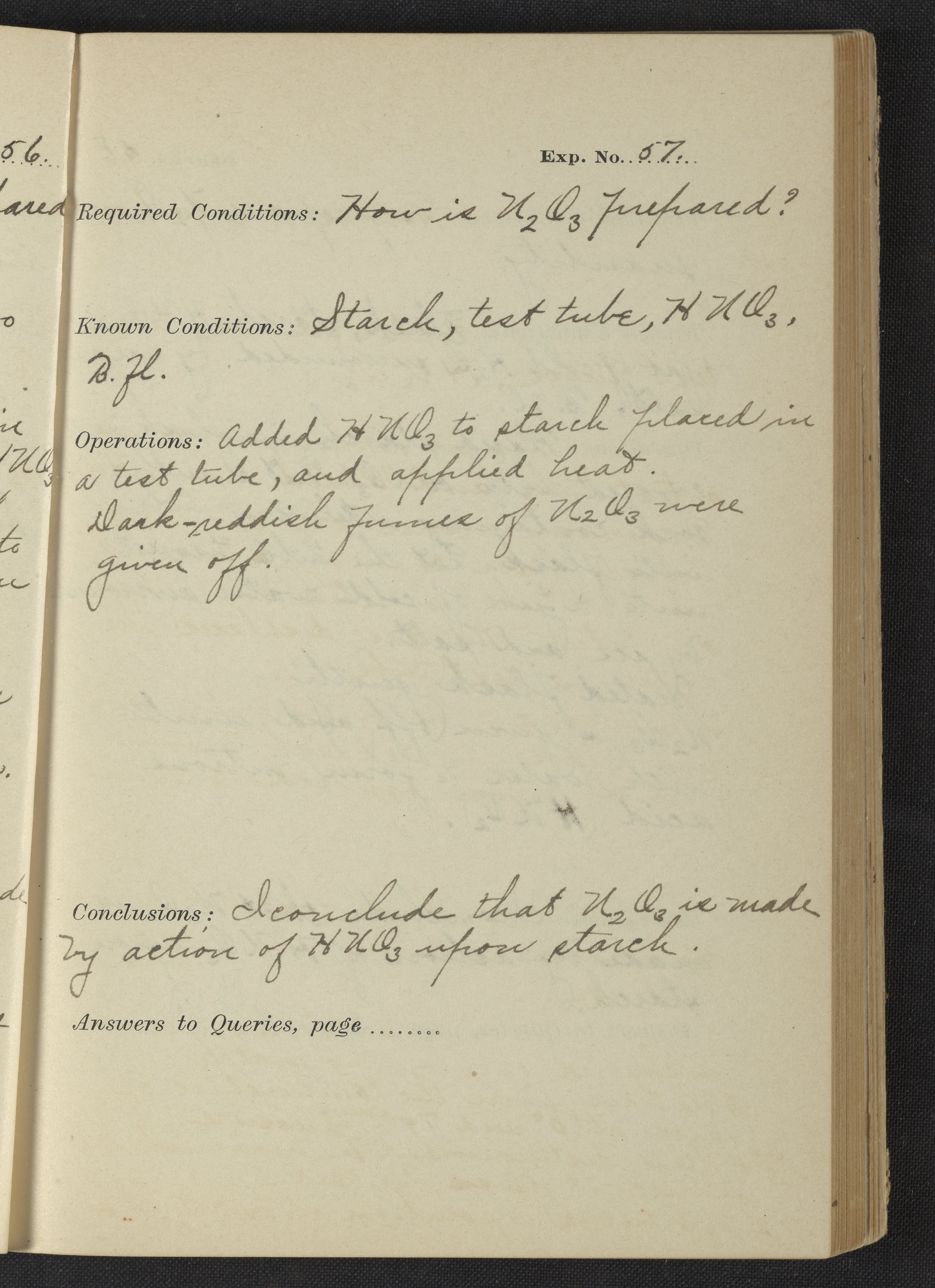 Small JPG1200 x 1664px — 491 KBLarge JPG2880 x 3994px — 2.2 MBFull-sized JPG3608 x 5004px — 3.1 MBOriginal fileTIFF — 3608 x 5004px — 51.7 MBLaboratory notebook used by Clara Esther Hartley during a high school-level chemistry class in Troy, Ohio. The notebook details approximately 115 experiments performed by Hartley, ranging from fundamental investigations such as "Is Wood an Element?," to more advanced concepts dealing with the production, decomposition, and solubility of carbon dioxide. Notably, miscellaneous notes at the end of the volume include an analysis of drinking water drawn from the well of a local resident. In her analysis, Hartley notes sources of pollution and finds traces of chloride and nitrates in excess of 425 mg, leading her to conclude "This water is to [sic] foul to be used for drinking."
