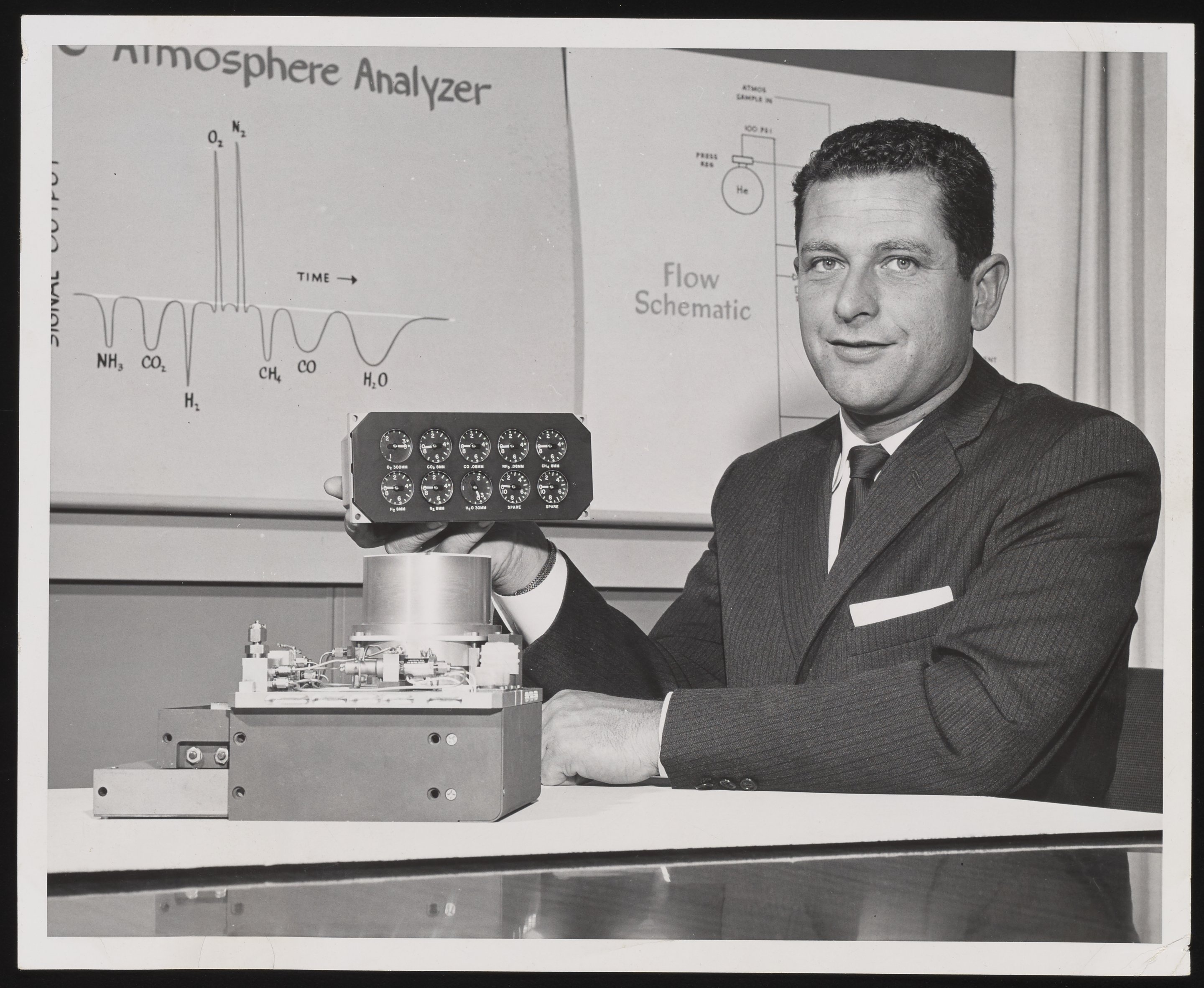 Frey Photos. “Walter Donner with Apollo Atmosphere Analyzer System,” 1962. Beckman Historical Collection, Box 59, Folder 11. Science History Institute. Philadelphia. https://digital.sciencehistory.org/works/rb68xb881.