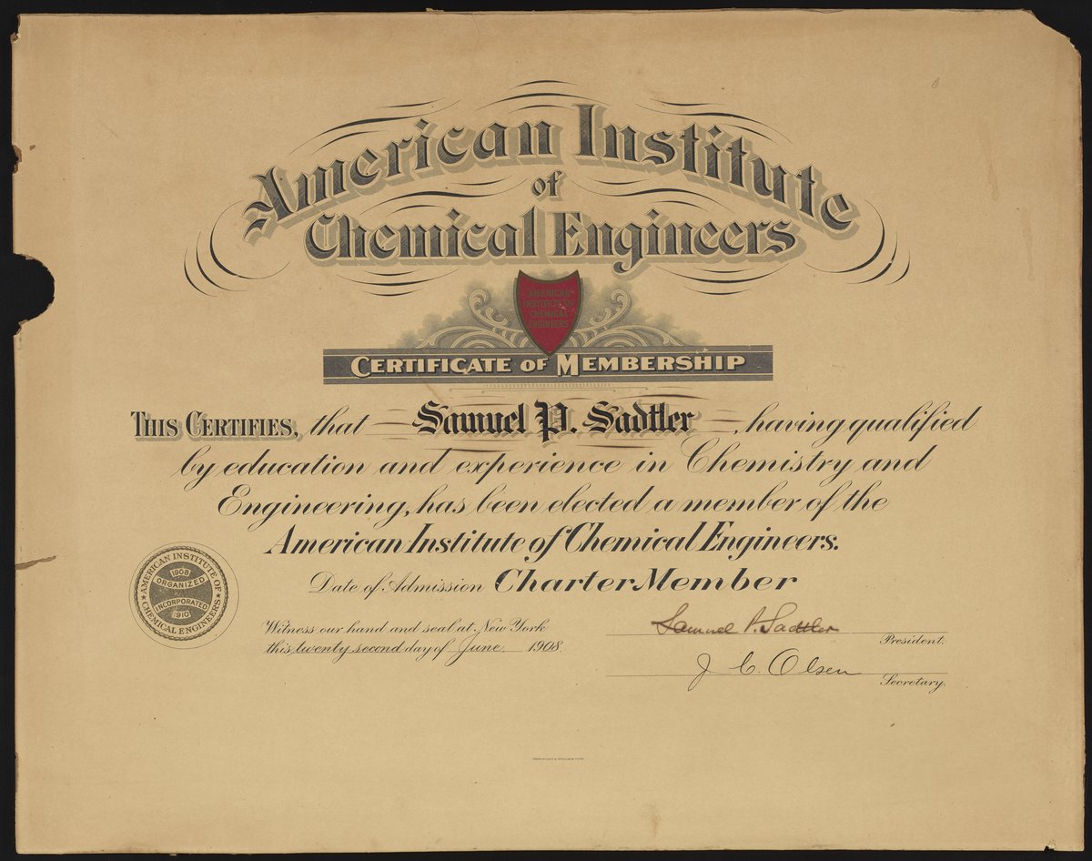 Certificate of Membership for Samuel P. Sadtler to the American Institute of Chemical Engineers