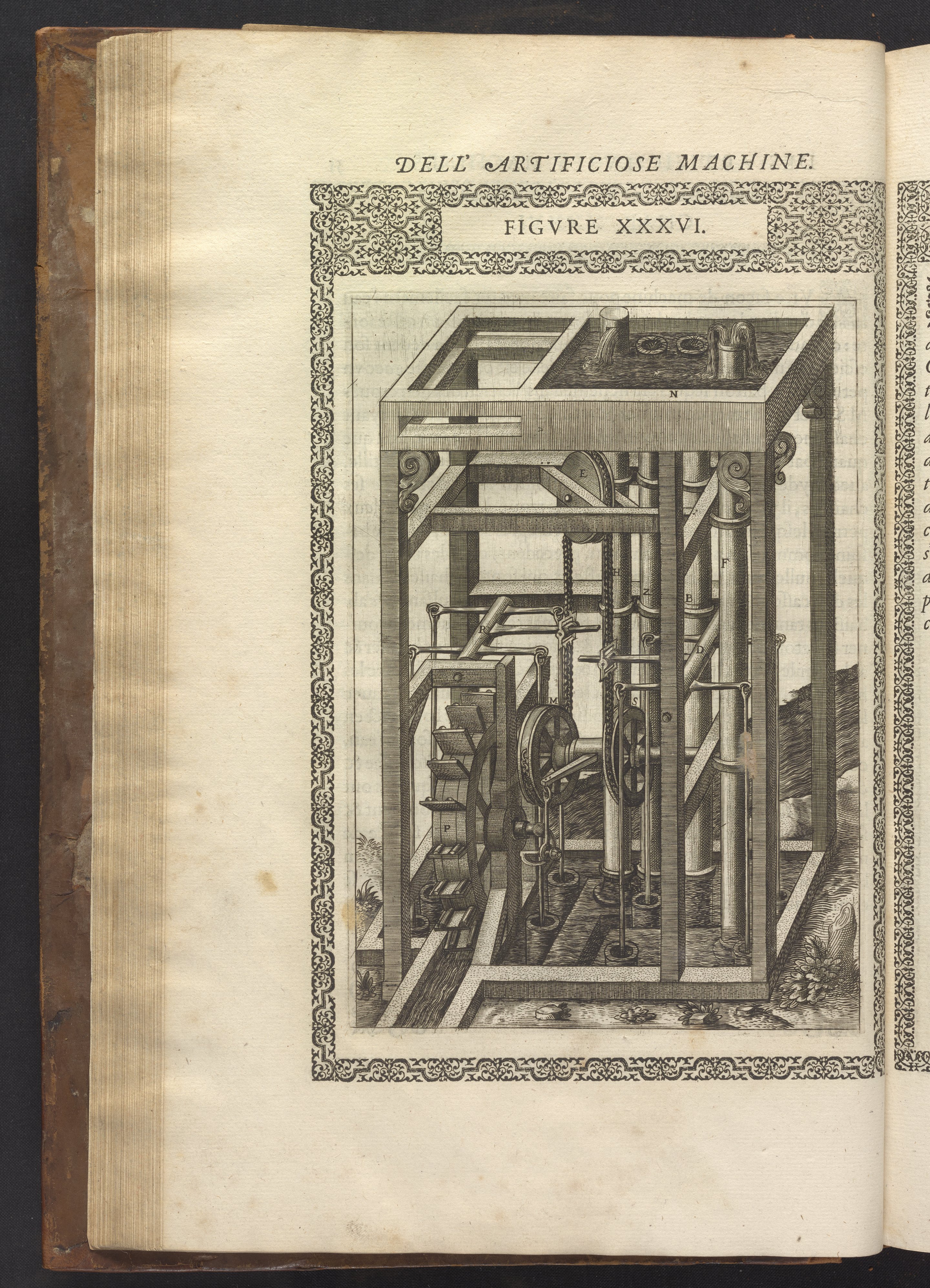 Ramelli, Agostino. “Plate 36: Device for Raising Water from a Low Place by River Current.” In Le Diverse Et Artificiose Machine Del Capitano Agostino Ramelli. Paris, France, 1588. https://digital.sciencehistory.org/works/rb68xc11m.