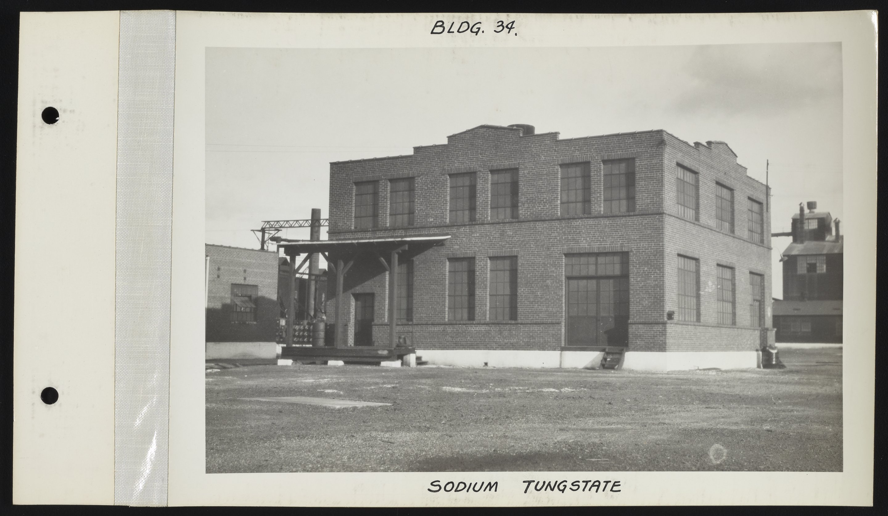 Exterior view of the sodium tungstate manufacturing facility (Building 34) at the Charles Lennig and Company chemical manufacturing plant in Bridesburg, a neighborhood located along the Delaware River in the Northeast section of Philadelphia, Pennsylvania. Charles Lennig and Company operated as a subsidiary of the Rohm and Haas Company, an international chemical company headquartered in Philadelphia, from 1920 to 1947.
